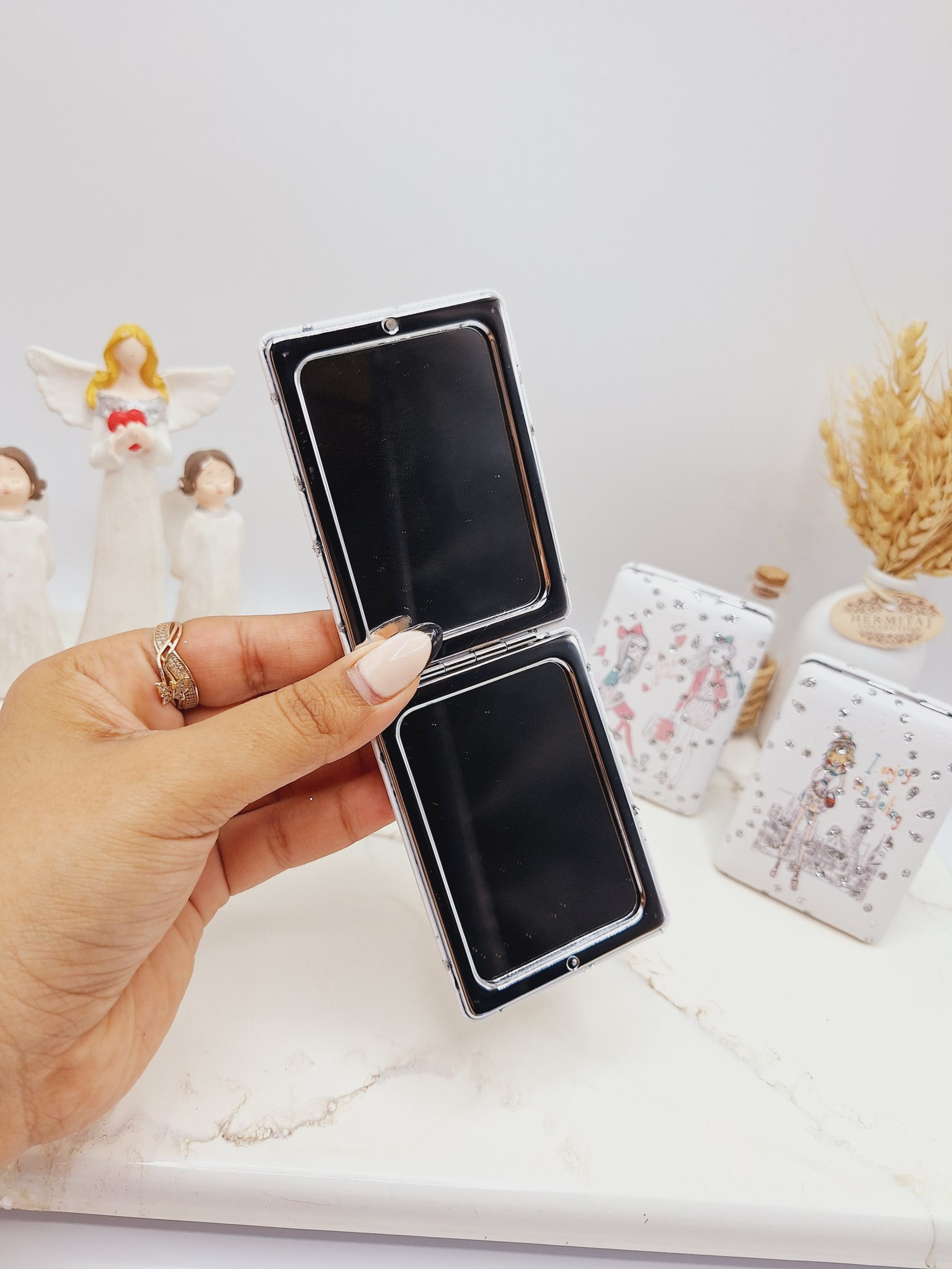 این آینه تاشو به صورت کتابی باز و بسته شده آینه های ساده و مقهر قرار گرفته شده درون هر درب آن کمک میکنند تا تصویری عادی با با بزرگنمایی کلی از صورت خود را به هنگام آرایش مشاهده نمائید آئینه مقعر مناسب برای آن دسته از افرادی است که تمایل دارند جزئیات صورت را دقیق تر و راحت تر ببینند و یا ناچار به استفاده از عینک هستند طراحی شده است که با بزرگنمایی تصویر به آرایش هرچه بهتر و دقیق تر صورتتان کمک خواهد کرد. 🔥😍 آینه جیبی شیک هدیه ای مناسب و دوست داشتنی برای دختر خانم های خوش سلیقه می باشد.🥺🙈