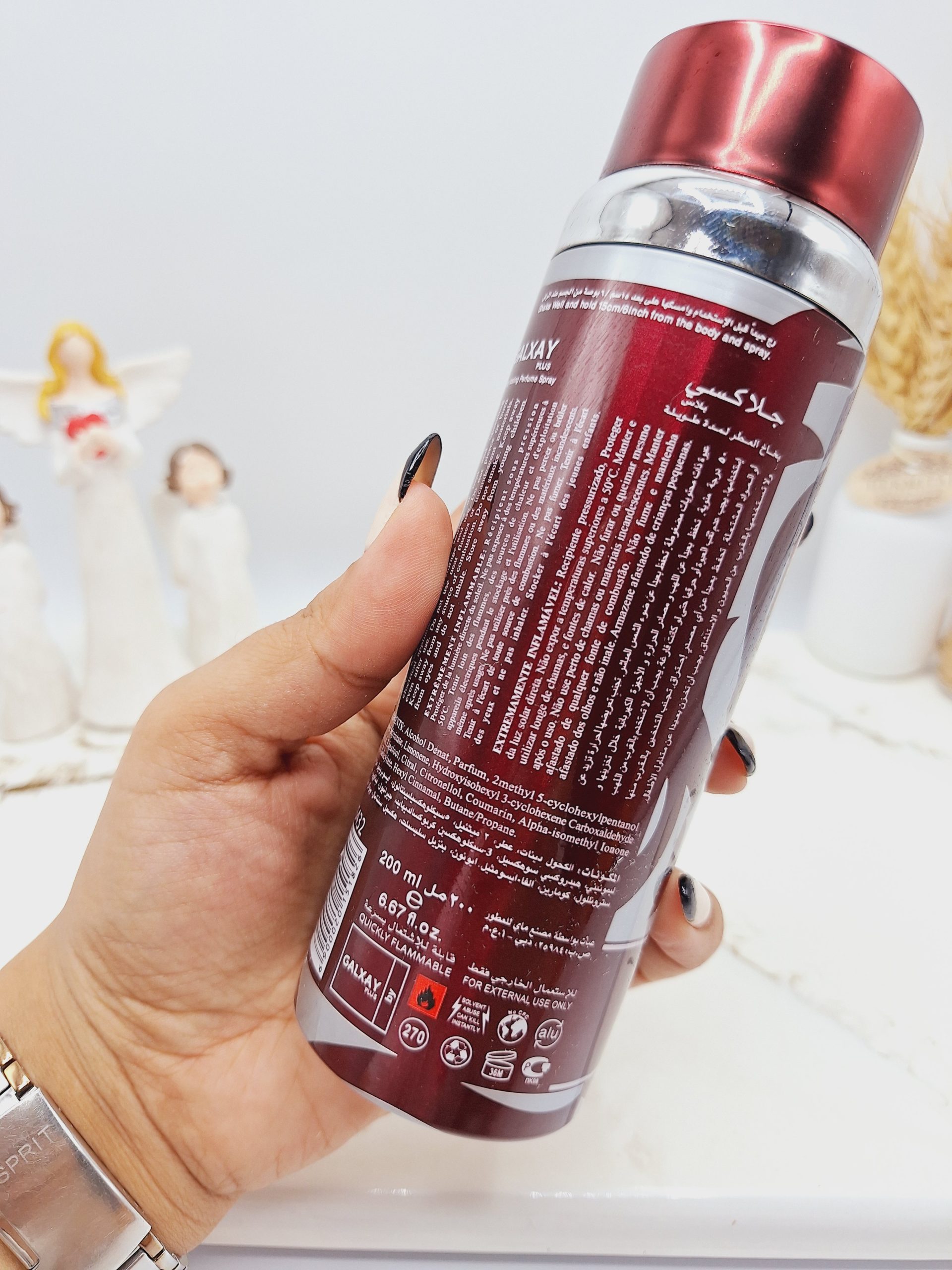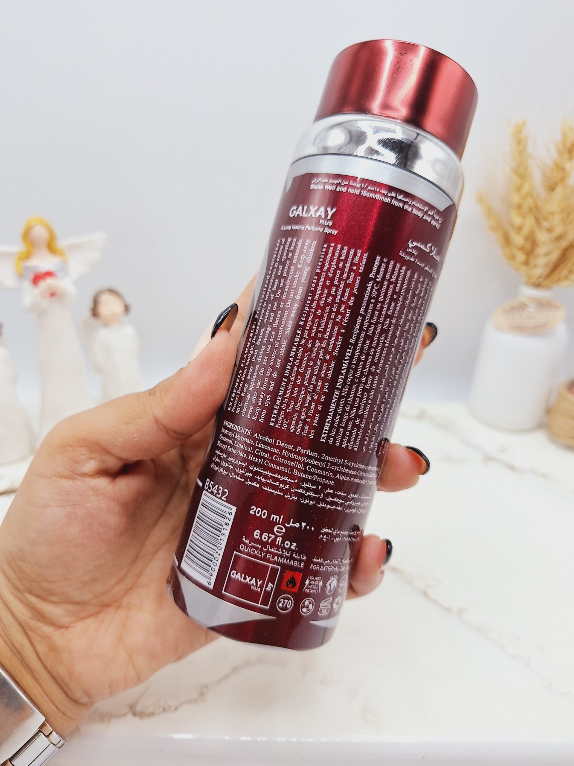 اسپری های خوشبوکننده گلکسی مناسب برای استفاده بر روی پوست و لباس شما می باشد اما در هر صورت بهتر است که از اسپری های خوشبو کننده بر روی پوست بدن استفاده نکنید مگر از نوع ضد عرق آن باشد. اسپری های خوشبوکننده گلکسی دارای ماندگاری بسیار بالا است زیرا از مواد بسیار عالی و با کیفیت تهیه شده و به دلیل سری مناسب آن پخش بوی بسیار متناسبی را دارد حجم : 200 میل با ماندگاری بالا با رایحه های خوشبو تولید : امارات