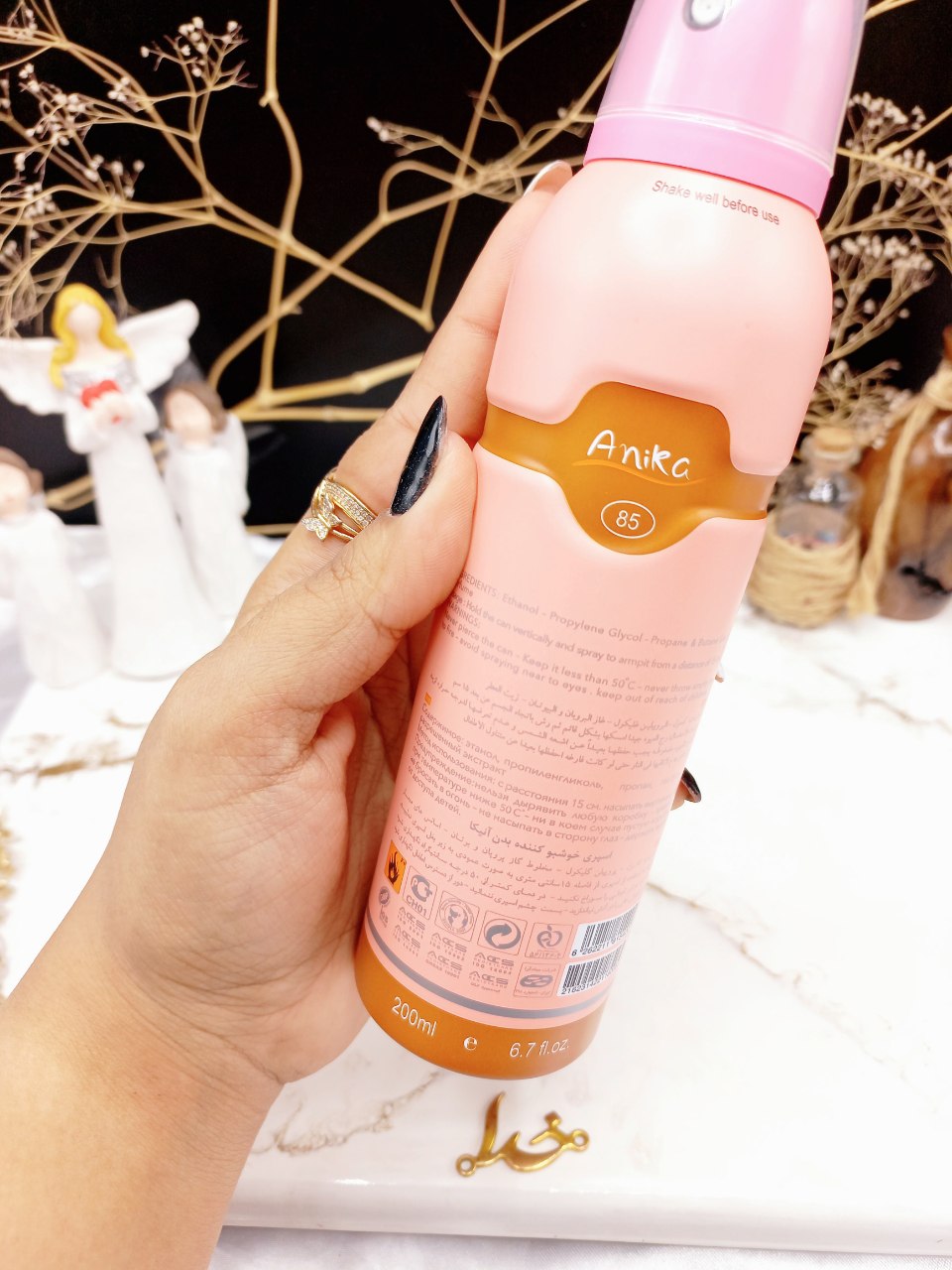 این اسپری کیفیت بالایی دارد؛ زیرا هیچگونه مواد شیمیایی برای آن استفاده نشده است؛ همچنین در ترکیبات آن روغنها، مرطوبکنندهها و ترکیبات طبیعی وجود دارند که موجب خوشبو و باطراوت شدن پوست میشوند. «آنیکا» (Anika) یک برند آرایشی بهداشتی و محصول کشور ایران است.