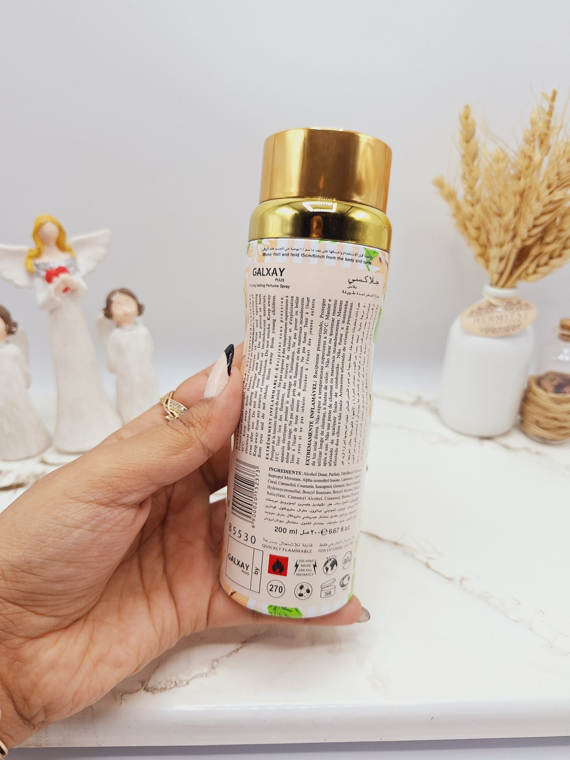 اسپری های خوشبوکننده گلکسی مناسب برای استفاده بر روی پوست و لباس شما می باشد اما در هر صورت بهتر است که از اسپری های خوشبو کننده بر روی پوست بدن استفاده نکنید مگر از نوع ضد عرق آن باشد. اسپری های خوشبوکننده گلکسی دارای ماندگاری بسیار بالا است زیرا از مواد بسیار عالی و با کیفیت تهیه شده و به دلیل سری مناسب آن پخش بوی بسیار متناسبی را دارد حجم : 200 میل با ماندگاری بالا با رایحه های خوشبو تولید : امارات