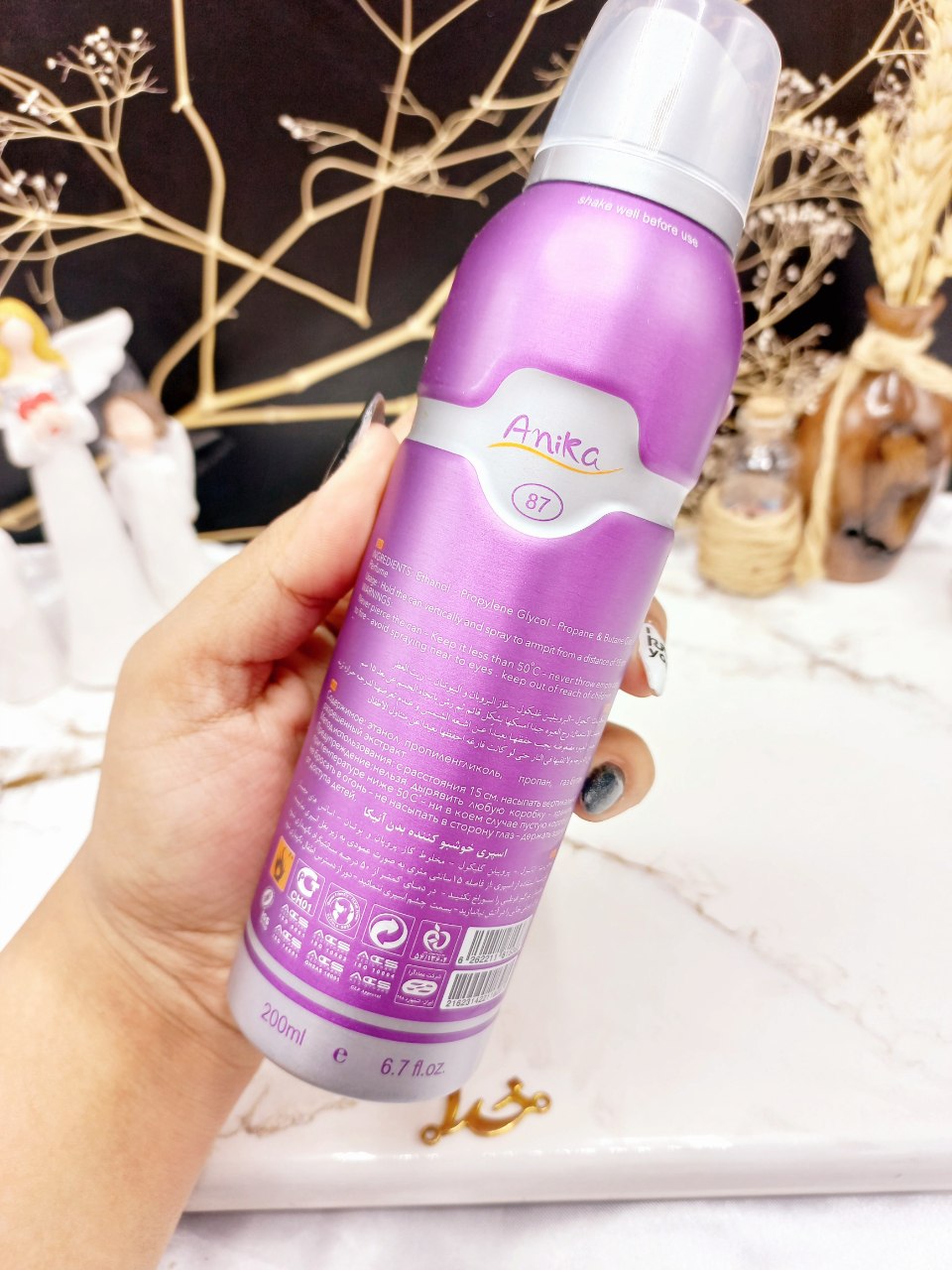 این اسپری کیفیت بالایی دارد؛ زیرا هیچگونه مواد شیمیایی برای آن استفاده نشده است؛ همچنین در ترکیبات آن روغنها، مرطوبکنندهها و ترکیبات طبیعی وجود دارند که موجب خوشبو و باطراوت شدن پوست میشوند. «آنیکا» (Anika) یک برند آرایشی بهداشتی و محصول کشور ایران است.