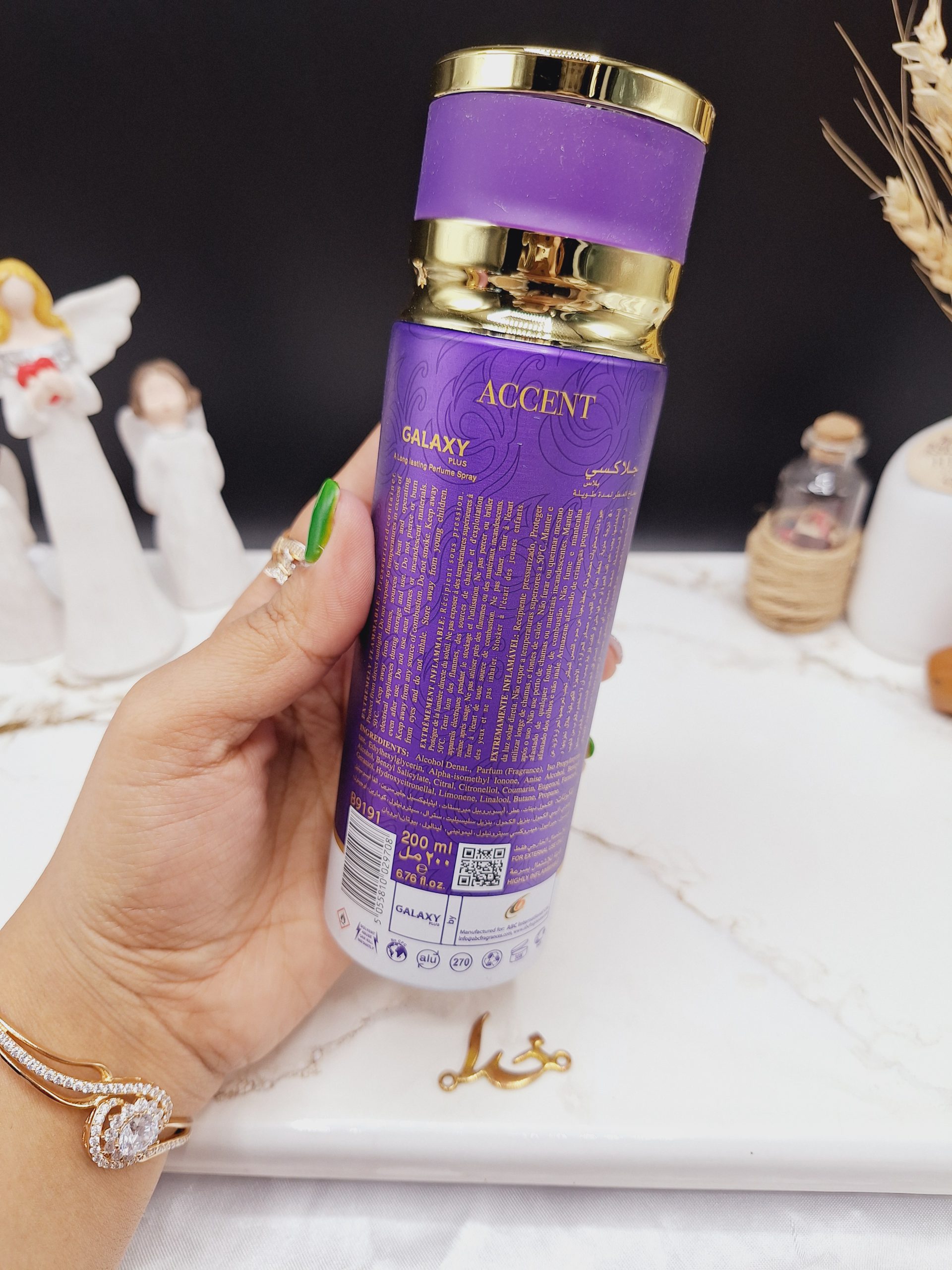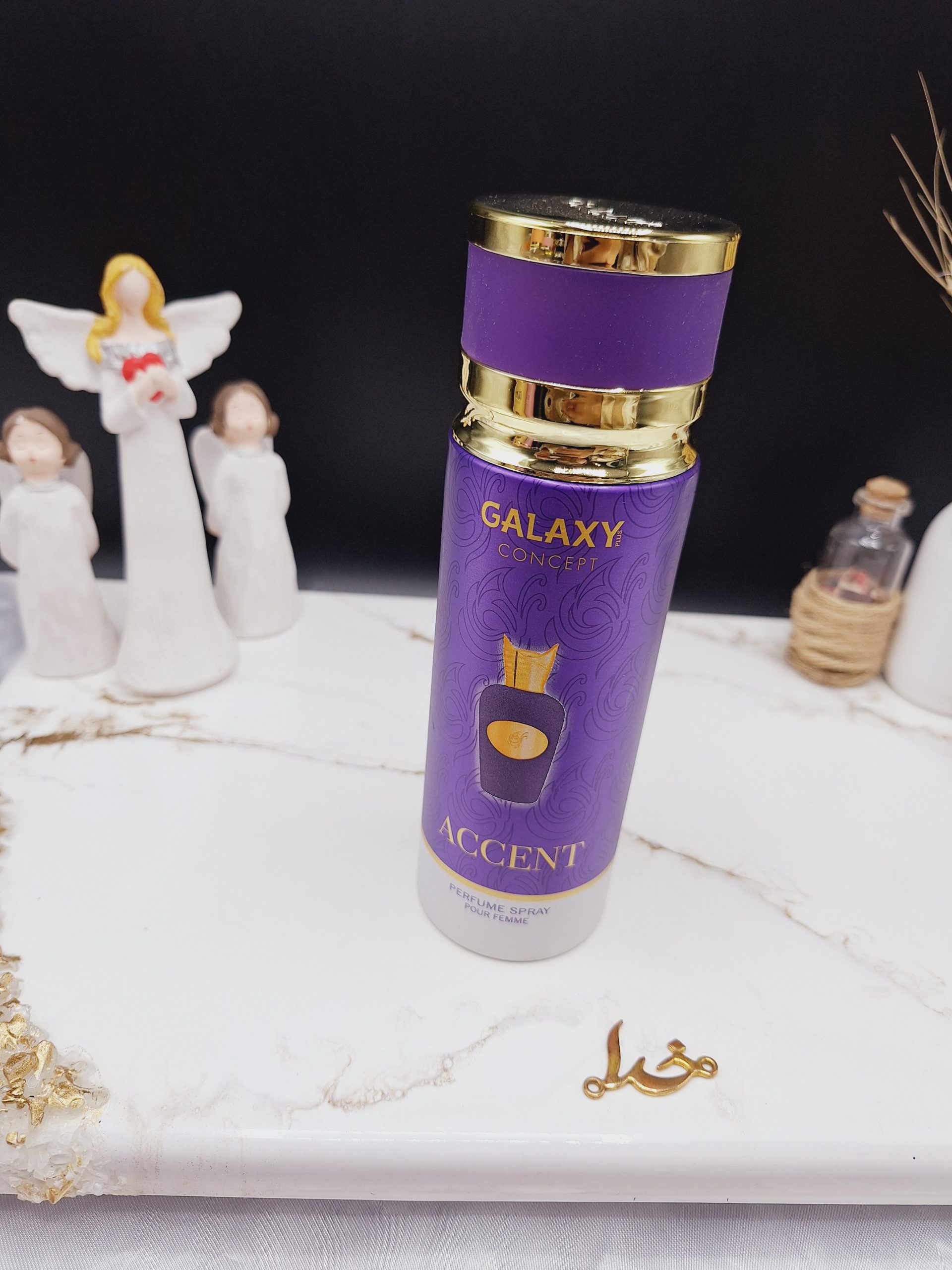 اسپری خوشبو کننده زنانه ACCENT برند گلکسی GALAXY کد B9191 محصولی بهداشتی برای خانمهایی است که علاقه زیادی به رایحههای خوشبو دارند. اسپری خوشبو کننده زنانه ACCENT برند گلکسی GALAXY کد B9191 که رایحه ادکلن اکلت میباشد در گروه اسپری های خوش بو کننده با رایحه ی خنک و شیرین است و با رایحه ی میوه ای ، گلی ، ملایم و شیرین خود درست همانند تم موزیکالی است که روح آدمی را به نوازش در می آورد.به محض اولین اسپری از روی پوست متوجه بوی برگ چای و شکوفه ی درخت هلو می شود. این ترکیب، به سرعت در فضای پخش شده و توجه به اطرافیانتان را به سمت شما جلب خواهد کرد.اگر میخواهید یک خوشبوکنندهی روزمره و همراه داشته باشید تا در هر زمان از روز خوشبو بمانید، پیشنهاد میکنیم این اسپری خوشبوکننده مقرون به صرفه را از دست ندهید