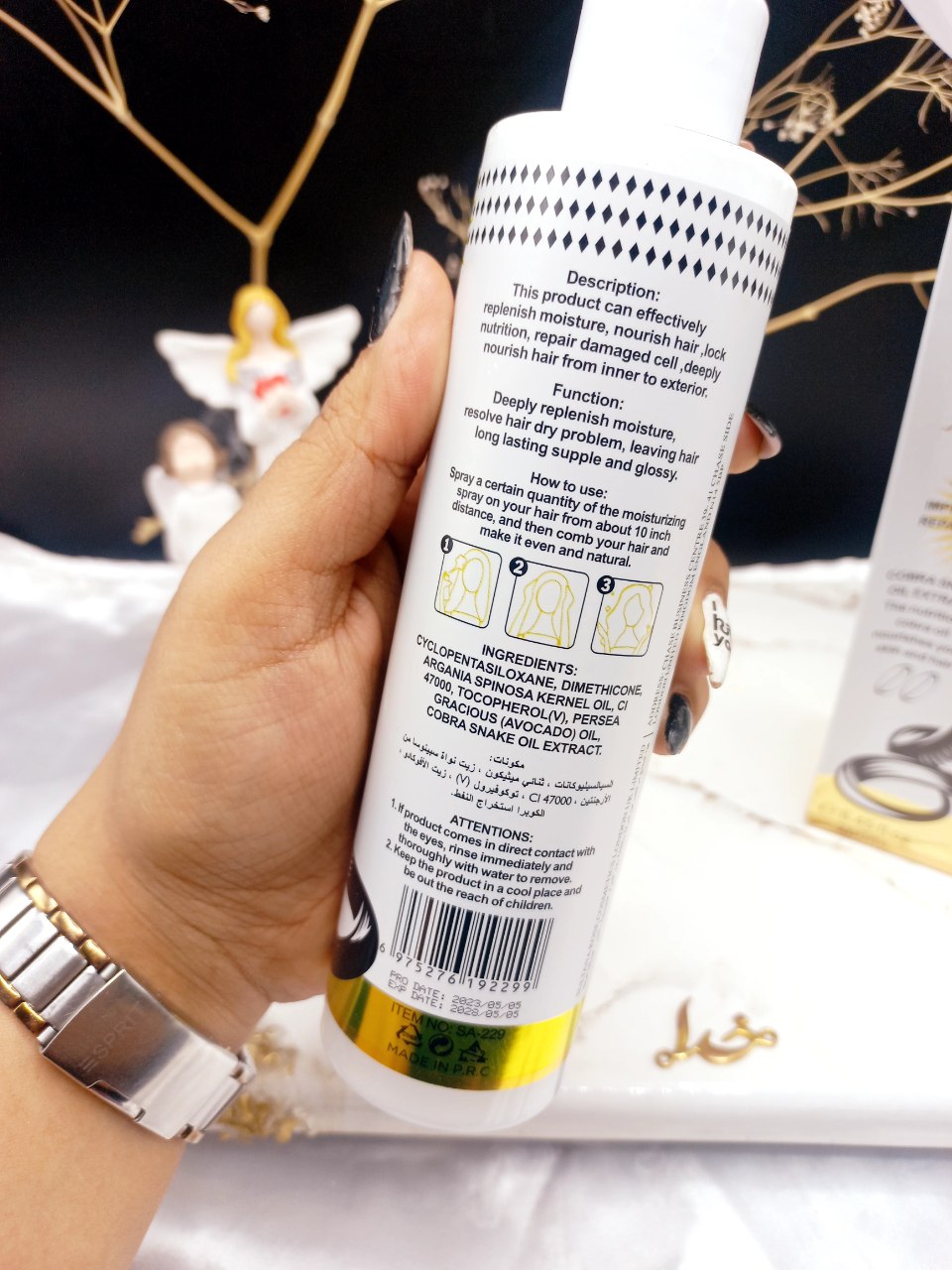 ابتدا اسپری دوفاز مو با عصاره روغن مار برند SULTANA ROSE کد SA_229 را به خوبی تکان دهید تا مایع داخل سرم یک دست شود. بهترین زمان برای مصرف بعد از حمام است زمانی که موهای شما هنوز مرطوب است بنا به اندازه لازم بین دو تا چهار بار از سرم مو را بر روی مو های خود اسپری کنید. حالا موهایتان را کمی ماساژ دهید و سعی کنید سرم مو به کف سر تان برسد سپس میتوانید موهای خود را براشینگ کنید و از سشوار یا اتوی مو بهره ببرید. این محصول نیازی به آبکشی ندارد.