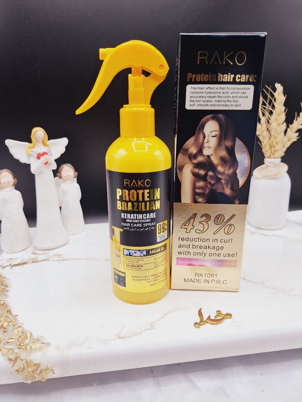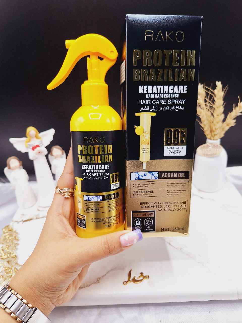 اسپری دو فاز کراتین و پروتین برزیلی حاوی روغن آرگان 99٪ راکو RAKO، کراتین، کلاژن و ترکیبات حرفه ای با خاصیت تقویت کنندگی و درمان فوری موهای آسیب دیده و ترمیم ساختار مو و تامین رطوبت مو میباشد.