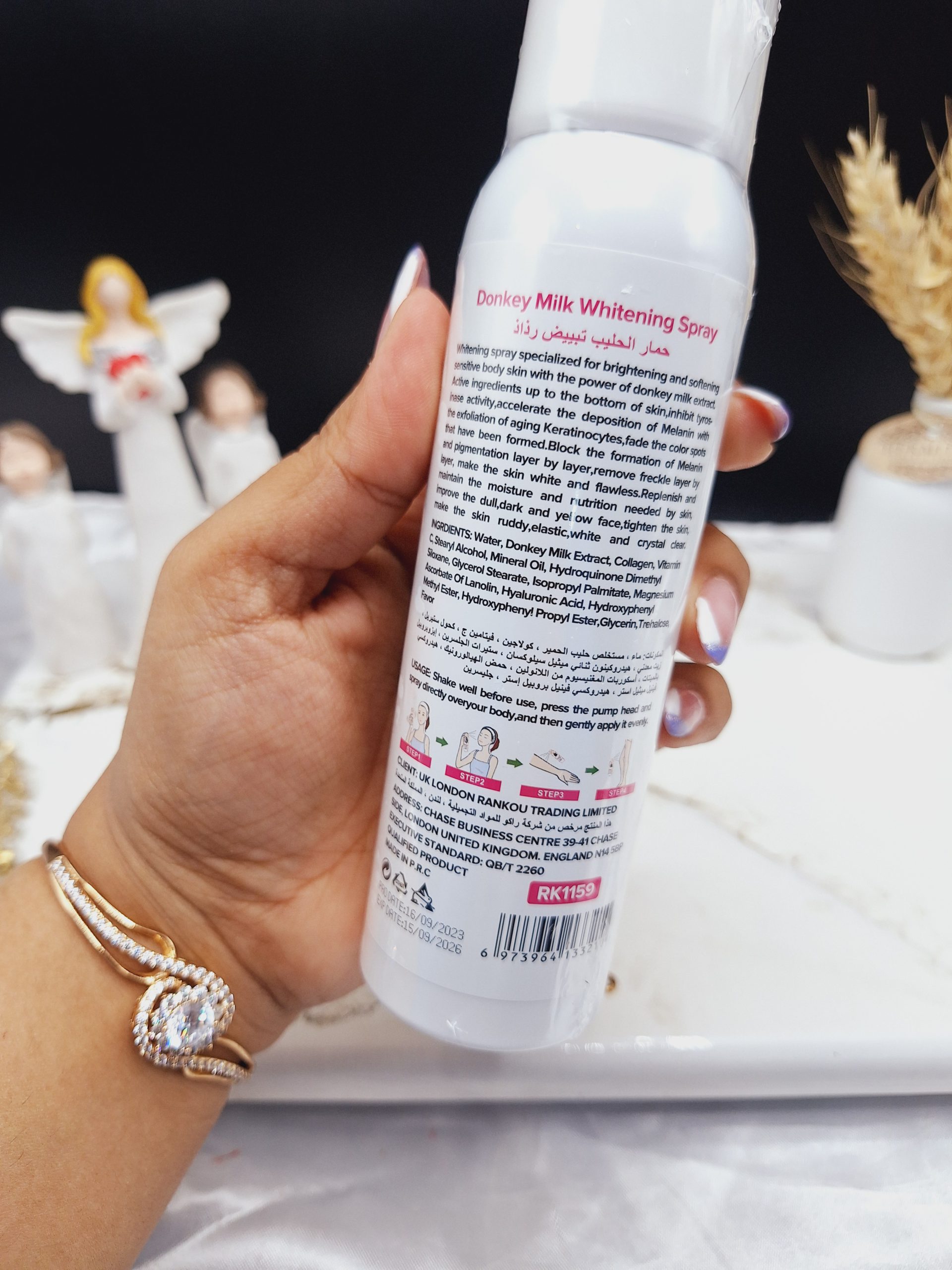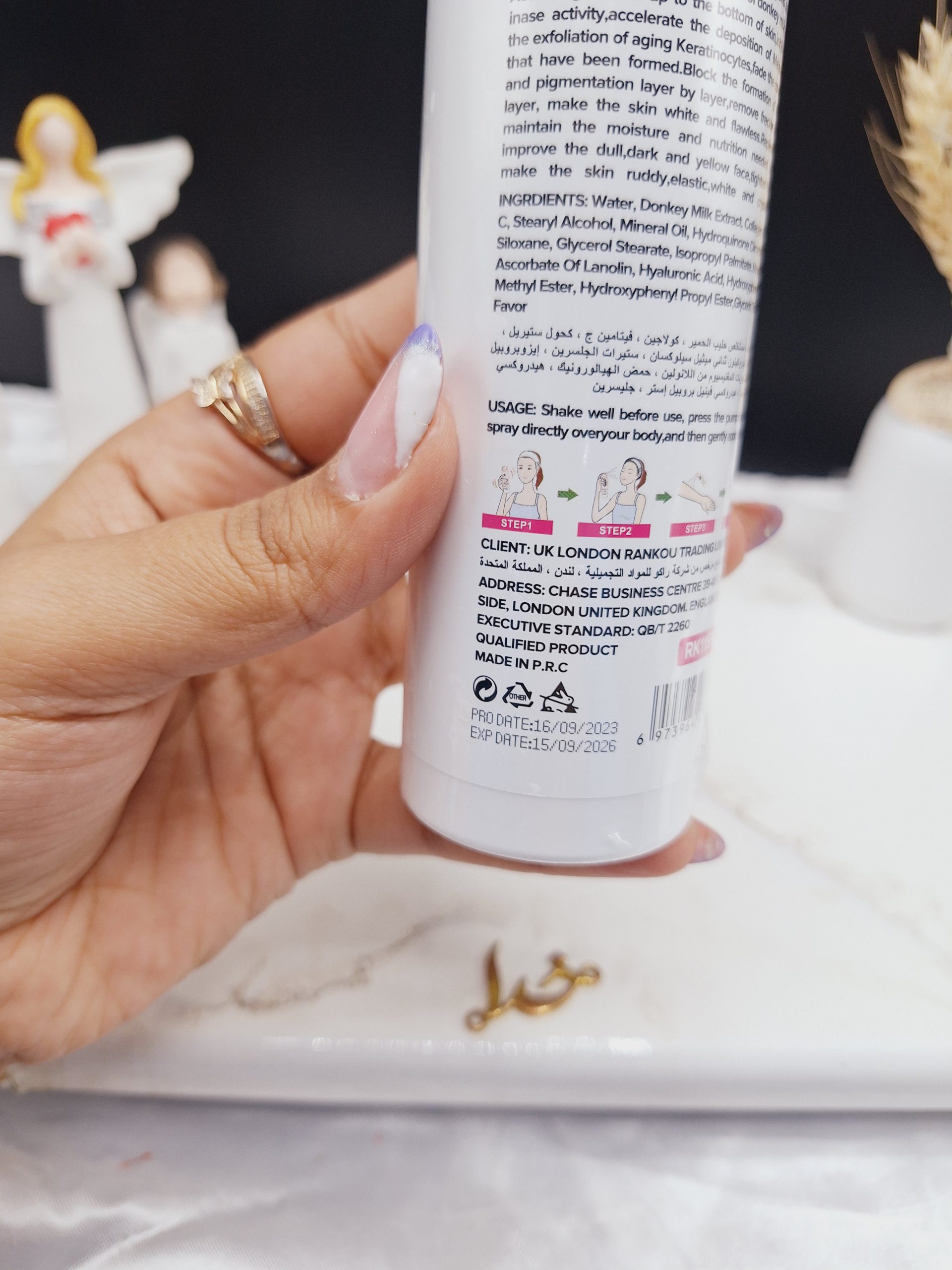 اسپری سفید کننده حاوی ضد آفتاب شیر الاغ راکو RAKO کد RK 1159 حاوی عصاره شیر الاغ یک کرم ضد آفتاب بسیار خوب با SPF 90 است که علاوه بر خاصیت ضد آفتاب و ضد اشعه UV فوق العاده دارای خواص ویژه دیگری نیز هست. مهم ترین ویژگی این اسپری سفید کنندگی آن است که می تواند پوست شما را پس از استفاده تا حد زیادی سفید و روشن کند. علاوه بر آن این کرم به علت داشتن مواد آبرسان و مرطوب کننده فوق العاده پوست شمار ه نرم و مرطوب نگه می دارد. این کرم ضد آفتاب و مرطوب کننده باعث کاهش چین و چروک و خطوط ریز پوست می شود و از ظهور علائم پیری زودرس جلوگیری می کند.