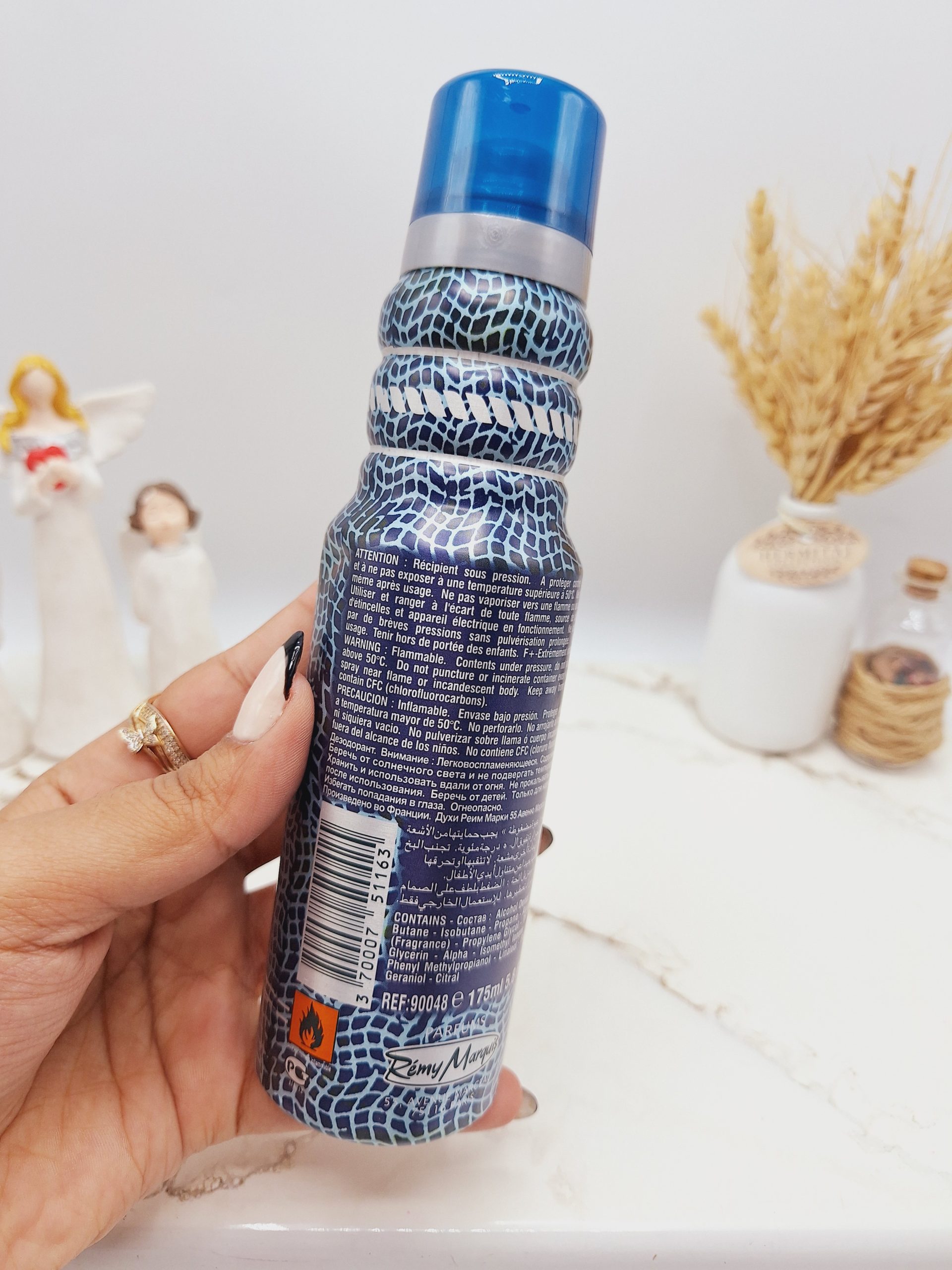 رایحه اسپری بدن رمی مارکوییز شالیز آبی خنک و ملایم است. اغلب مردان شوخطبع و اجتماعی از این رایحه استقبال میکنند. اسپریها معمولا برای تمام فصول به کار میروند. اسپری shalis man remy marquis بطری آبی رنگ، طرح پوست ماری و خوشدستی دارد و نام و برند اسپری با فونتی زیبا روی آن دیده میشود. درپوش این اسپری، آبی رنگ است که به زیبایی روی آن قرار گرفته است.