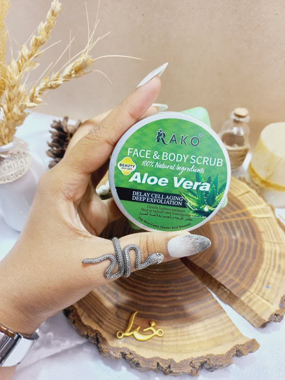 اسکراب شنی صورت و بدن آلوئه ورا راکو ترمیم کننده، تسکین دهنده ی التهاب و جوان ساز پوست صورت است و علاوه بر آن، سم زدای پوست می باشد و هرگونه میکروب و سلول مرده ی موجود در پوست را از بین می برد. این اسکراب از بین برنده جوش و آکنه نیز می باشد و با کنترل چربی پوست و بستن منافذ باز صورت، از بروز جوش های جدید جلوگیری می کند. لایه برداری این اسکراب ملایم است، که همین امر موجب، درخشانی و از بین رفتن لک های پوستی می شود. این اسکراب مختص صورت نمی باشد و می توان برای تمام پوست بدن نیز از آن استفاده کرد و از شر جوش ها و لک های موجود روی پوست بدن نیز رهایی یافت.