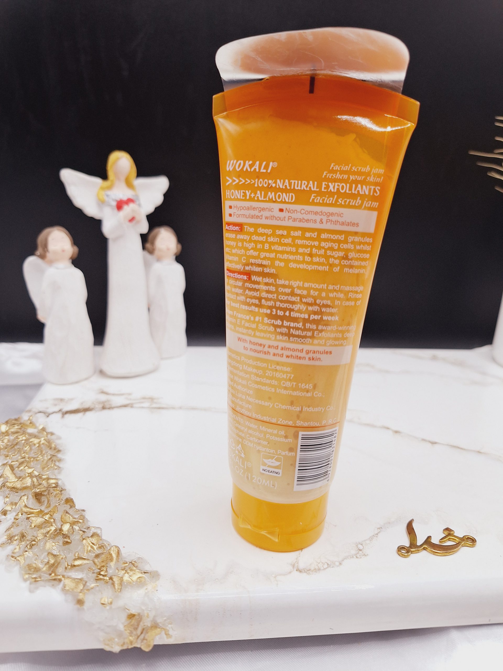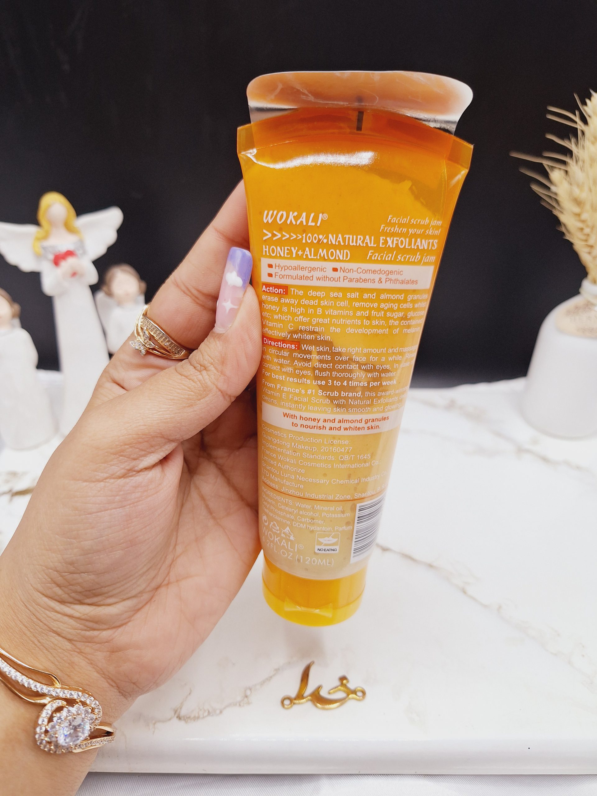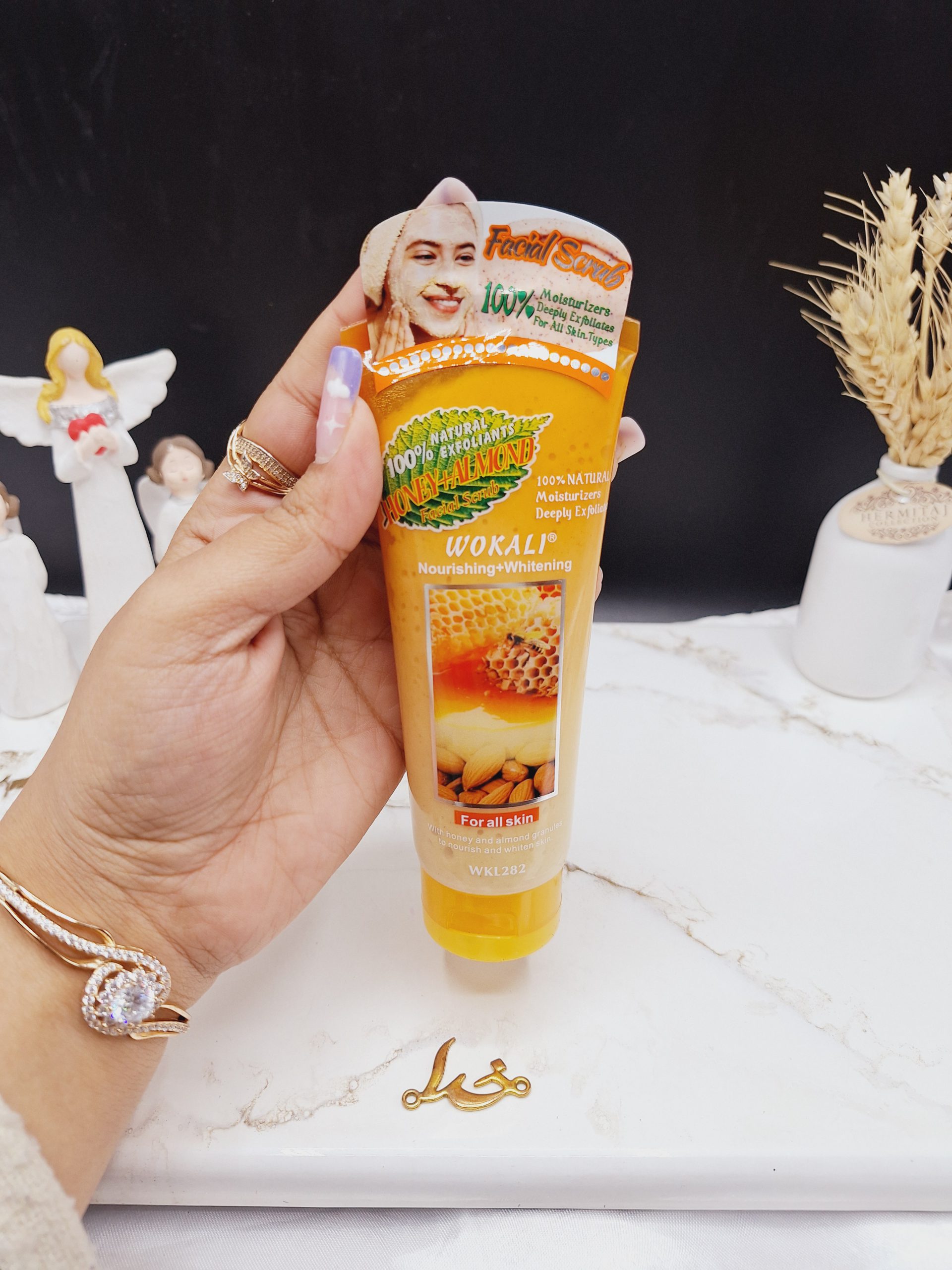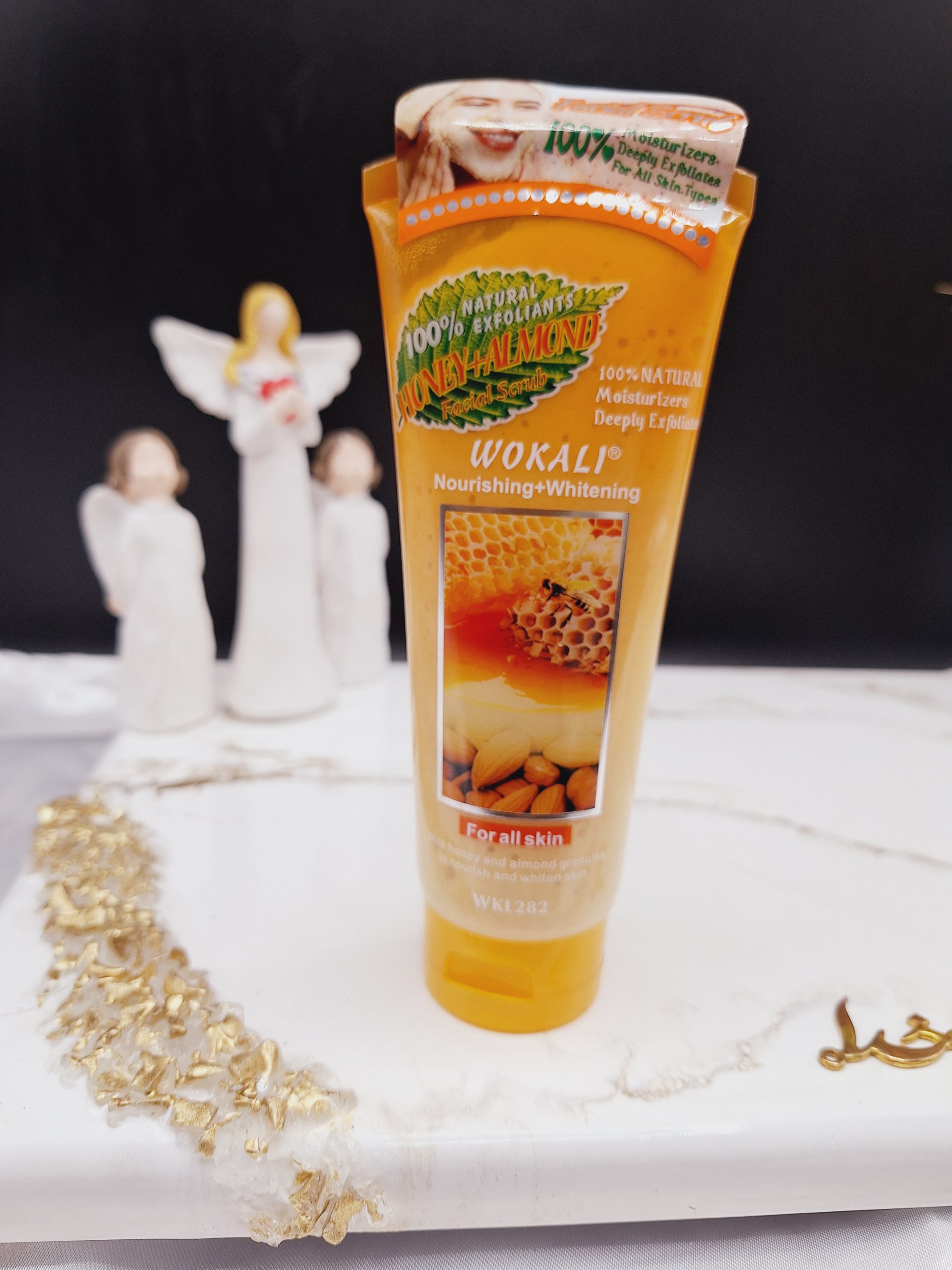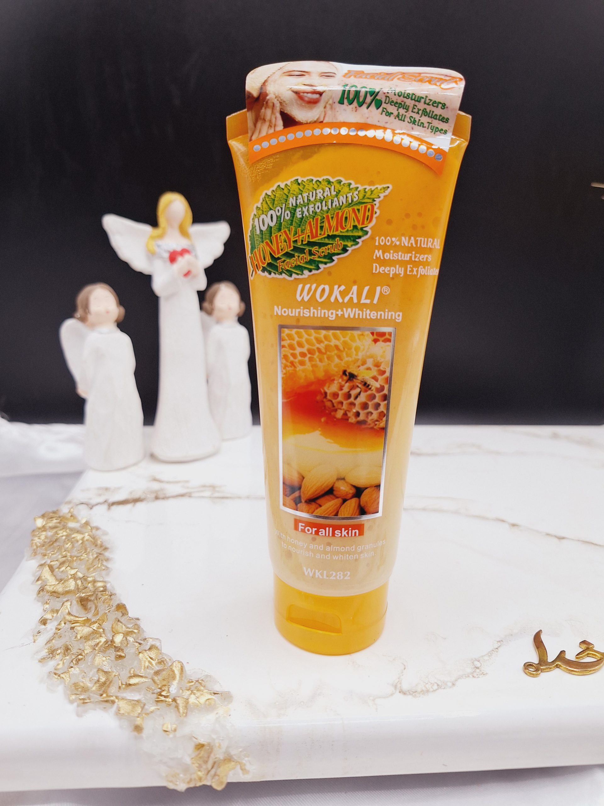 اسکراب صورت لایه بردار و سفید کننده رایحه عسل و بادام وکالی کد WKL282 موجود در دو مدل : عسل بادام و هلو می باشد این اسکراب از بین برنده لایه ی مرده پوست است.