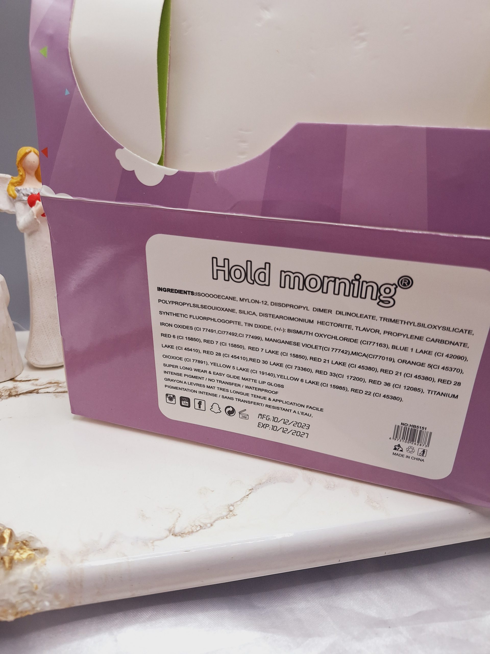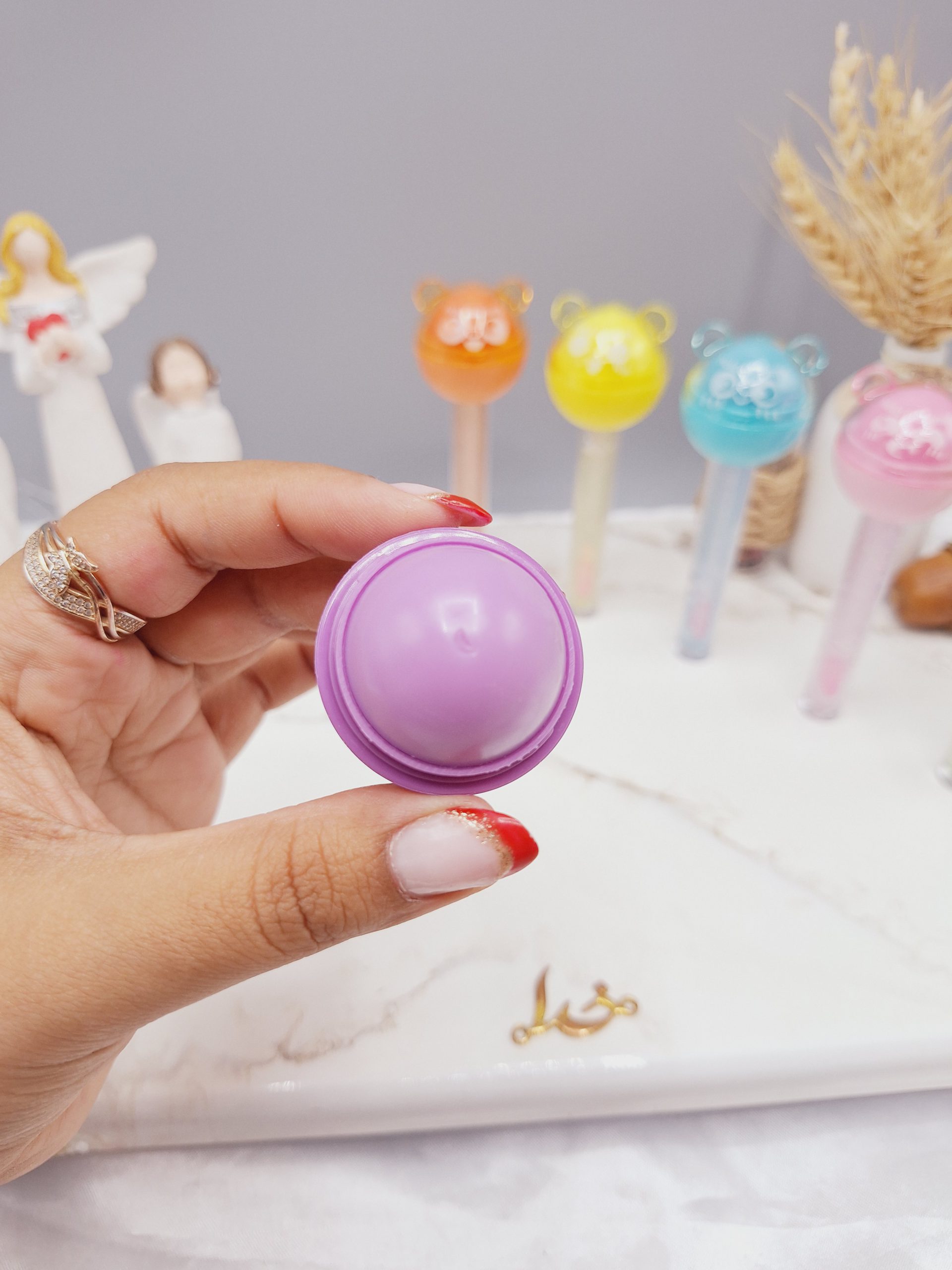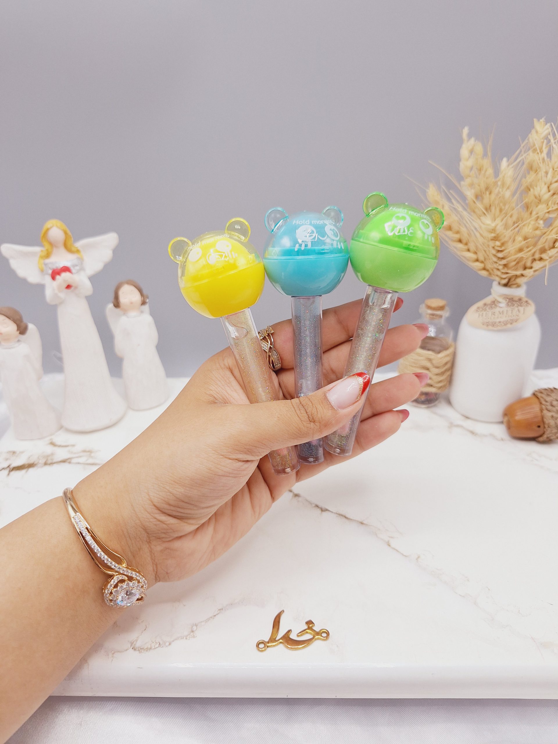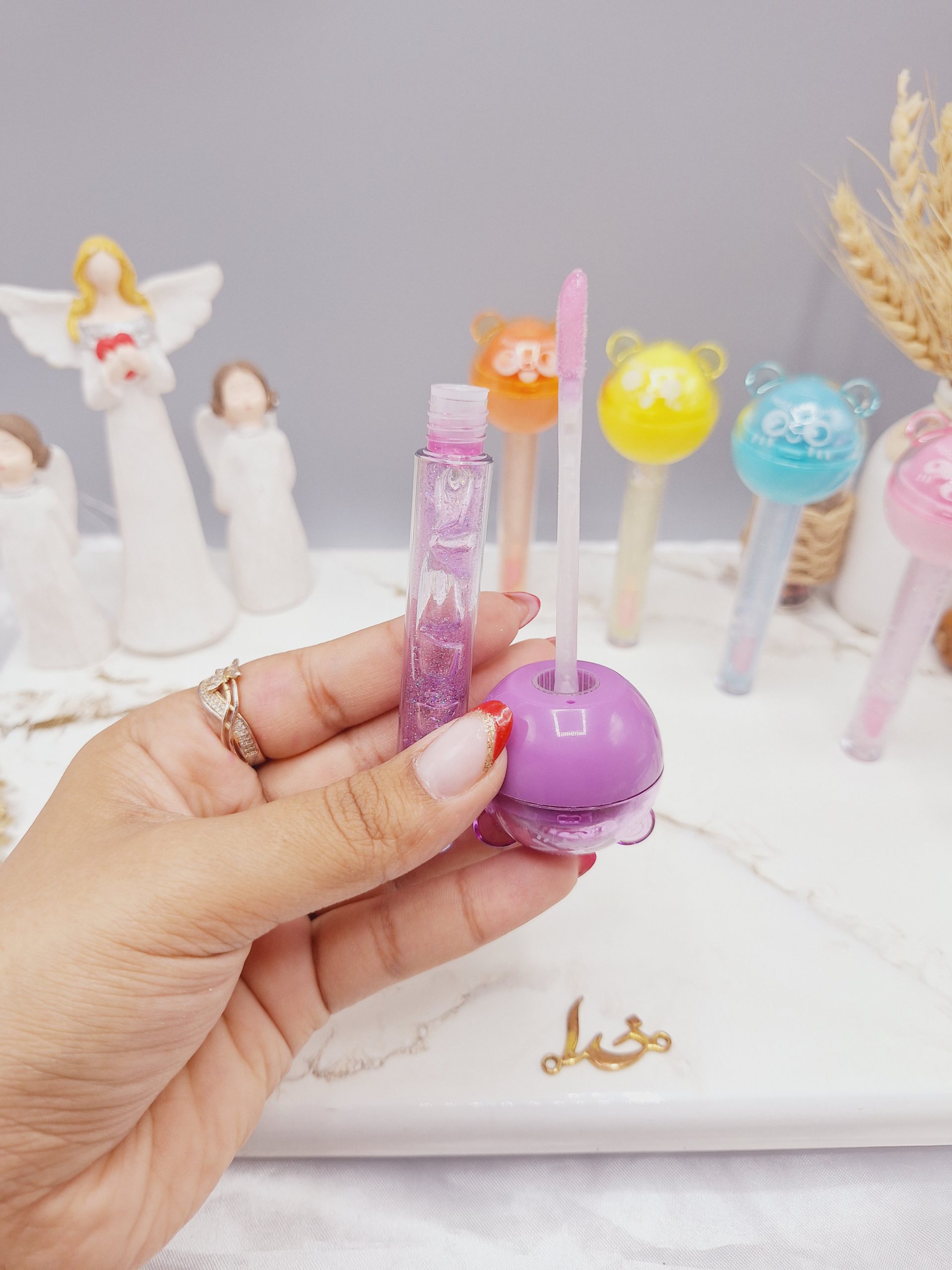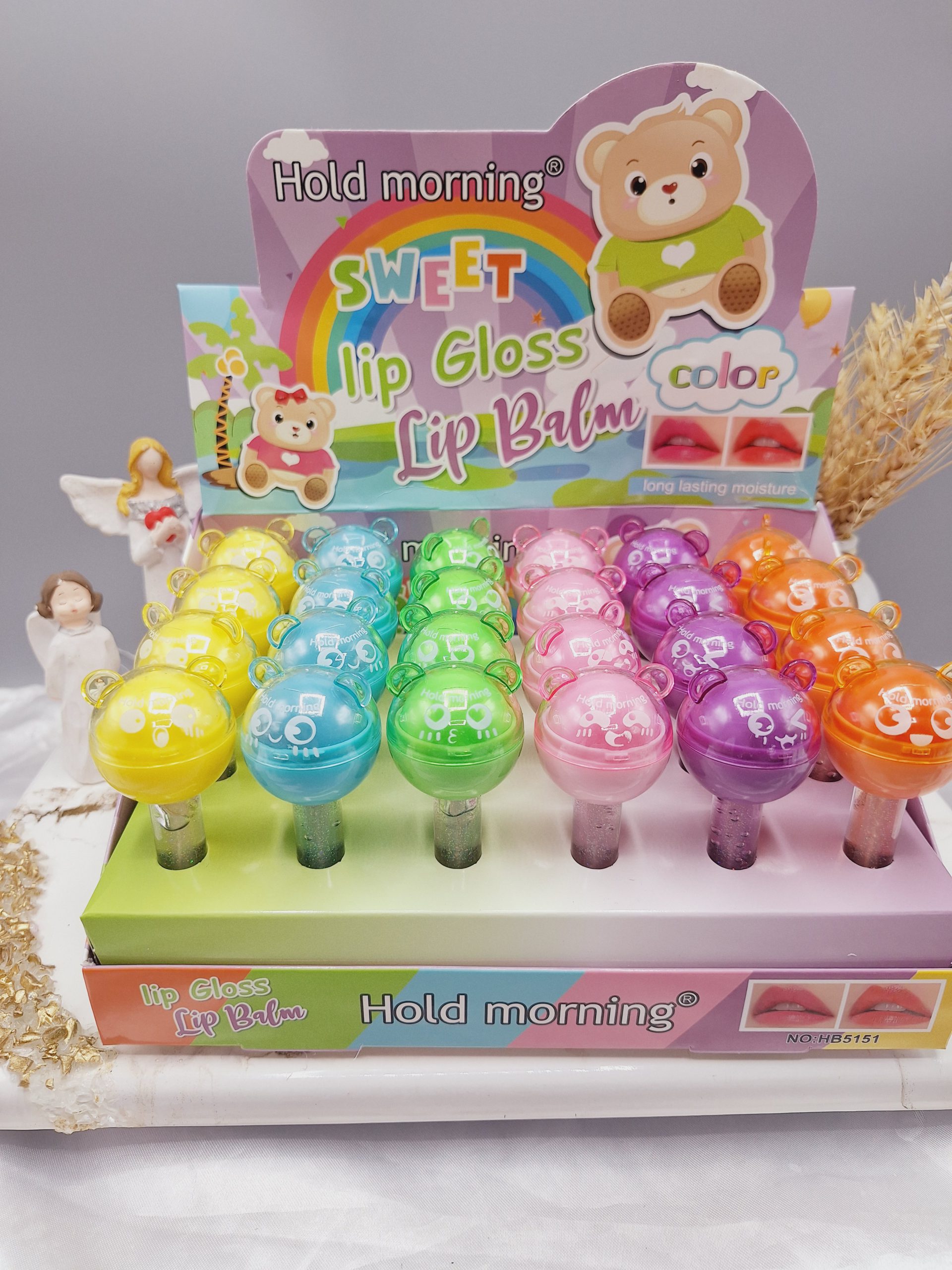 در قسمت بالای بالم لب و لیپ گلاس طرح خرس آبنباتی برند هلد مورنینگ، بالم لب است که خاصیت ابرسانی دارد و ویتامین e هم دارد که باعث جلوگیری از خشکی پوست لب میشود.