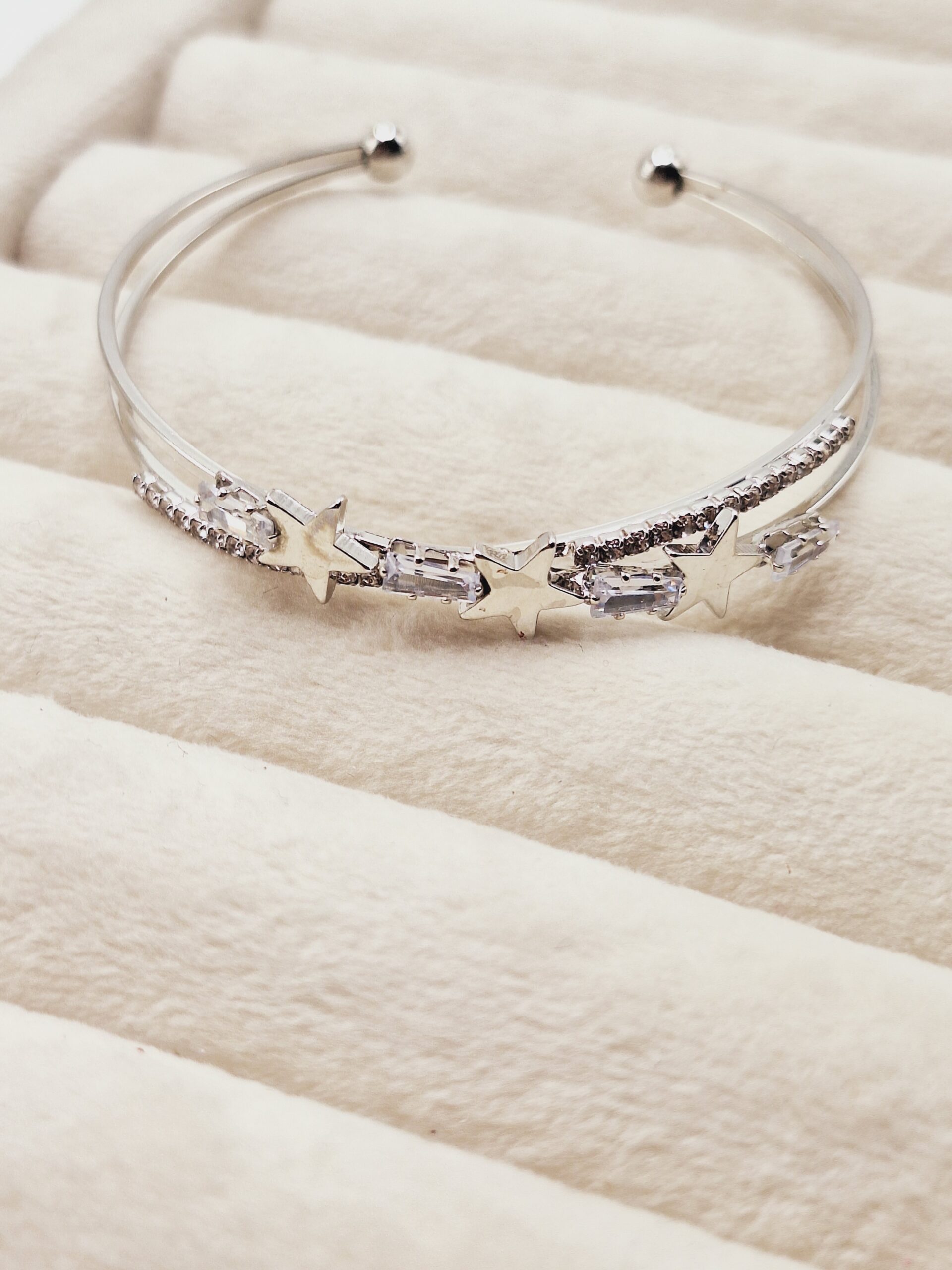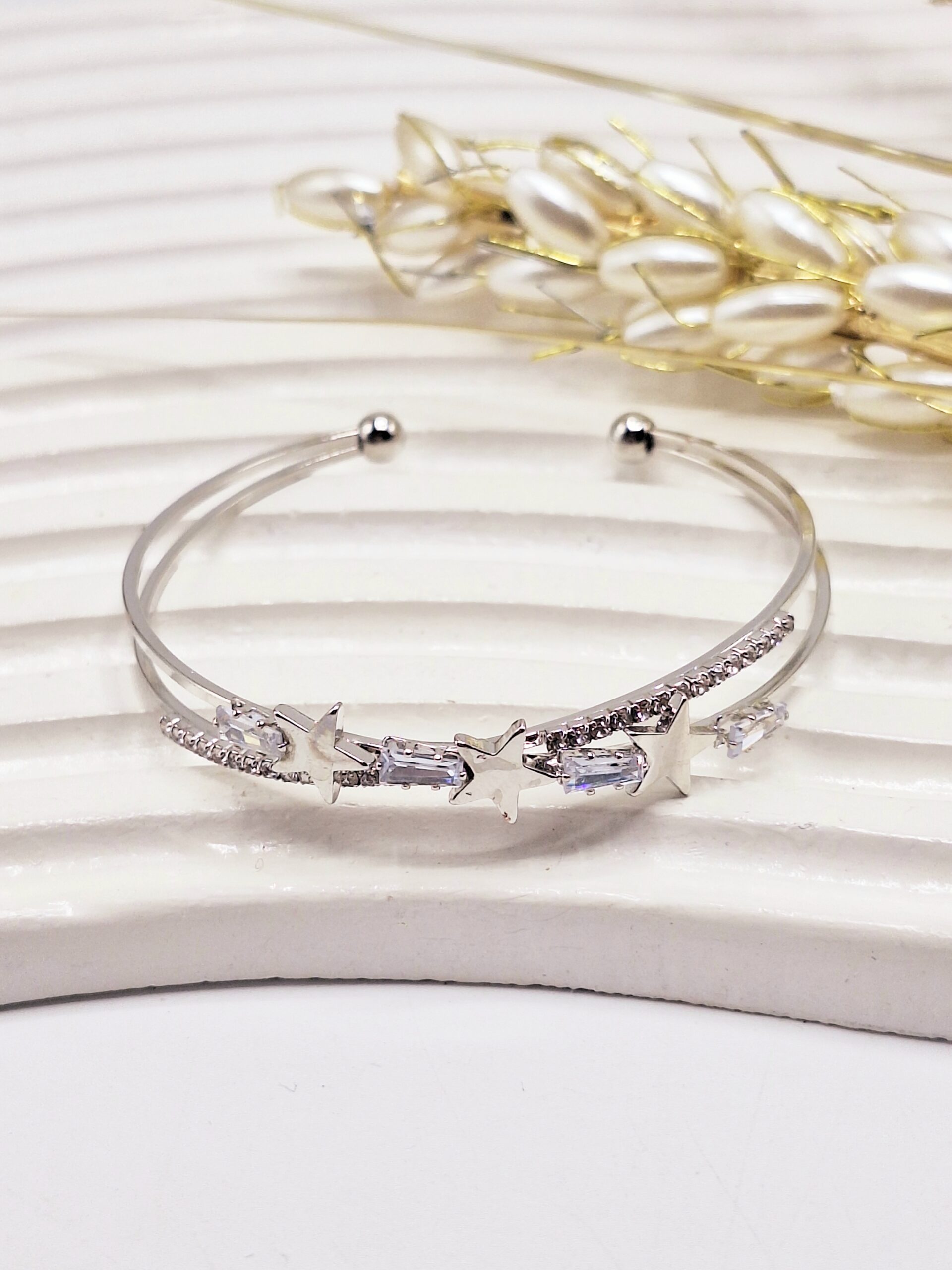 بنگل زیبا دو لاین نگینی طرح ستاره سفید یک اکسسوری شیک و لوکس است 💎⭐🤍. طراحی دو لاین نگیندار با طرح ستاره سفید، جلوهای خاص و چشمگیر به استایل شما میبخشد و مناسب استفاده در روزمره، مهمانی و هدیه دادن میباشد 🎉🎁