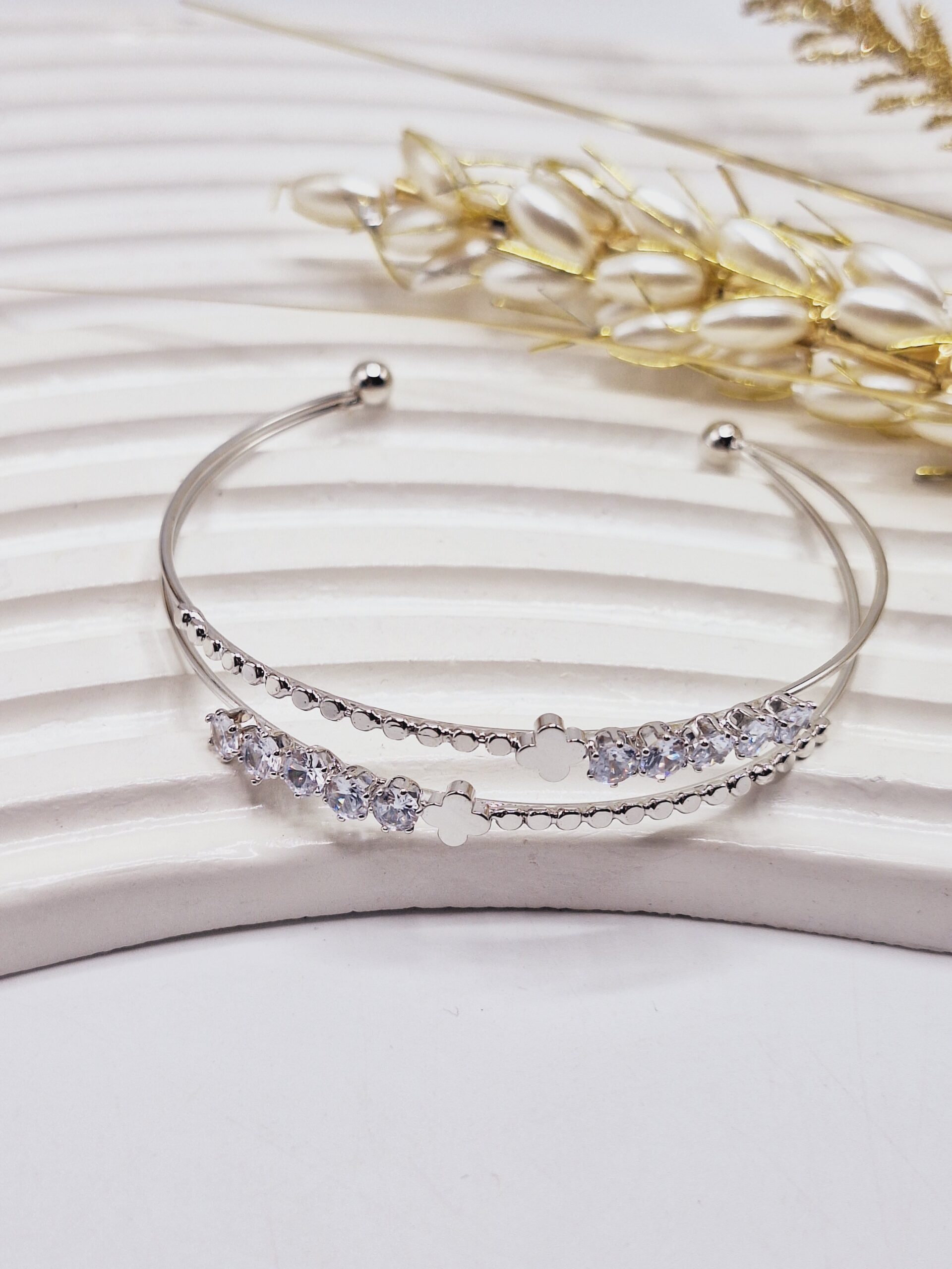 بنگل زیبا دو لاین نگینی طرح ونکلیف سفید یک اکسسوری شیک و لوکس است 💎🤍. طراحی دو لاین نگیندار با طرح ونکلیف سفید، جلوهای خاص و چشمگیر به استایل شما میبخشد و مناسب استفاده در روزمره، مهمانی و هدیه دادن میباشد 🎉🎁