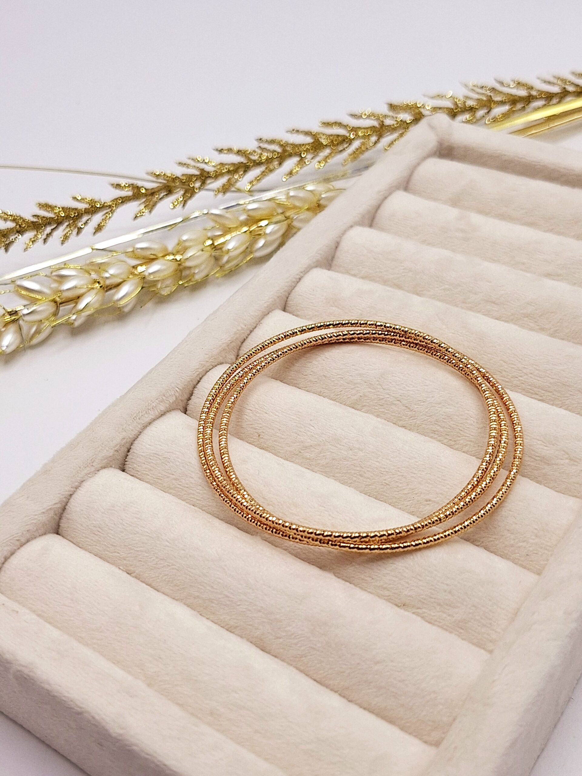دستبند النگویی 3 تایی طلایی ژوپینگ ✨💖 یه انتخاب فوقالعاده شیک برای دخترایی که عاشق استایل خاص و مجلسی هستن 😍👌 طراحی الهام گرفته از ظرافت و زیبایی زنونه، پر از حس لوکس بودن.