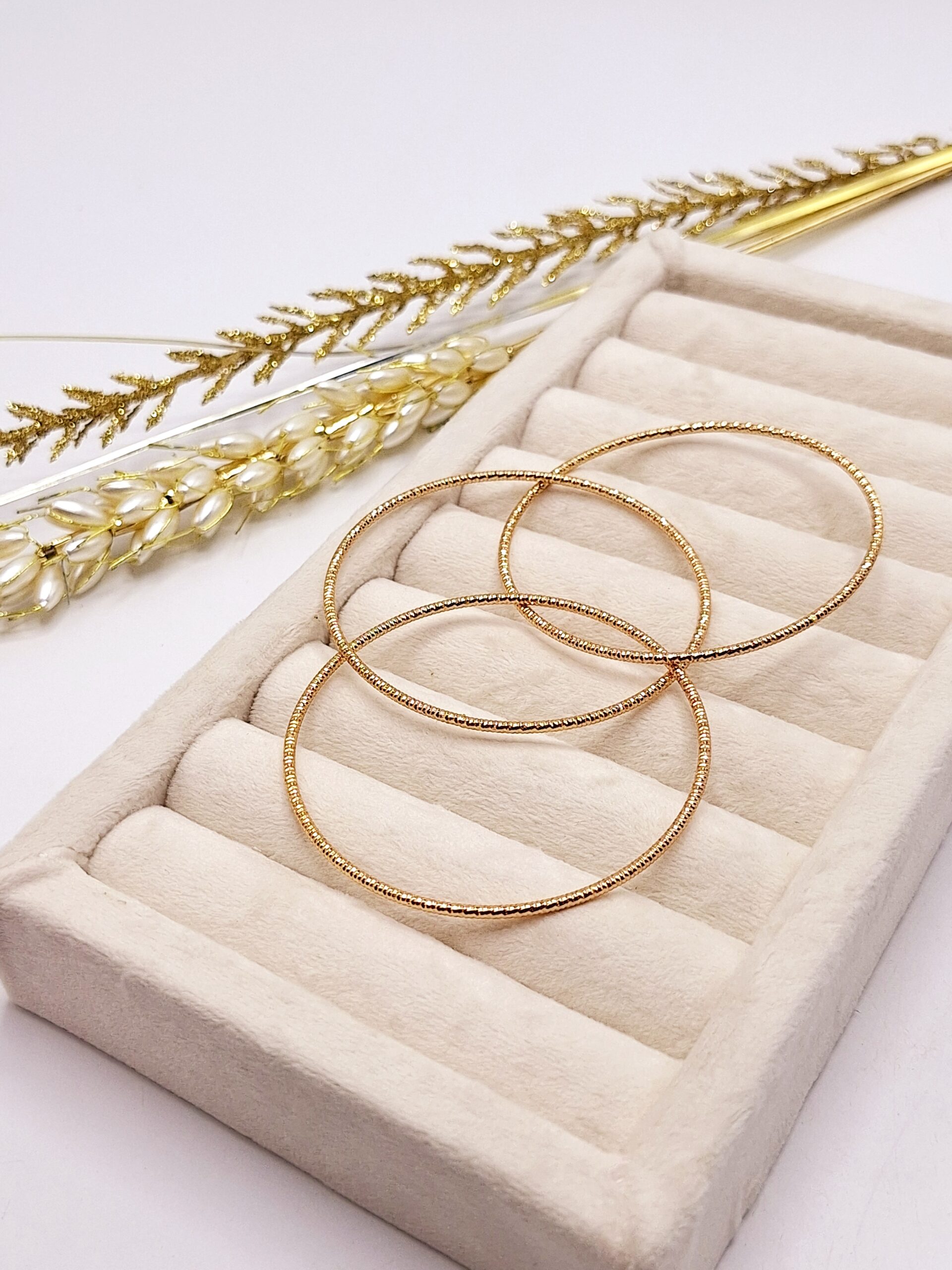 دستبند النگویی 3 تایی طلایی برند ژوپینگ ✨ یکی از اون اکسسوریهای پرطرفدار و لاکچریه که هر خانومی رو به استایلی شیک و مجلسی میرسونه 😍💎 طراحی سهتایی و هماهنگ این النگوها باعث شده ترکیب فوقالعادهای روی دست ایجاد بشه و جلوهای خاص به استایلت بده.