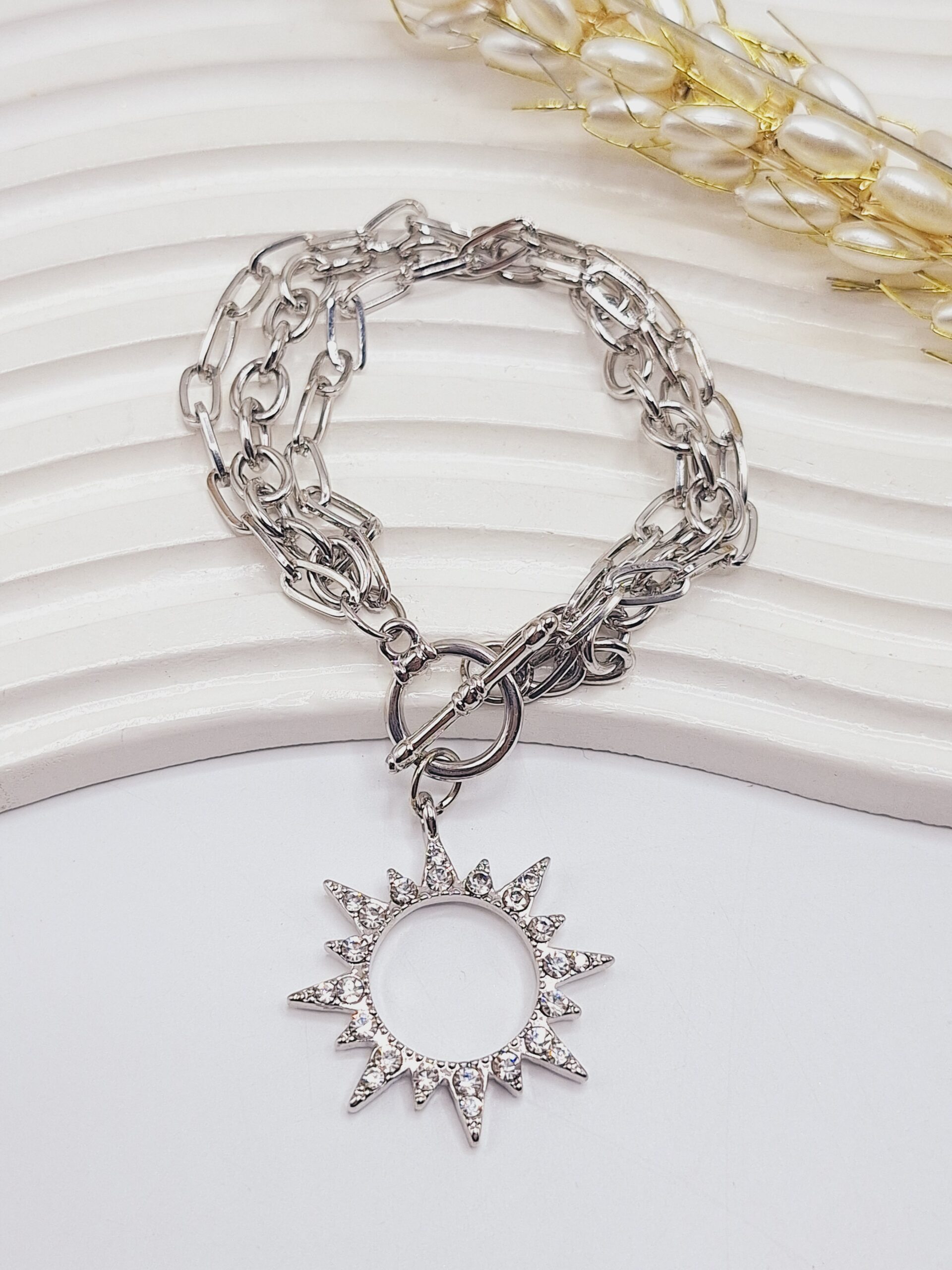 دستبند زنجیری طرح خورشید نقرهای یک اکسسوری شیک و مینیمال است 💎🌞. طراحی خورشید نقرهای روی زنجیر ظریف، جلوهای خاص و مدرن به دست شما میبخشد و مناسب استفاده در روزمره، مهمانی و هدیه دادن میباشد 🎉🎁