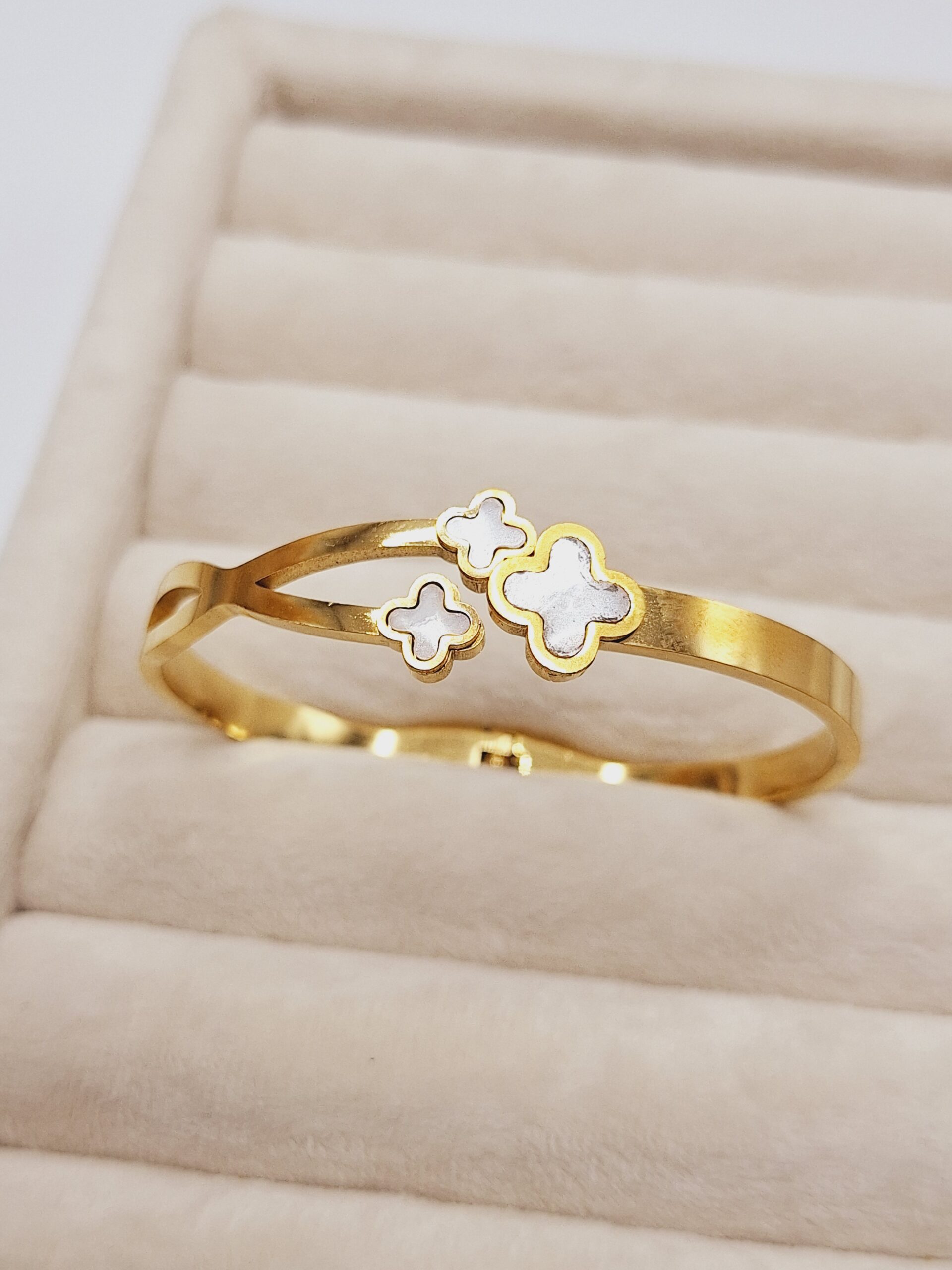 این دستبند طلایی طرح ۳ ونکلیف سفید، ترکیبی از درخشش طلایی و ظرافت خطوط سفید است 🌟🤍