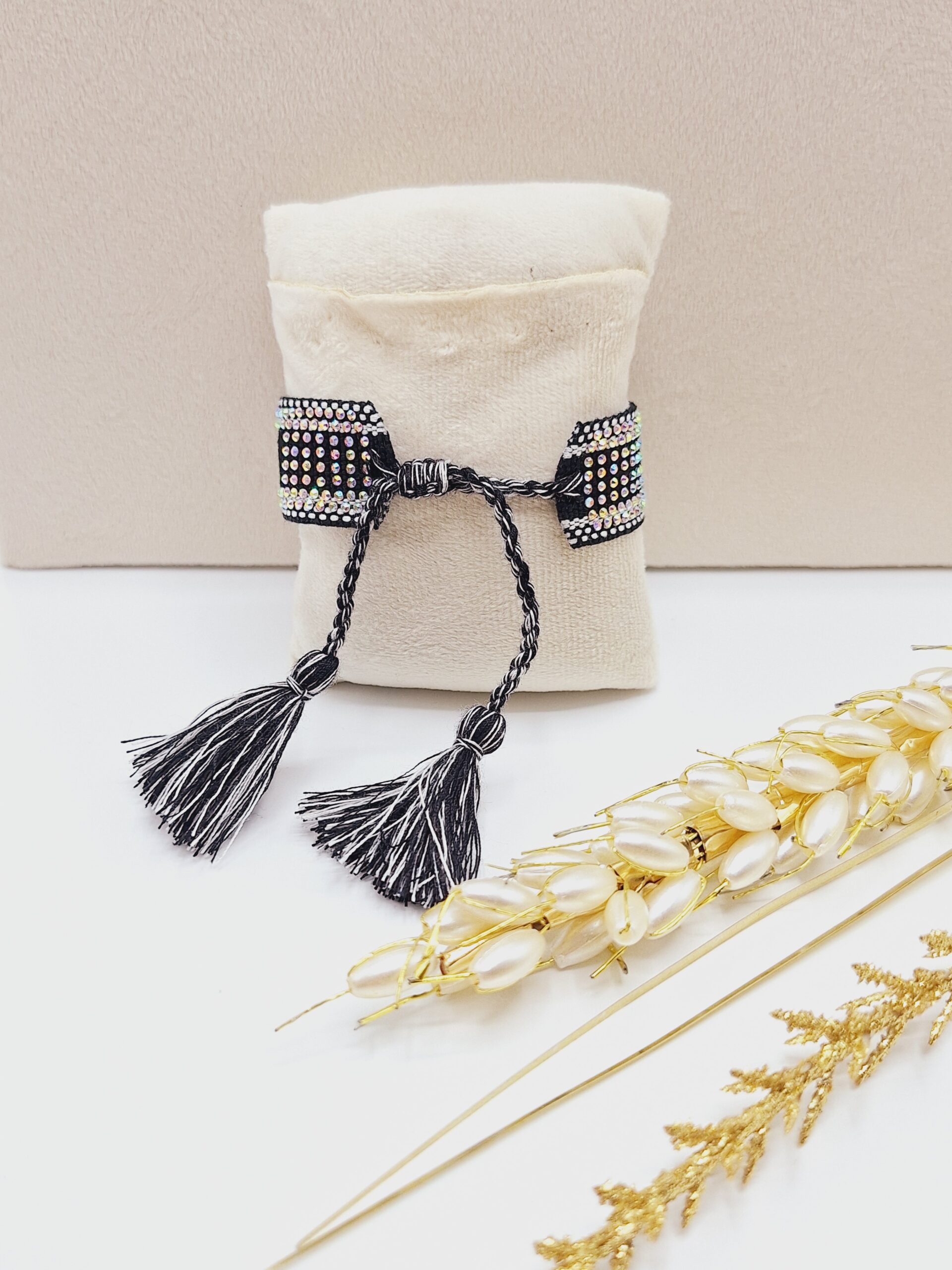 این دستبند پارچهای نگیندار الهام گرفته شده از ظرافت شب و رمز و راز شبهای درخشان است و مناسب خانمهایی که عاشق اکسسوریهای شیک، مینیمال و فانتزی هستند 🖤✨💎😍