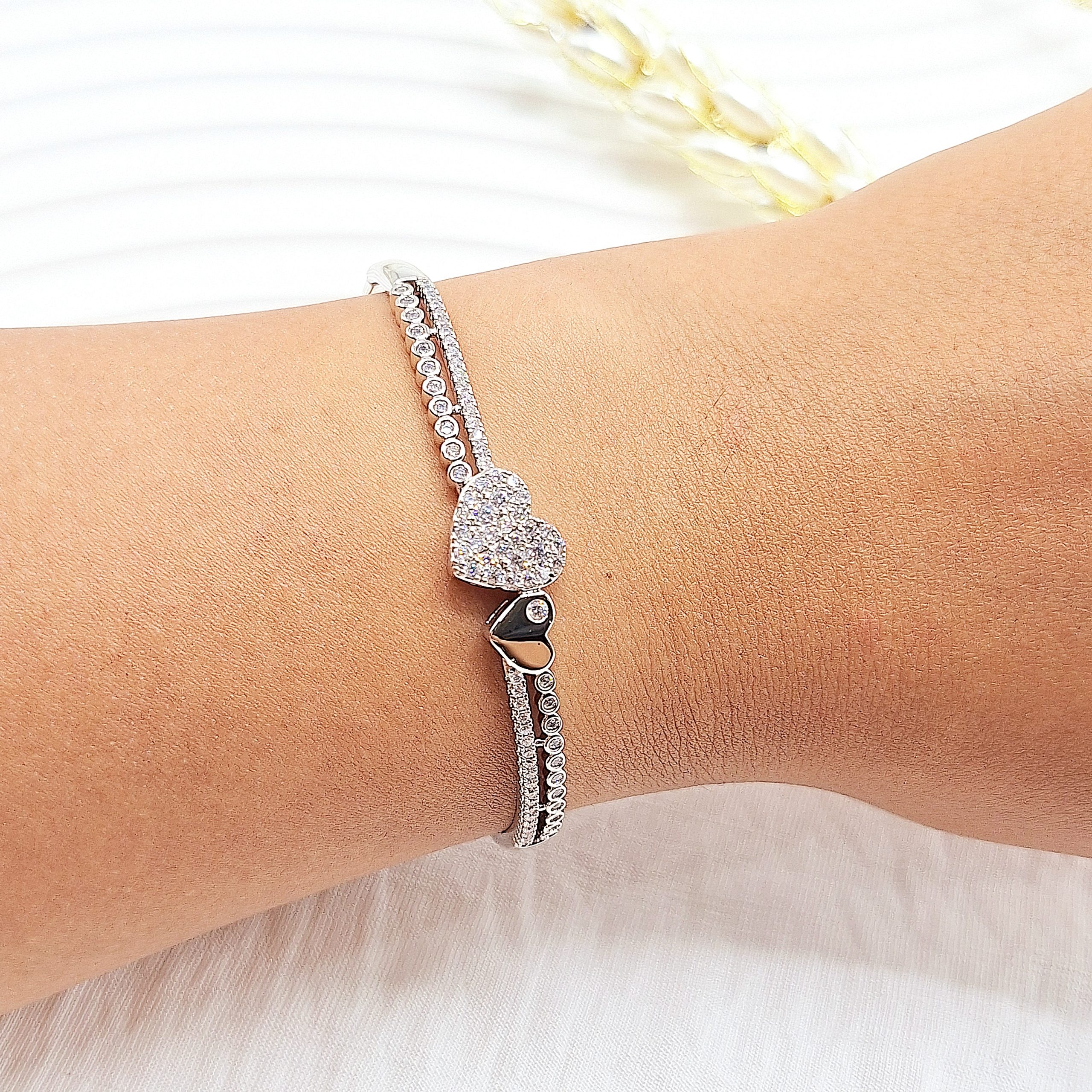 دستبند پینترستی طرح قلب دوتایی نقره ای نگین دار استیل رنگ ثابت
