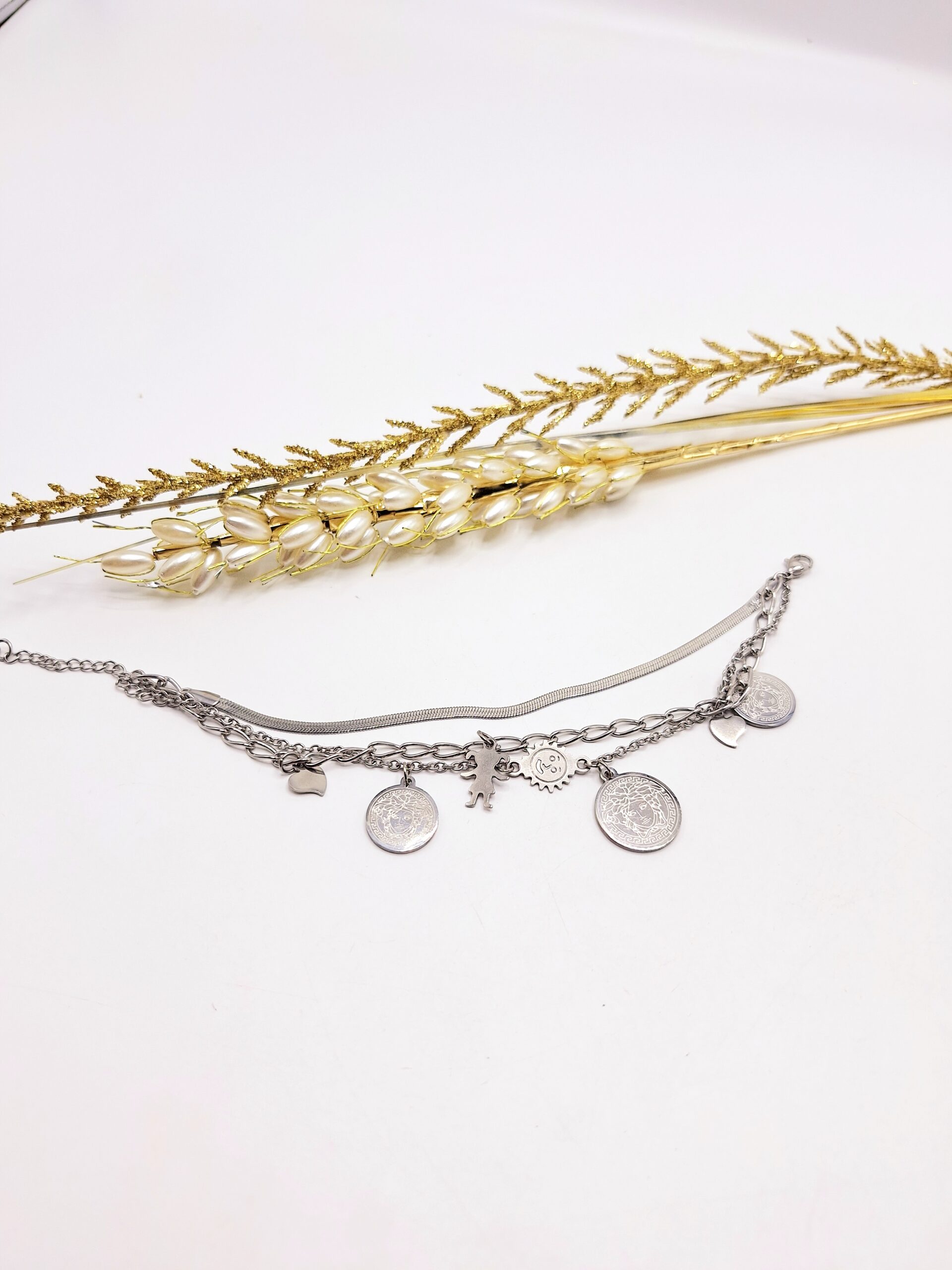 دستبند 3 لاین ورساچه ✨ یه اکسسوری لاکچری و خاص که با طراحی سه ردیفه خودش، استایل هر کسی رو شیک‌تر و جسورتر می‌کنه 😍💖 - ⛓ طراحی: سه لاین با طرح ورساچه - 🎨 رنگ: نفره ای براق - ✨ سبک: لوکس، مدرن و استایلیش - 🎁 مناسب هدیه و استفاده خاص - ⚠️ نیاز به مراقبت دارد (از تماس با مواد شوینده و مایع ظرفشویی جلوگیری شود)