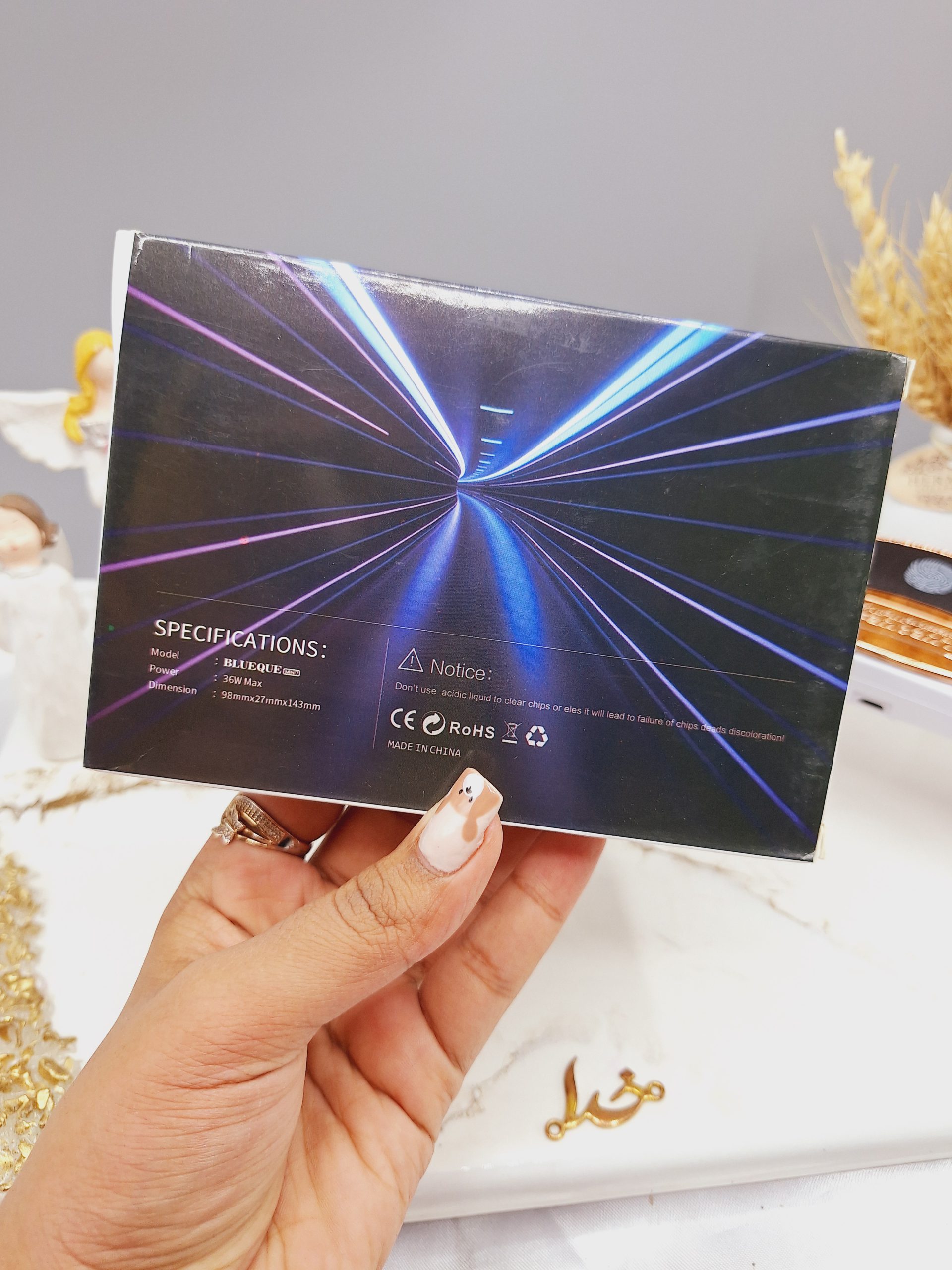 دستگاه یو وی ناخن دارای پایه نگهدارنده برند BLUEQUE تولید شده در کشور چین دستگاهی با قدرتی بسیار بالا معادل 168 وات است که توسط 42 لامپ ترکیبی یو وی - ال ای دی تامین می شود. این دستگاه برای استفاده حرفه ای در سالن های زیبایی و استفاده در منزل مناسب است.