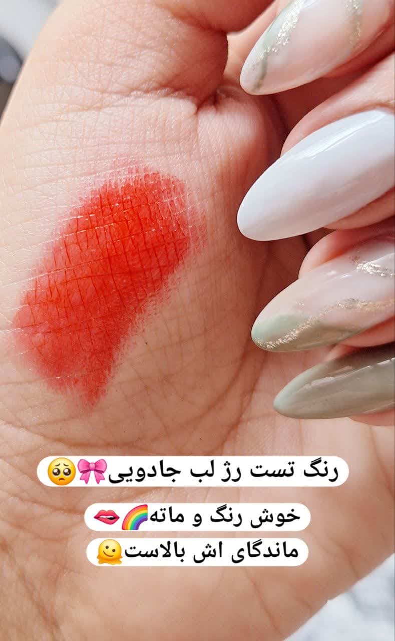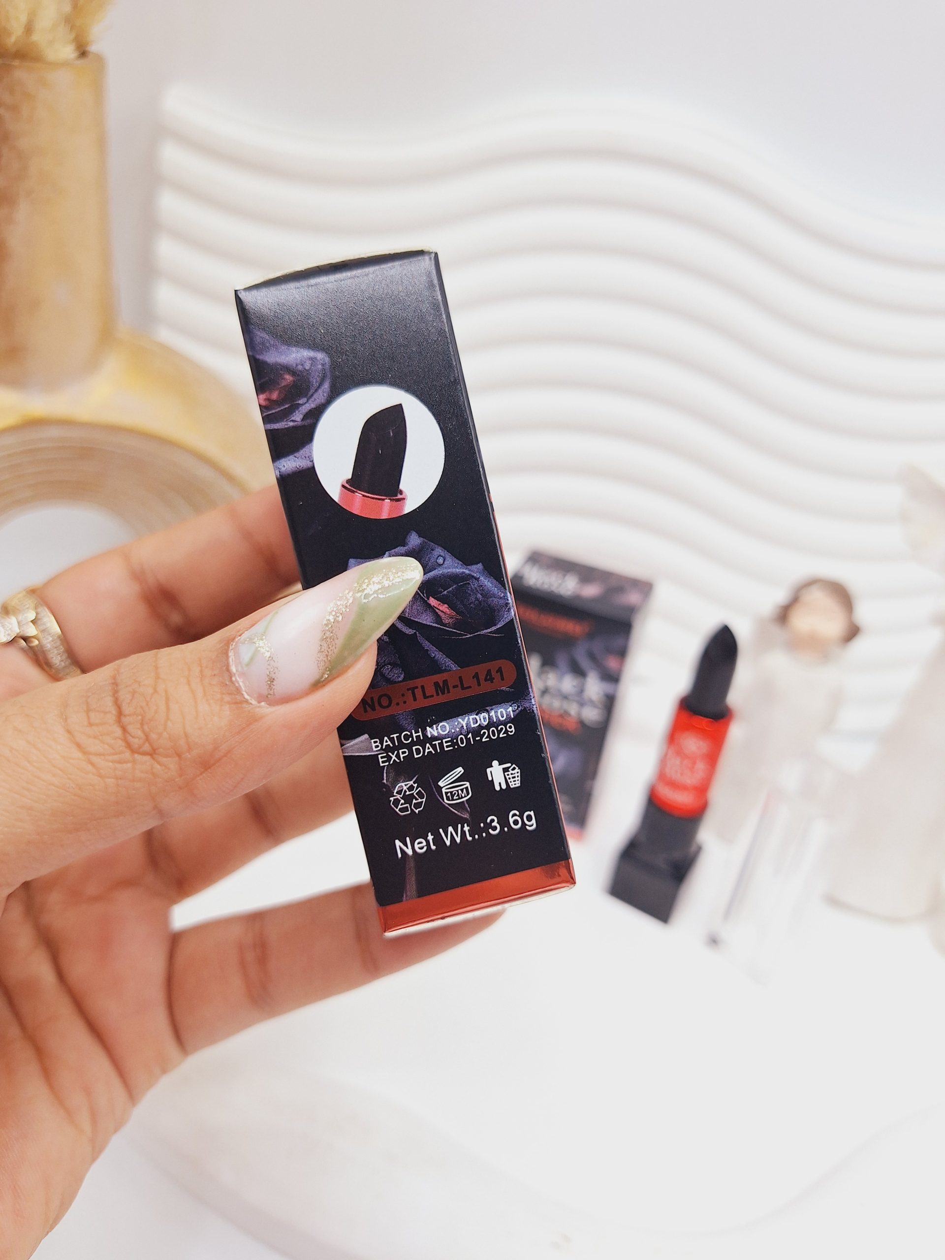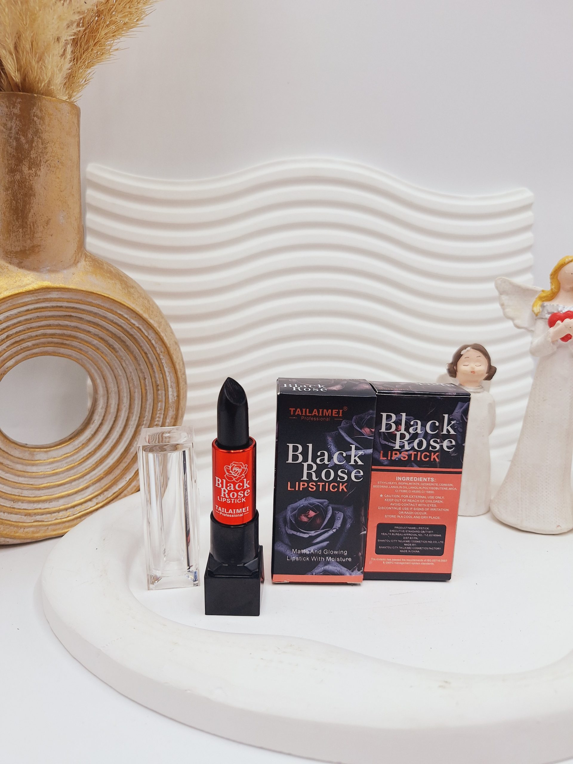 نمای ظاهری رژ مشکی است که حاوی عصاره رز سیاه است اما پس استفاده رنگ سرخابی زیبایی نمایان