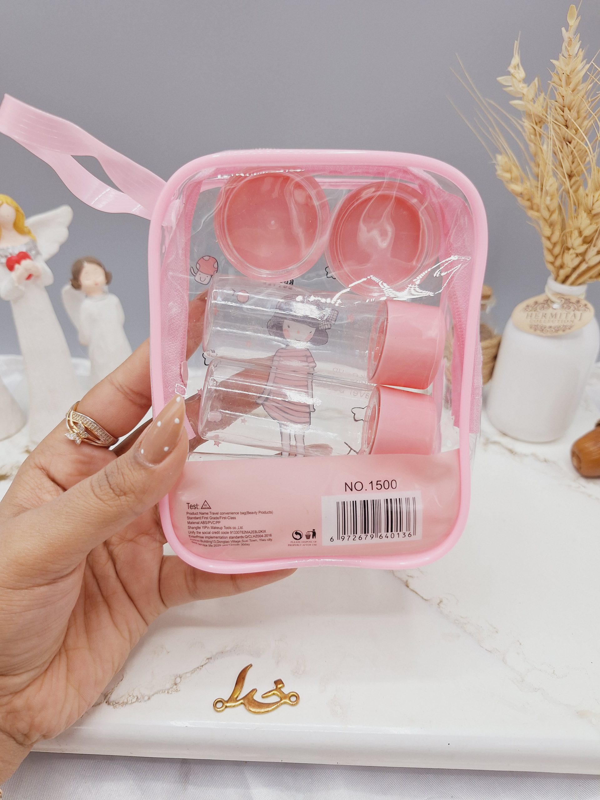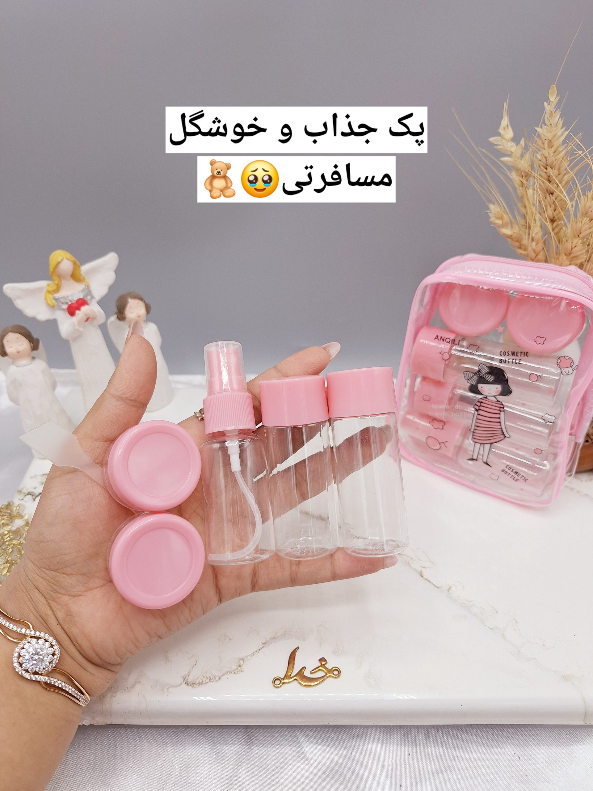 ست مسافرتی پنج تیکه طرح دختر شامل 2 عدد بطری، 1 عدد اسپری، دو عدد ظرف کوچک، قاشقک و قطره چکان، کیف فانتزی می باشد و ظرف اسپری مناسب استفاده برای تونر و الکل، بطری مناسب استفاده برای شامپو و ماسک مو، دوعدد ظرف کوچک مناسب استفاده برای انواع کرم قاشقک و قطره چکان برای استفاده آسان می باشد.