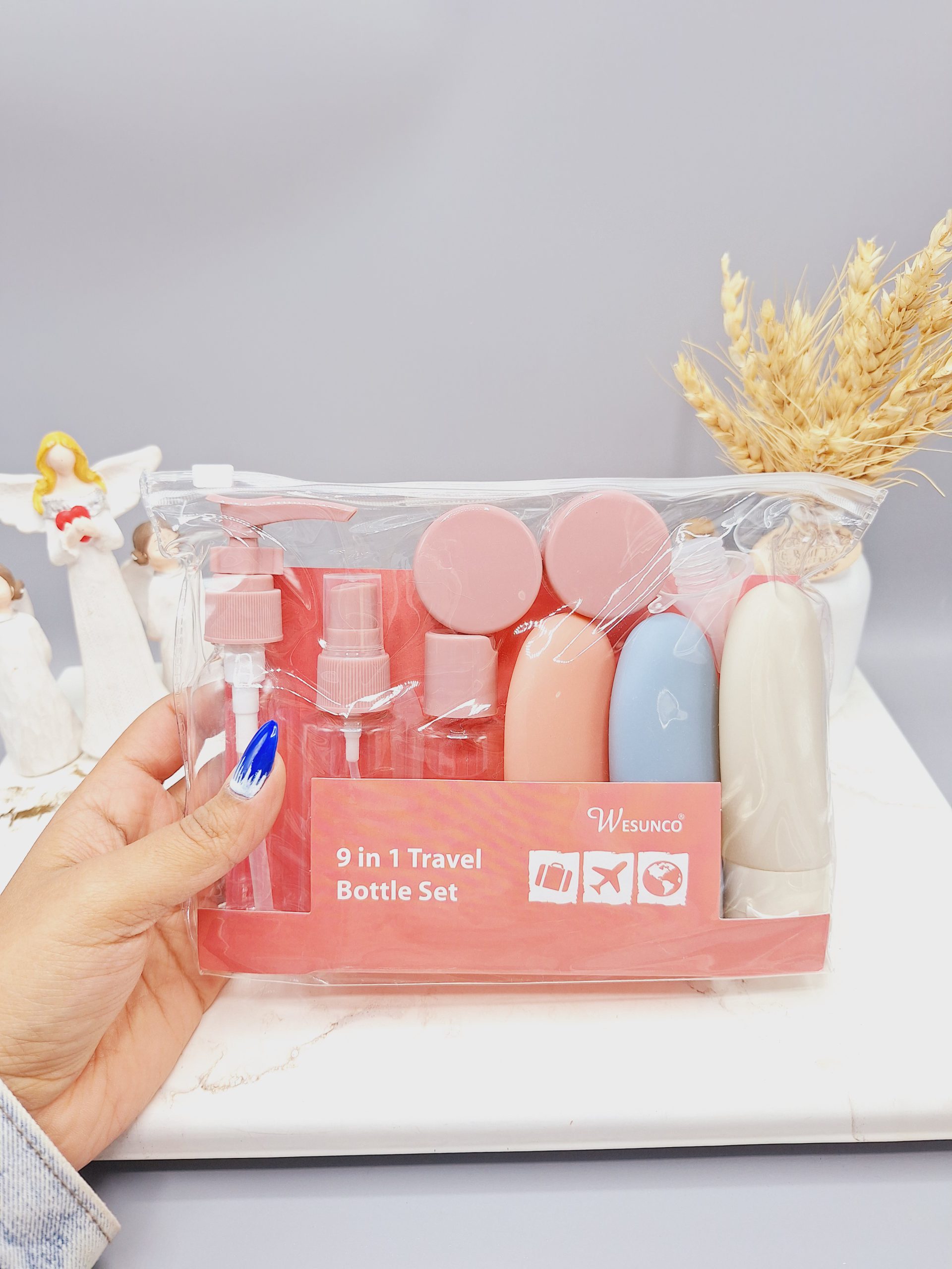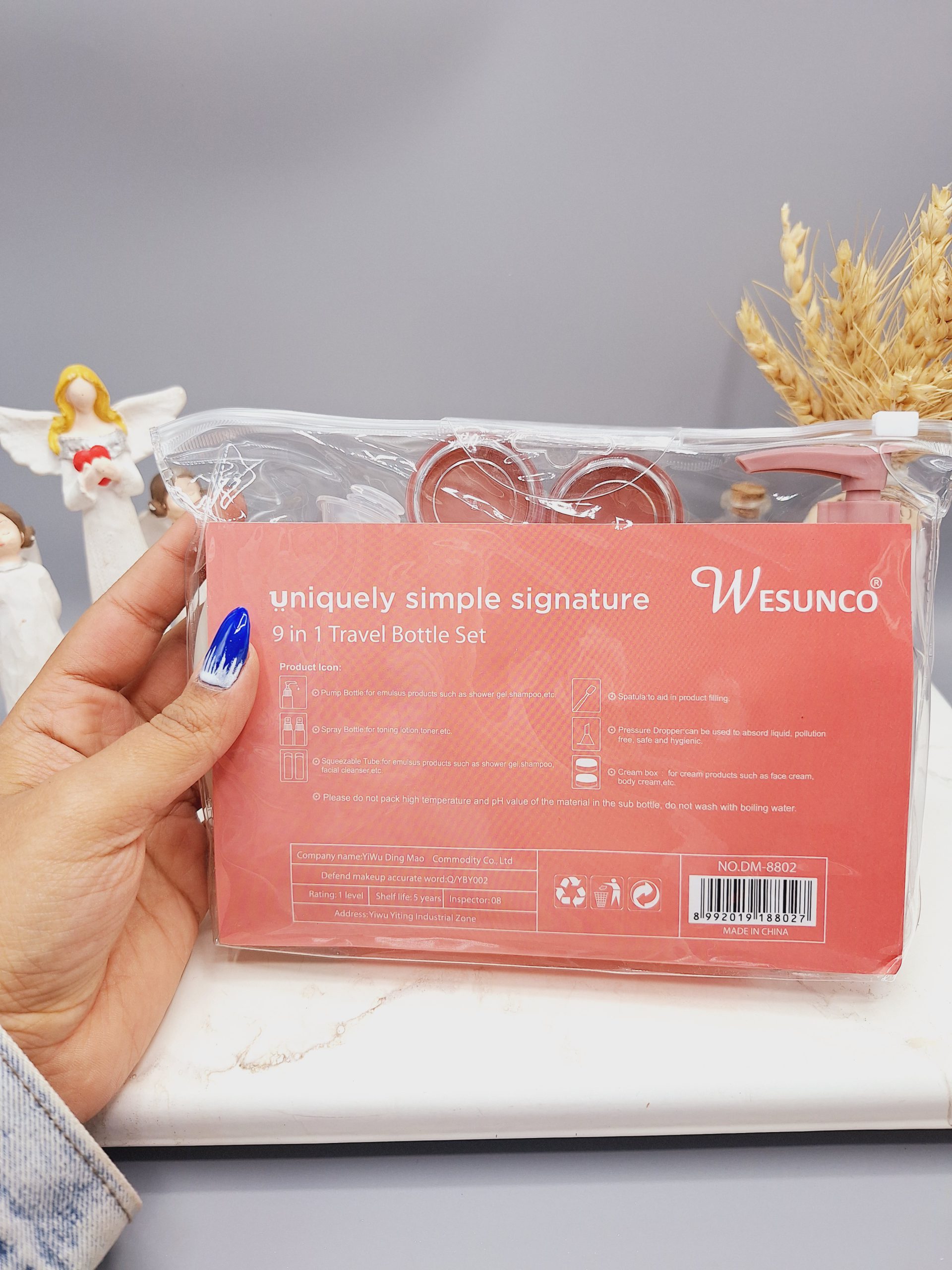 ست مسافرتی 9 تکه WESUNCO دارای 7 محفظه بهمراه یک کاردک و قیف کوچک است که هنگام سفر مورد نیاز شماست. مواد آرایشی و بهداشتی خود از قبیل عطر، کرم پودرها و شسشتو دهنده پوست و مو را داخل این پک مسافرتی قرار داده و به هراه خود ببرید. با استفاده از این ست مسافرتی حجم کلی مواد آرایشی مصرفی کاهش می‌یابد و به راحتی با اشغال کمترین فضا داخل کیف شخصی شما جا می‌شود. می‌توانید از ظرف پمپی برای محصولاتی از قبیل شاورژل و شامپو، از 2 اسپری کوچکتر برای تونر، لوسیون و ..، از 2 بطری کوچکتر برای شاورژل، شامپو و شوینده صورت و از دو ظرف درب دار برای کرم ها صورت و بدن استفاده کنید. از اسپولی و قیف نیز برای ریختن محصولات درون ظرف ها استفاده کنید. نکته: قبل از استفاده از این محصولات داخل آن‌ها کامل شسته شود. نگهداری محصول: از ریختن مایع داغ مثل آب جوش در بطری‌ها خودداری شود. ست مسافرتی را نزدیک و یا زیر نور مستقیم خورشید قرار ندهید. توصیه میشود با استفاده از الکل و یا آب لوله کشی محصول را تمیز کنید.