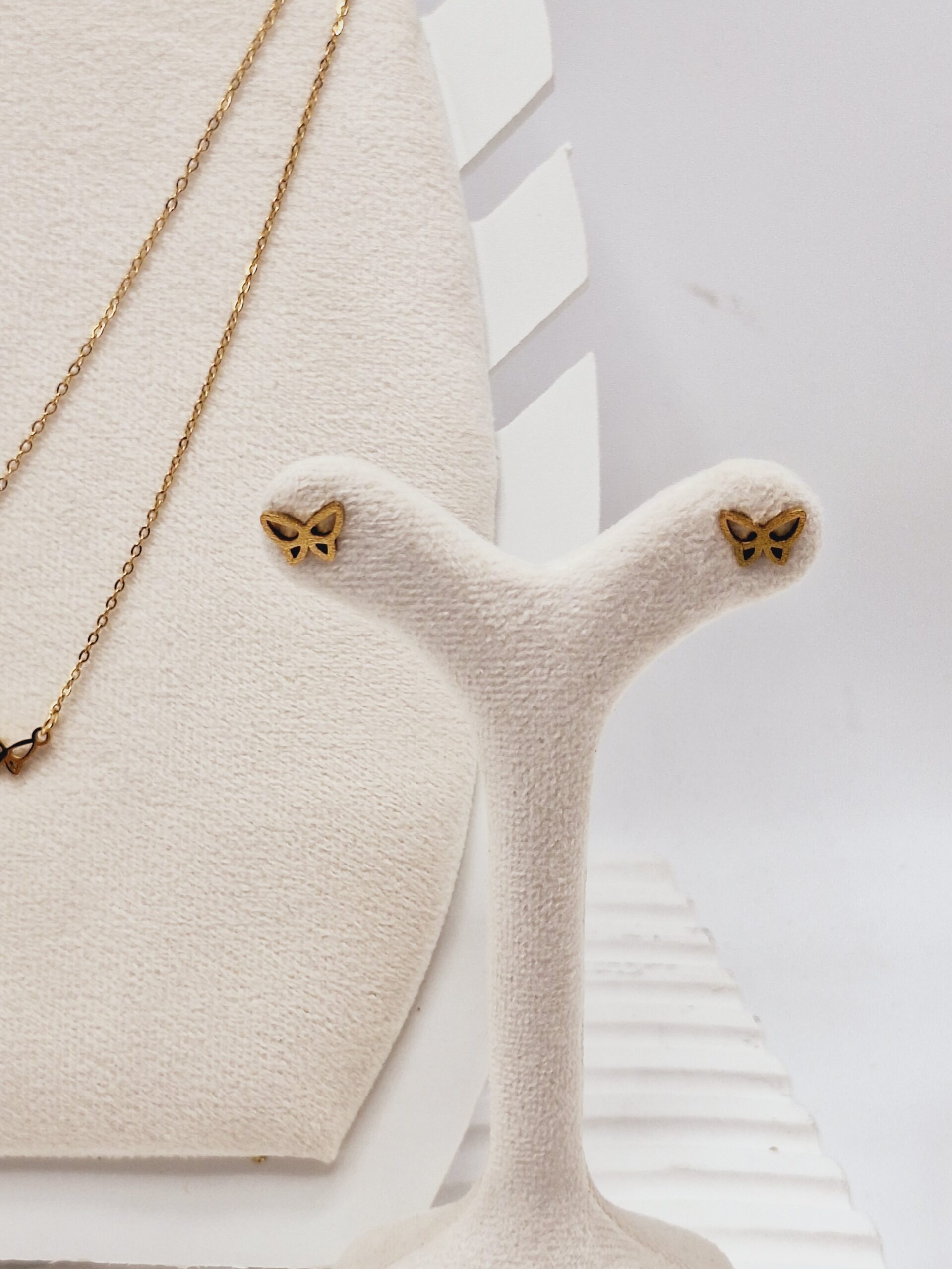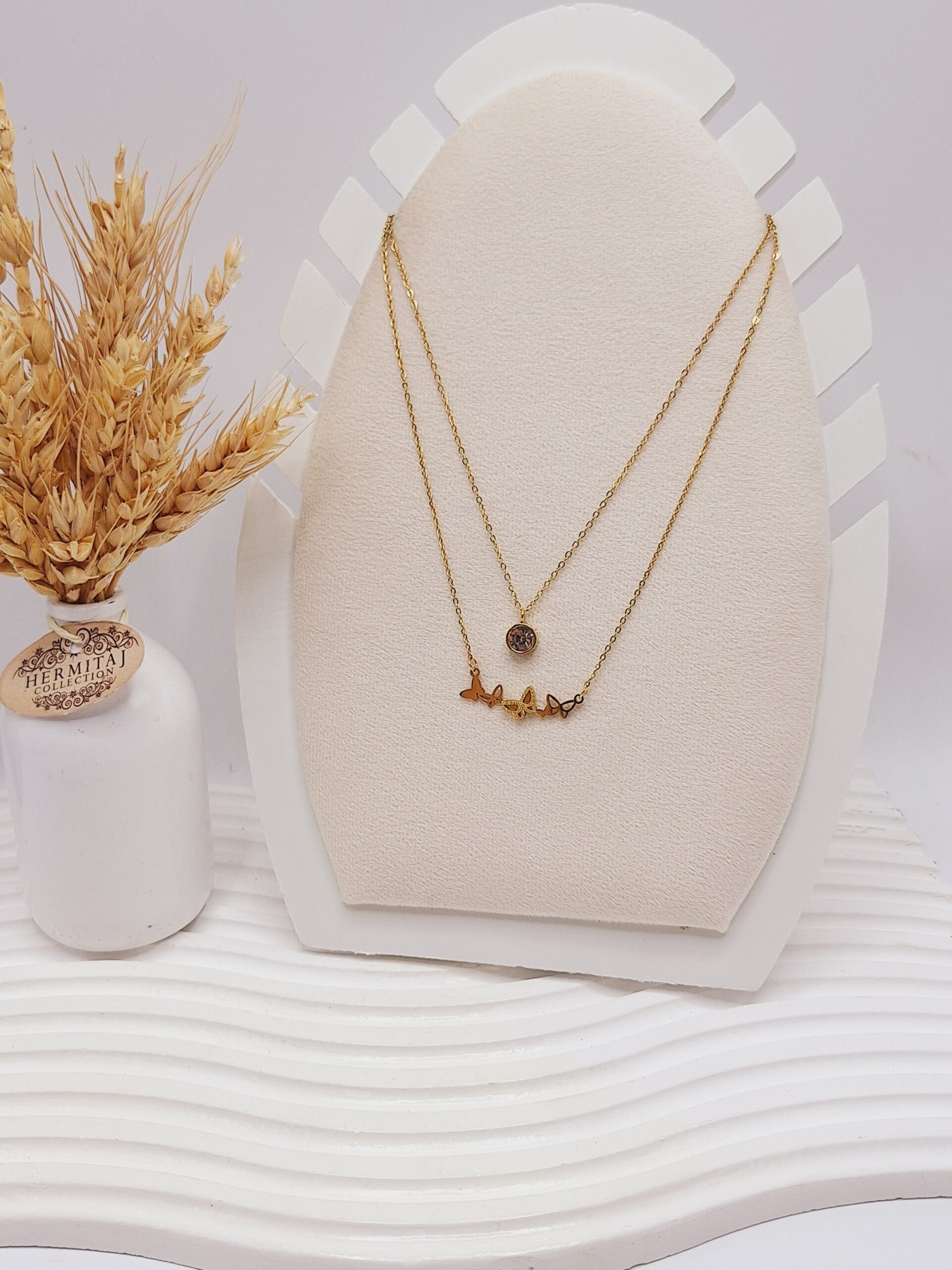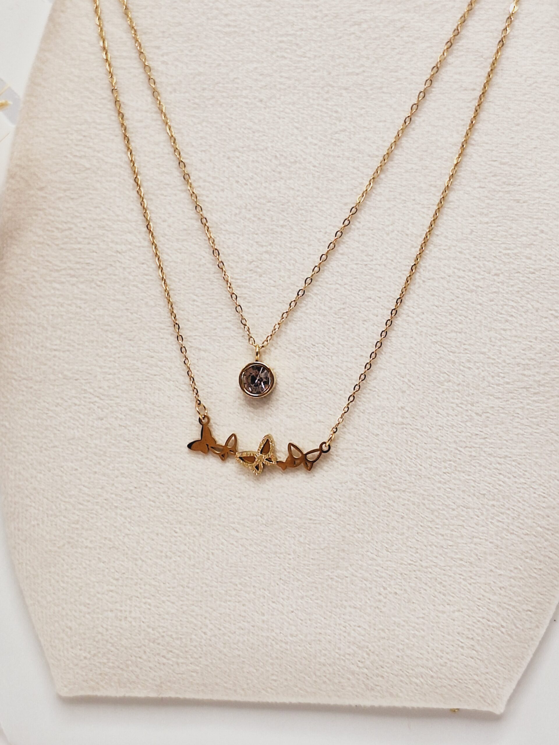 💖 ست گوشواره و گردنبند دو لاین پروانه‌های ریز و آویز نگین‌دار طلایی استیل – الهام گرفته از ✨ رقص نور روی بال‌های پروانه‌های ظریف 🌸 طراحی شیک، دخترونه و رومانتیک برای خانم‌هایی که عاشق جزئیات مینیمال و جذاب هستند 💎 فلز طلایی استیل ضد حساسیت و مقاوم در برابر تغییر رنگ 💫 سبک و راحت، جلوه‌ای دوست‌داشتنی روی گردن و گوش 🛍 مناسب همه کسانی که عاشق زیورآلات ظریف و پرانرژی هستند 🎀 رطوبت حمام و الکل زیبایی اکسسوری رو از بین میبره ❗️