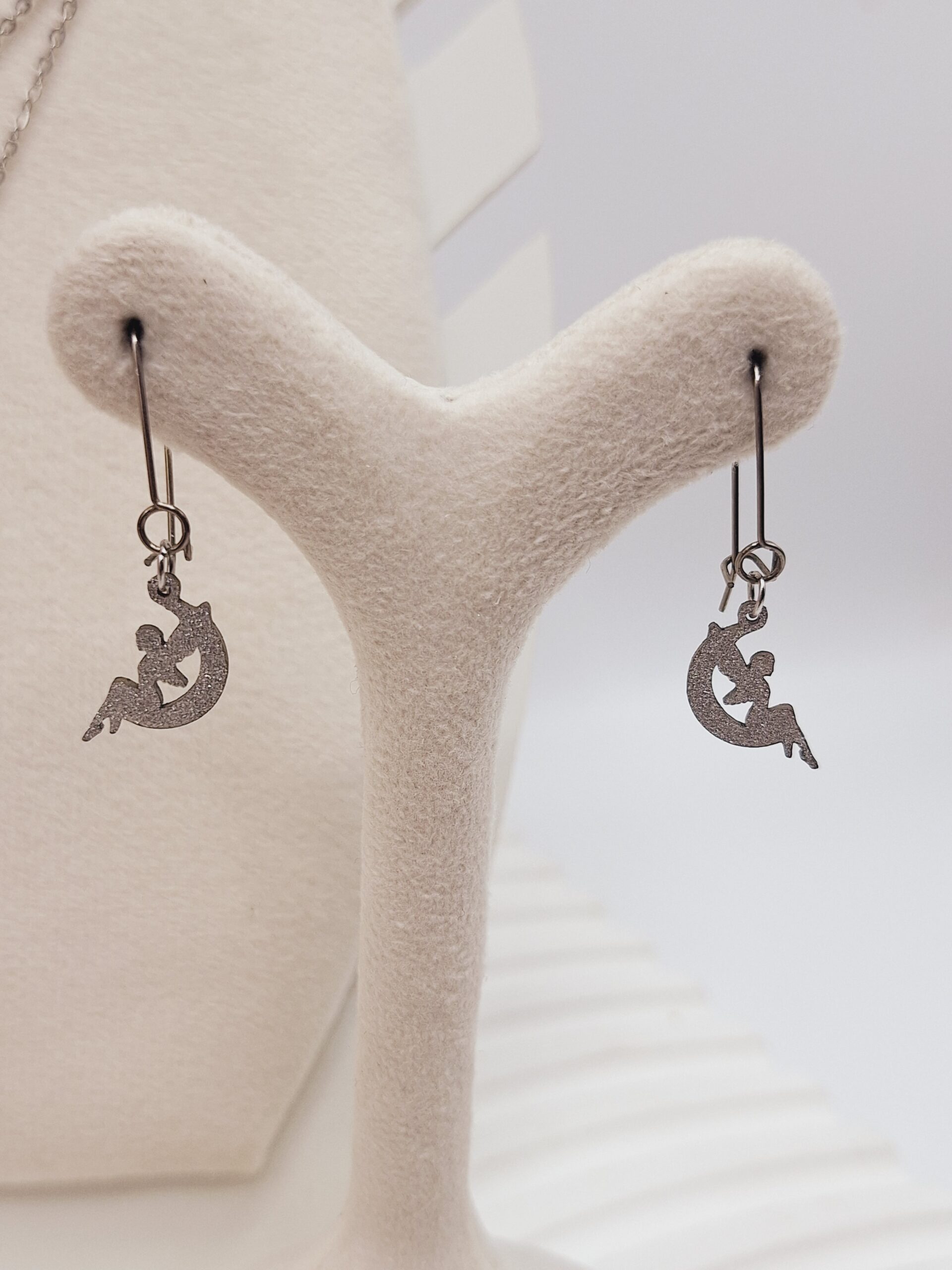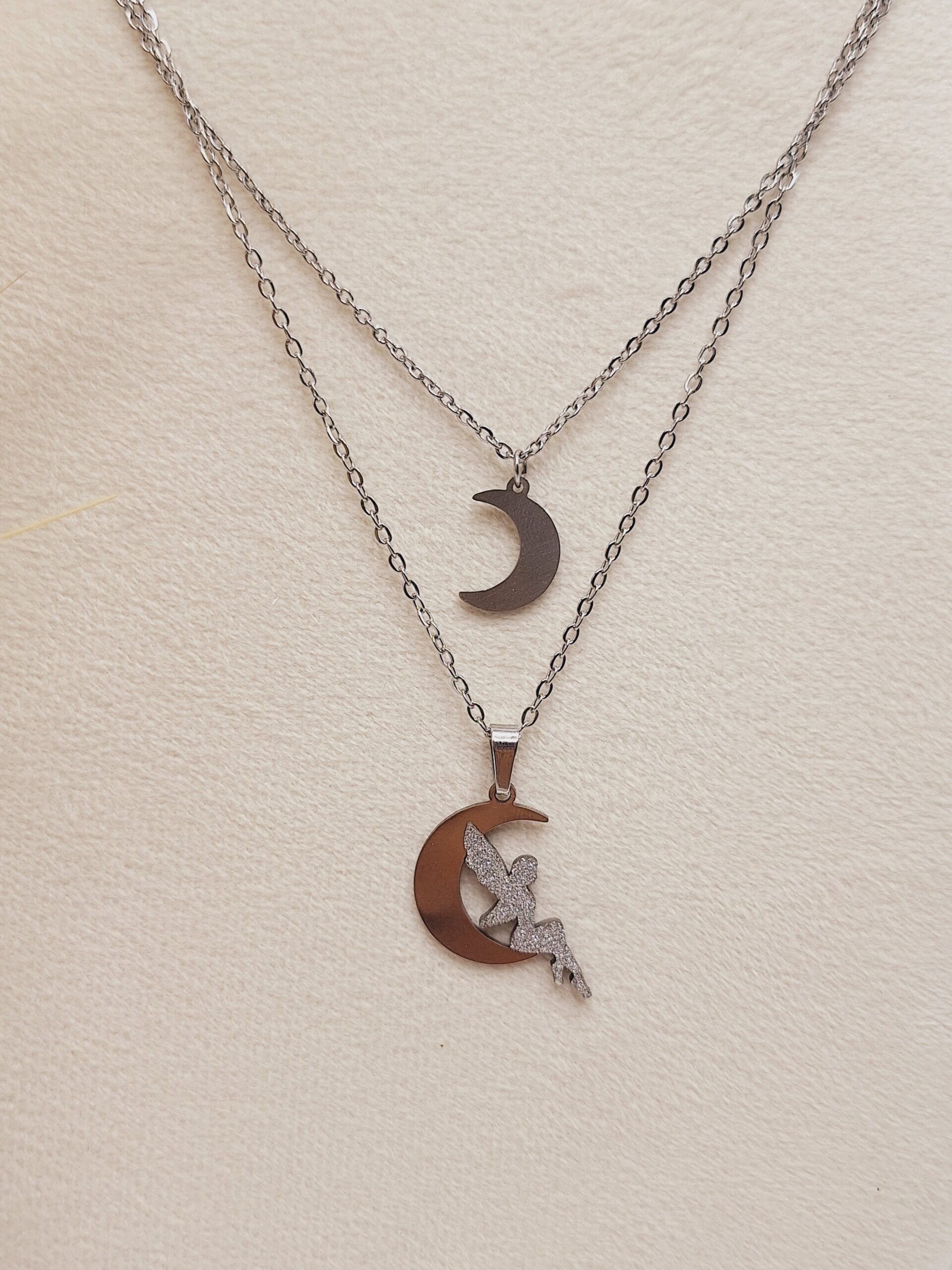 ست گوشواره و گردنبند ۲ لاین طرح فرشته و ماه نقرهای استیل یک مجموعه اکسسوری شیک و فانتزی است 💎🌙🧚♀️. طراحی ظریف و جنس استیل با کیفیت، جلوهای خاص و درخشان به استایل شما میبخشد و مناسب استفاده در روزمره، مهمانی و هدیه دادن میباشد 🎉🎁