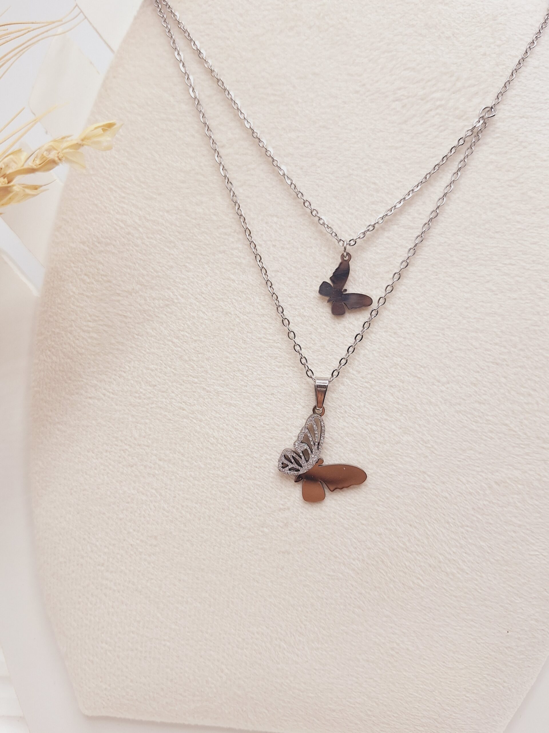 اگه دنبال یه ست شیک، ظریف و فانتزی هستی که استایلت رو خاص و جذاب کنه، ست گوشواره و گردنبند ۲ لاین طرح پروانه مخرجکاری نقرهای استیل دقیقاً همون چیزیه که میخوای ✨🦋💎