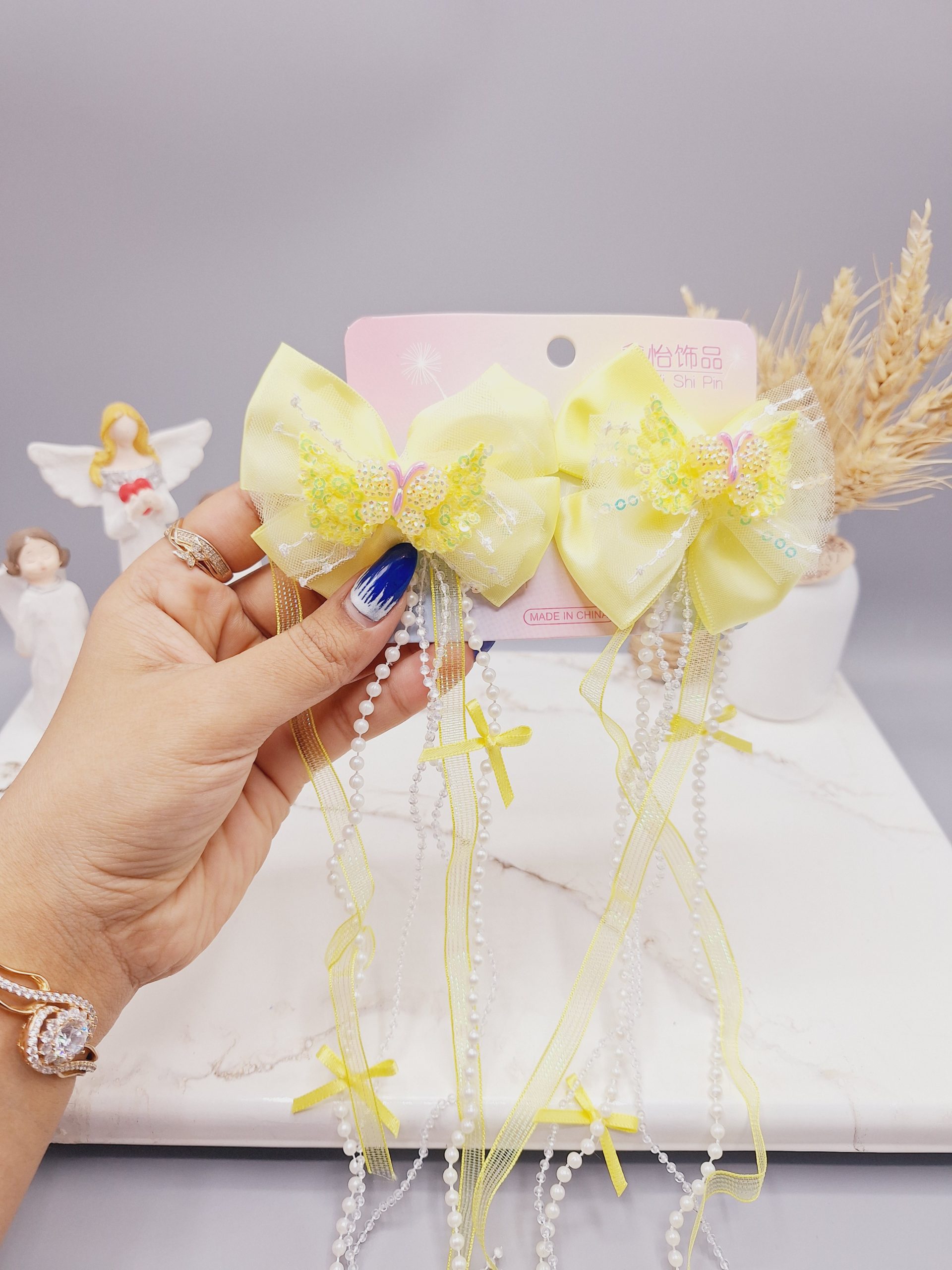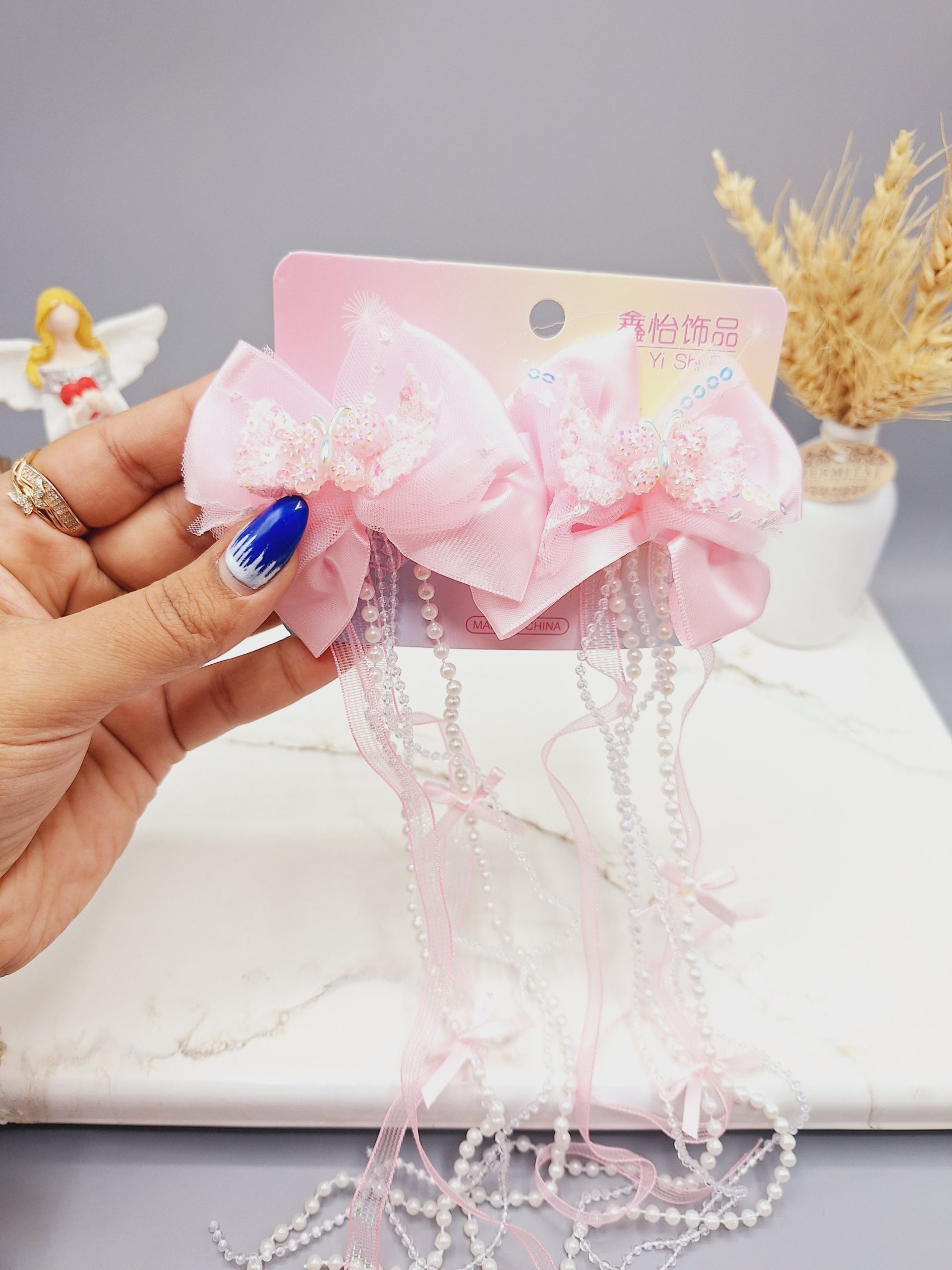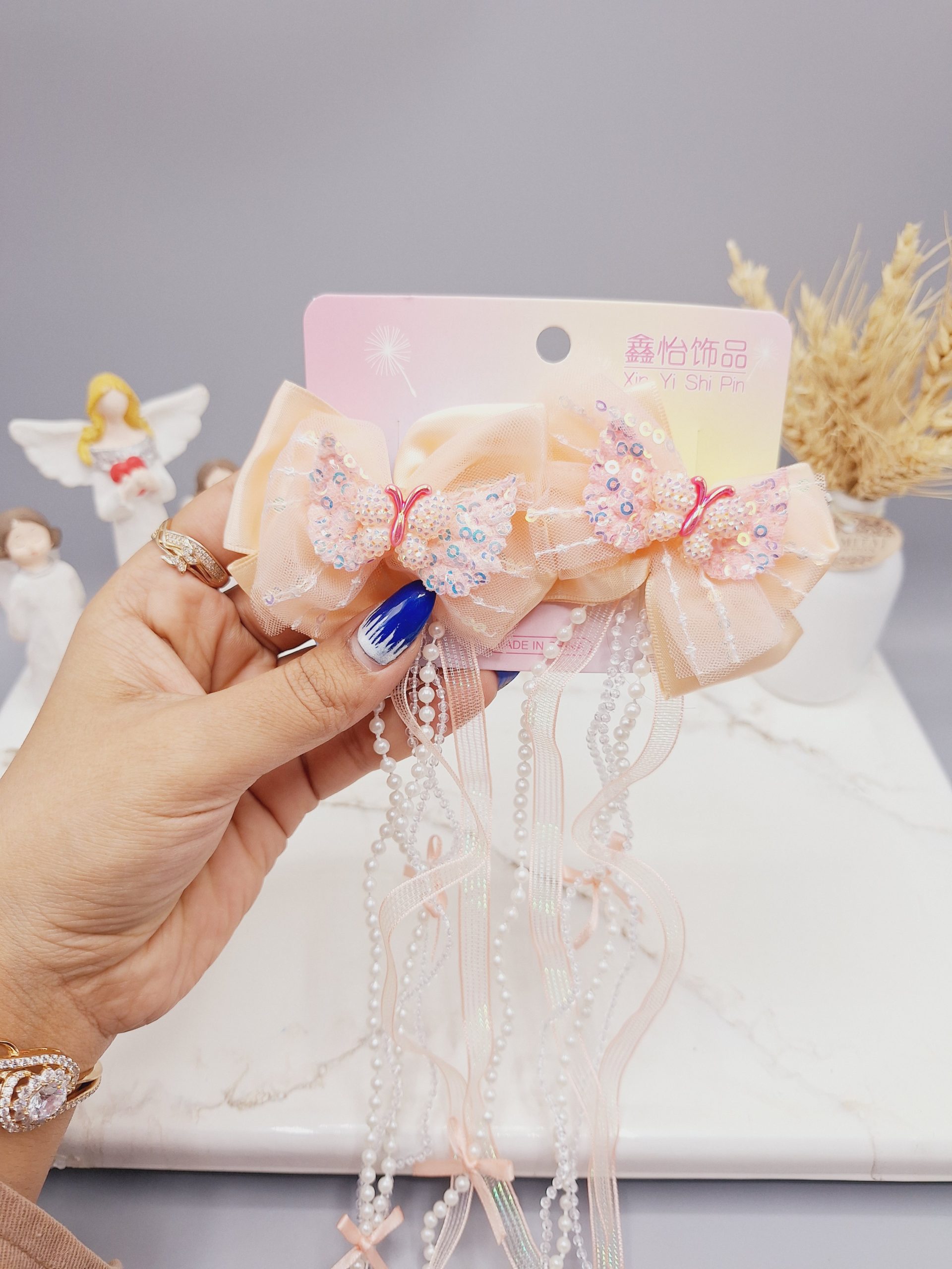 ست 2 تایی گیره مو پاپیونی پولک دار همراه با آویز نواری و نگین دار