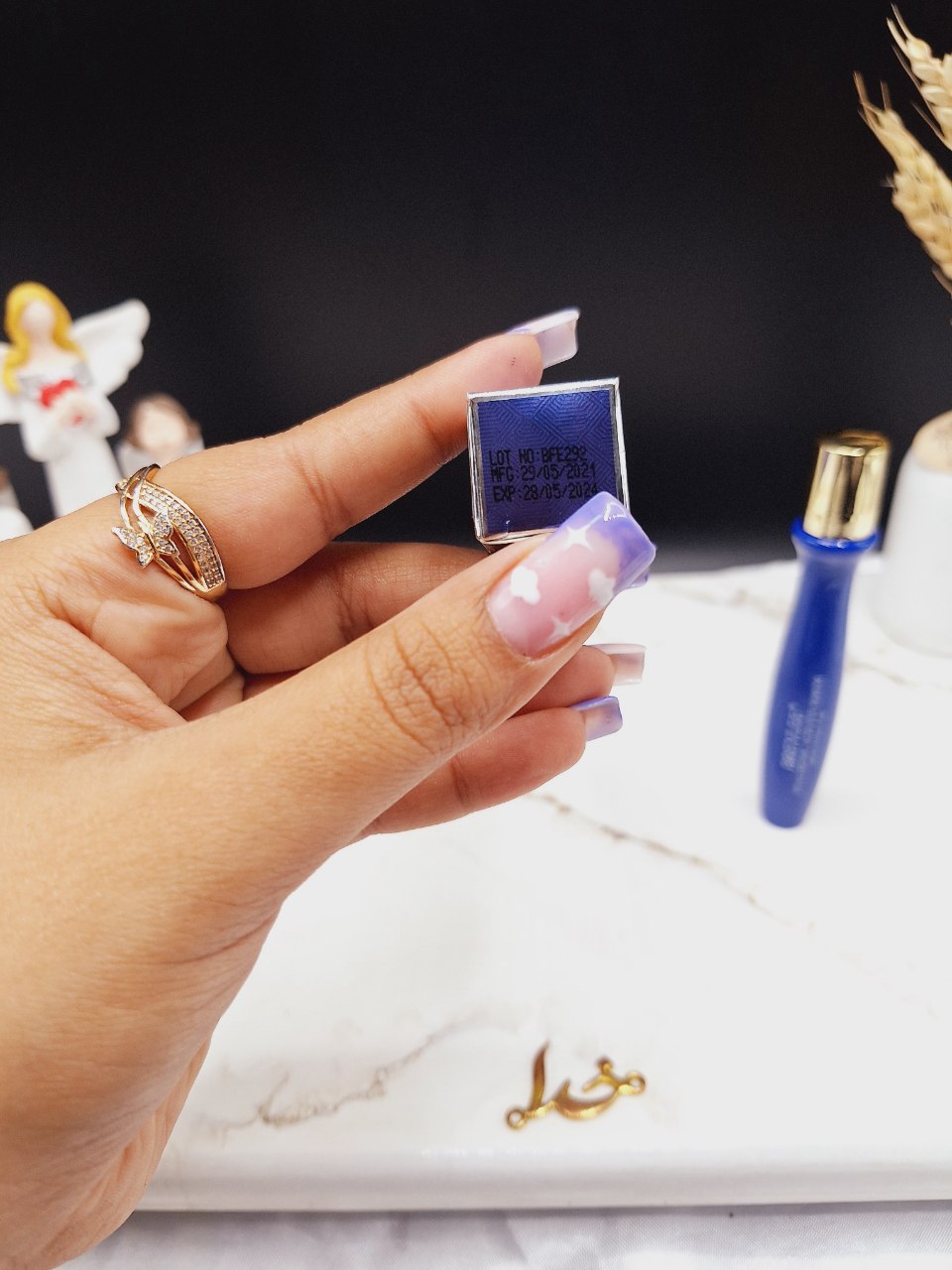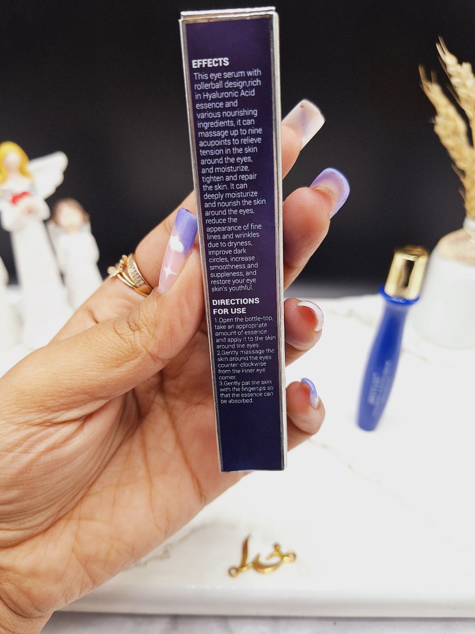 • درب را باز کنید، مقداری مناسب را روی پوست اطراف چشم قرار دهید و با ماساژور خود سرم به آرامی در جهت مرکز ساعت به خارج مرکز ساعت دایره وار (طبق شکل) ماساژ دهید .