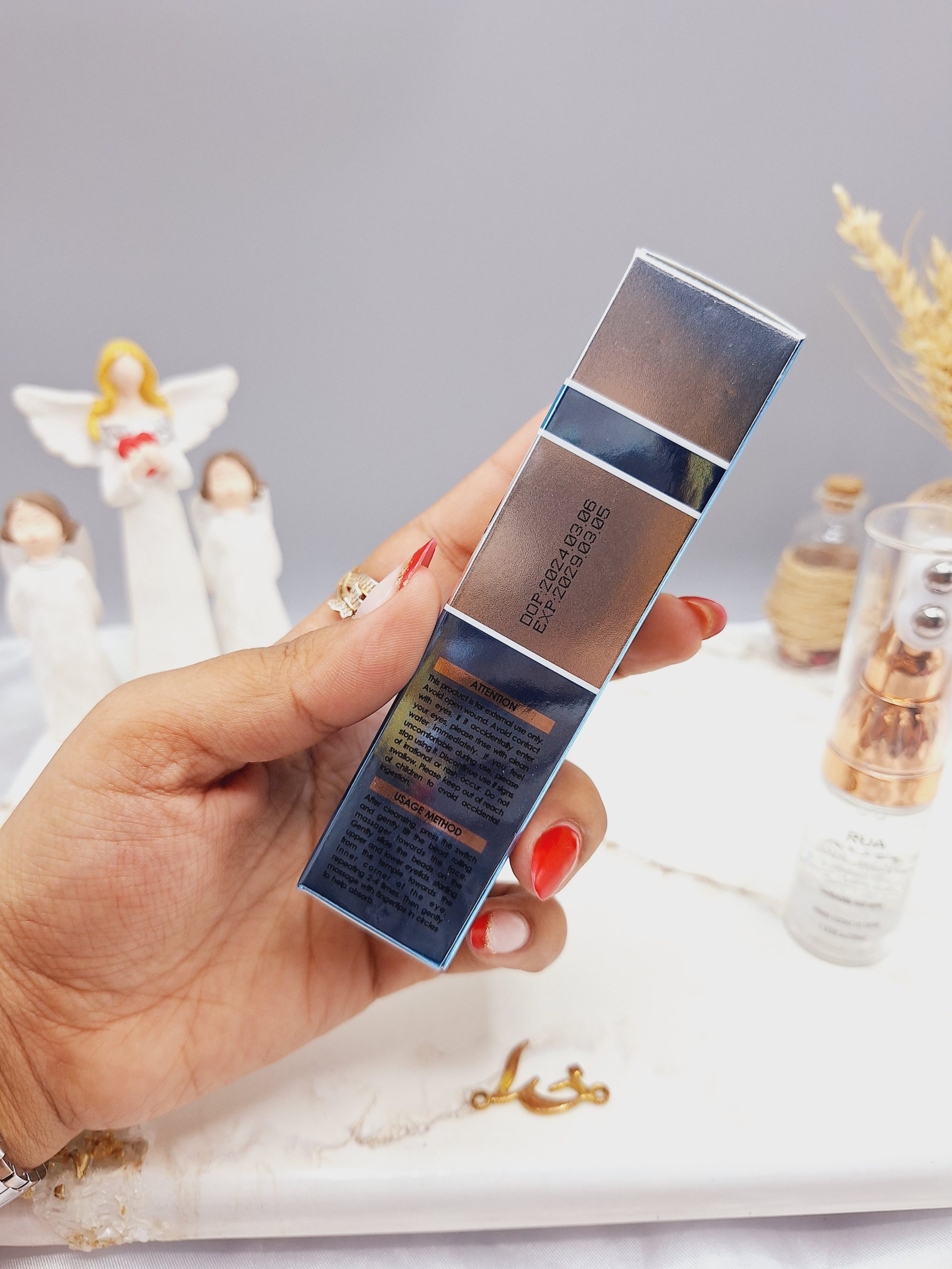 مقدار یک تا دو قطره از سرم را زیر چشم روی استخوان حفره چشم قرار داده با ماساژور فلزی سر سرم به آرامی ماساژ داده و پخش کنید بهتر است جهت ماساژ دور چشم از انتهای چشم به سمت داخل باشد.