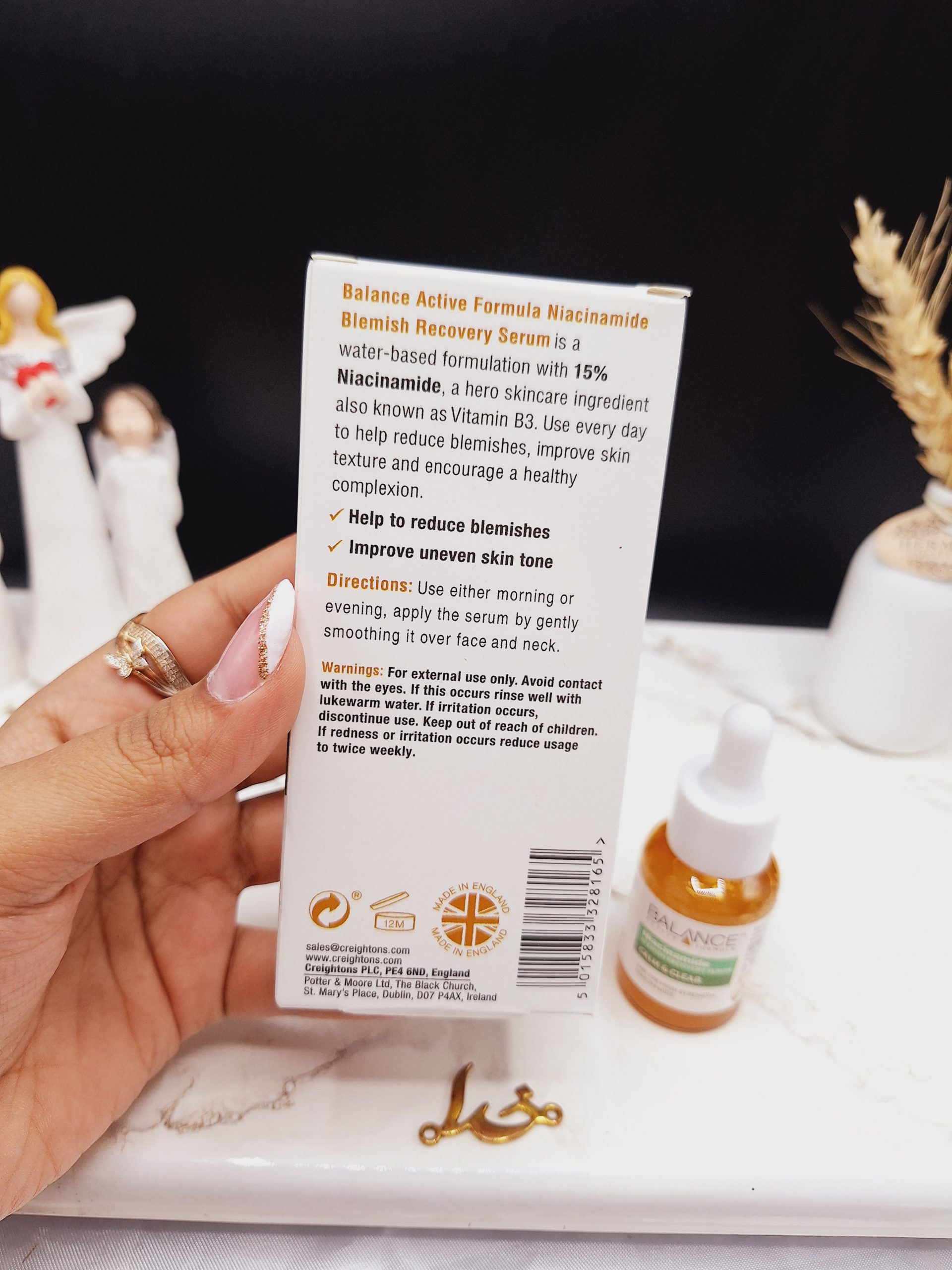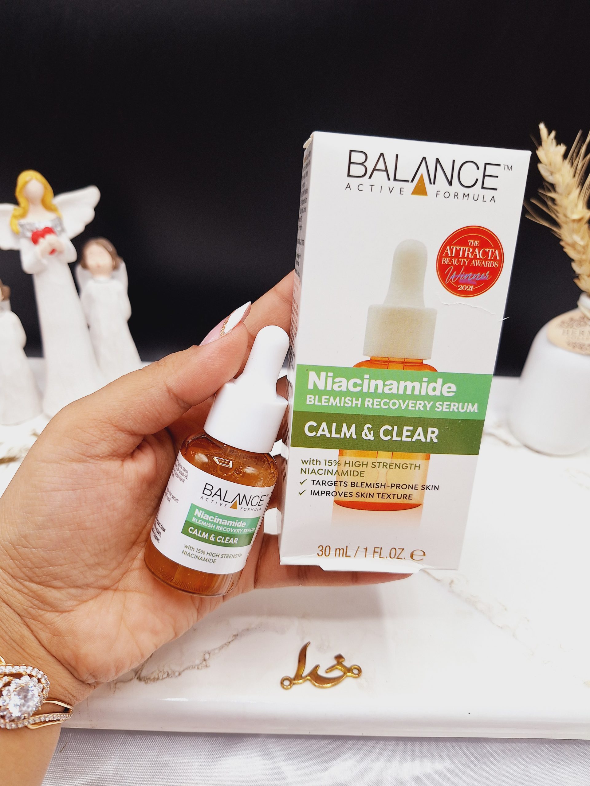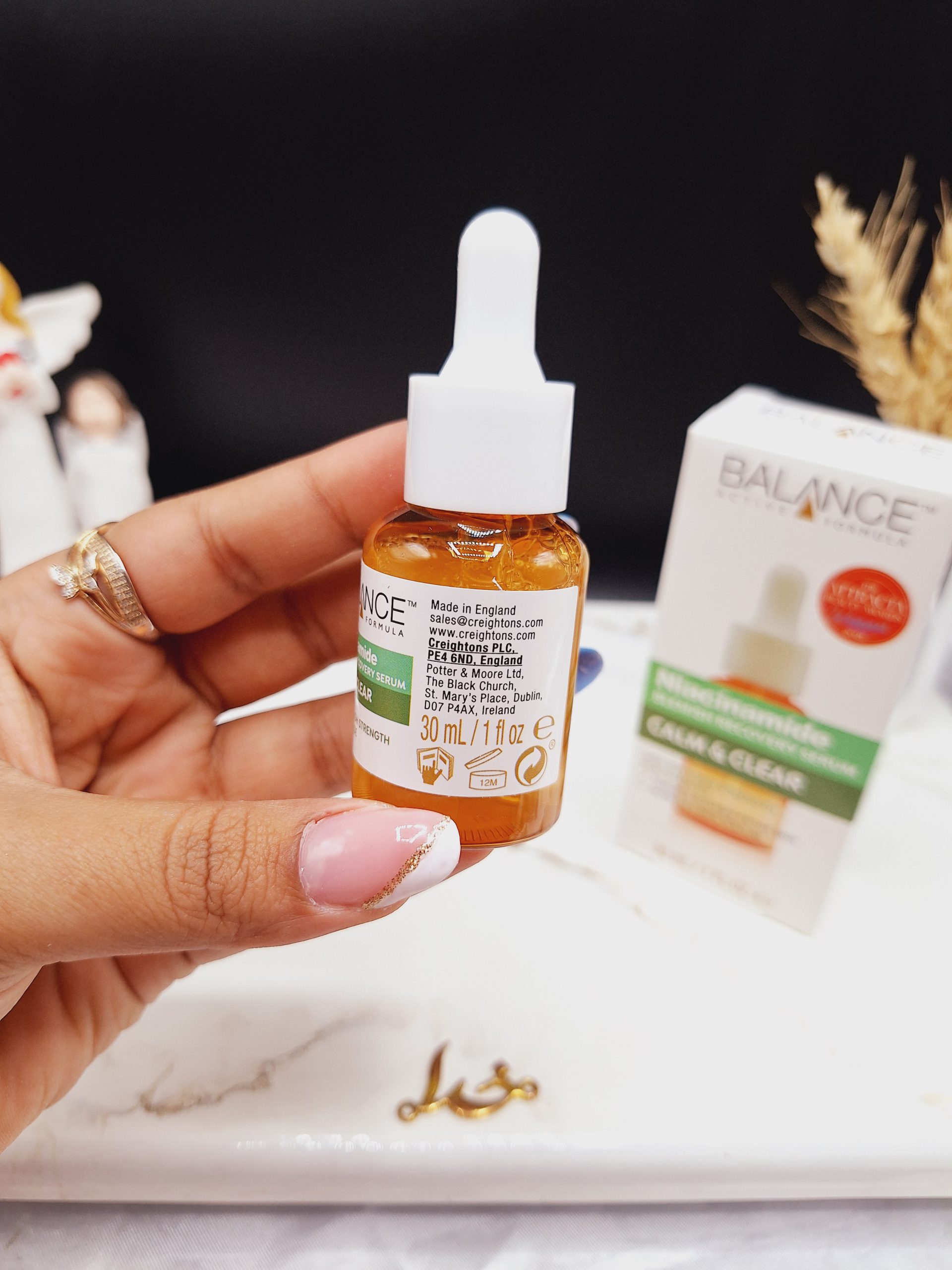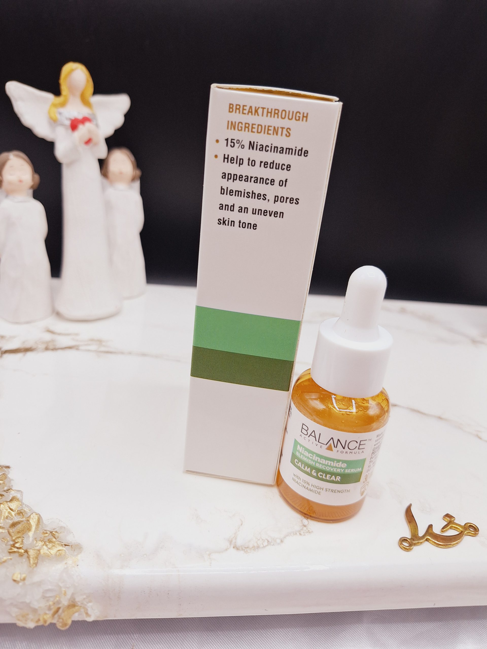 سرم ضد جوش و لک نیاسینامید بالانس Calm & Cler حجم 30 میلی لیتر کد 8165 محصولی از برند ساخت کشور انگلیس Balance می باشد. این سرم حاوی نیاسینامید ۱۵% می‌باشد که به ویتامین B3 نیز معروف است. نیاسینامید به‌کار رفته در این سرم نسبت به سایر محصولات از پایداری و خلوص بالایی برخوردار است. سرم نیاسینامید بالانس به خوبی روی غدد سبابه پوست تاثیر گذاشته و با کاهش منافذ باز پوست، میزان جوش‌های پوست را کاهش می‌دهد.این سرم تیرگی ها و لک های ناشی از جای جوش (اسکار) را از بین می برد. این سرم صورت بالانس با کنترل ترشح چربی پوست و تاثیر مستقیم روی غدد سباسه از ایجاد آکنه و جوش های چرکی جلوگیری می کند.نیاسینامید نوعی ویتامین B3 می باشد که در از بین بردن لک های پوستی، جای جوش، کاهش قرمزی و کم کردن منافذ باز پوست بسیار موثر است. این سرم باعث لطافت، نرمی و صاف شدن پوست می شود. بعد از استفاده از این سرم پوستی صاف، یکدست و مات خواهید داشت. این سرم روی انواع مختلف جوش‌های صورت اعم از آکنه، جوش سرسیاه، جوش‌های زیرپوستی، جوش‌های چرکی و بلوغ تاثیر مستقیم می‌گذارد. این محصول با تمامی پوست‌ها سازگار است. اصلی‌ترین ویژگی این سرم کمک به درمان انواع مختلف جوش و آکنه می‌باشد. این سرم با کاهش منافذ باز پوست میزان ترشح چربی پوست را کنترل کرده و از ایجاد جوش‌های آکنه‌ای جلوگیری می کند. از سایر ویژگی‌های این سرم می ‌توان به جلوگیری از التهاب، کاهش باکتری‌‌های سطح پوست و همچنین کاهش منافذ باز پوست اشاره کرد.   نیاسینامید یکی از گونه‌های مصرفی ویتامین B3 به شمار می رود که نوعی ویتامین محلول در آب است که در مواد غذایی مانند ماهی، گوشت و غلات وجود دارد. مطالعات نشان می‌دهد نیاسینامید یک ماده‌ی موثر برای درمان جوش، روشن کردن پوست و ترمیم آسیب‌های آن است. این ماده با انواع دیگر مواد مراقبتی پوست از جمله رتینول، هیالورونیک اسید و انواع آنتی اکسیدان‌ها سازگار است.   از دیگر خواص نیاسینامید می‌توان به نقش آن در ساختن سرامید توسط سلول‌های پوستی اشاره کرد. سرامیدها زنجیره طویلی از اسیدهای چرب هستند که باعث جلوگیری از از دست رفتن رطوبت پوست و خشکی آن می‌شوند و لایه خارجی پوست را از پیری و ایجاد چروک در امان نگه می‌دارند. درواقع ماده نیاسینامید باعث حفظ رطوبت در پوست می‌شود.   این ماده توانایی کاهش التهاب و همچنین تنظیم ترشح چربی پوست را دارد. همه اینها به مرور زمان باعث ایجاد پوستی سالم و یکدست می‌شوند. این ماده رنگ پوست ناهموار را بهبود می‌بخشد و اندازه منافذ پوست را کاهش می دهد.   علاوه‌بر آنچه گفته شد، مطالعات جدید نشان می دهد که نیاسینامید از سرطان‌های پوستی جلوگیری می‌کند و همین موضوع آن را به ماده مهمی برای مراقبت از پوست شما تبدیل کرده است. همچنین تحقیقات جدید حاکی از آن است که نیاسینامید منجر به روشن شدن پوست می‌شود. این محصول به خوبی انواع مختلف جوش را از بین برده و با کاهش منافذ باز پوست، میزان چربی پوست را کنترل می‌کند. بافت سبک، رقیق، محلول در آب و بدون چربی سرم صورت نیاسینامید بالانس باعث افزایش قدرت جذب و نفوذ بهتر آن به لایه های عمقی پوست شده است. همچنین به دلیل بافت سبک و رقیق باعث احساس سنگینی و چسبناک بودن روی پوست نمی‌شود.