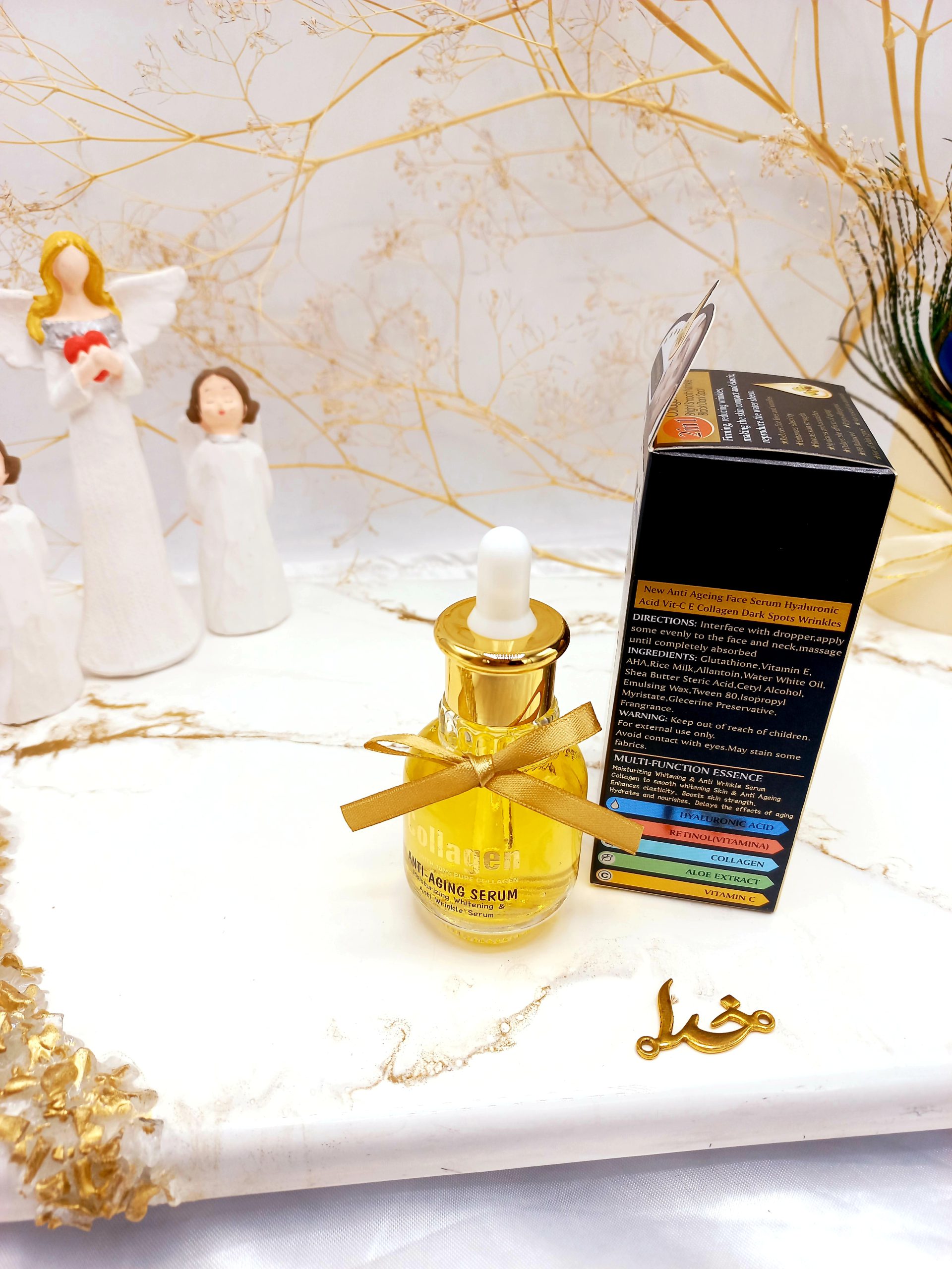 درست است که اصلی ترین ماده های سازنده محصول مورد نظر کلاژن، طلا و کیوتن می باشند، اما ترکیبات دیگری نیز در ساخت آن استفاده شده اند که دانستن آنها می تواند ارزشمندی محصول را بیشتر ثابت کند. مهمترین این ترکیبات به صورت زیر می باشند و لیست کامل آنها را نیز از طریق تصویر زیر می توانید مشاهده کنید.
