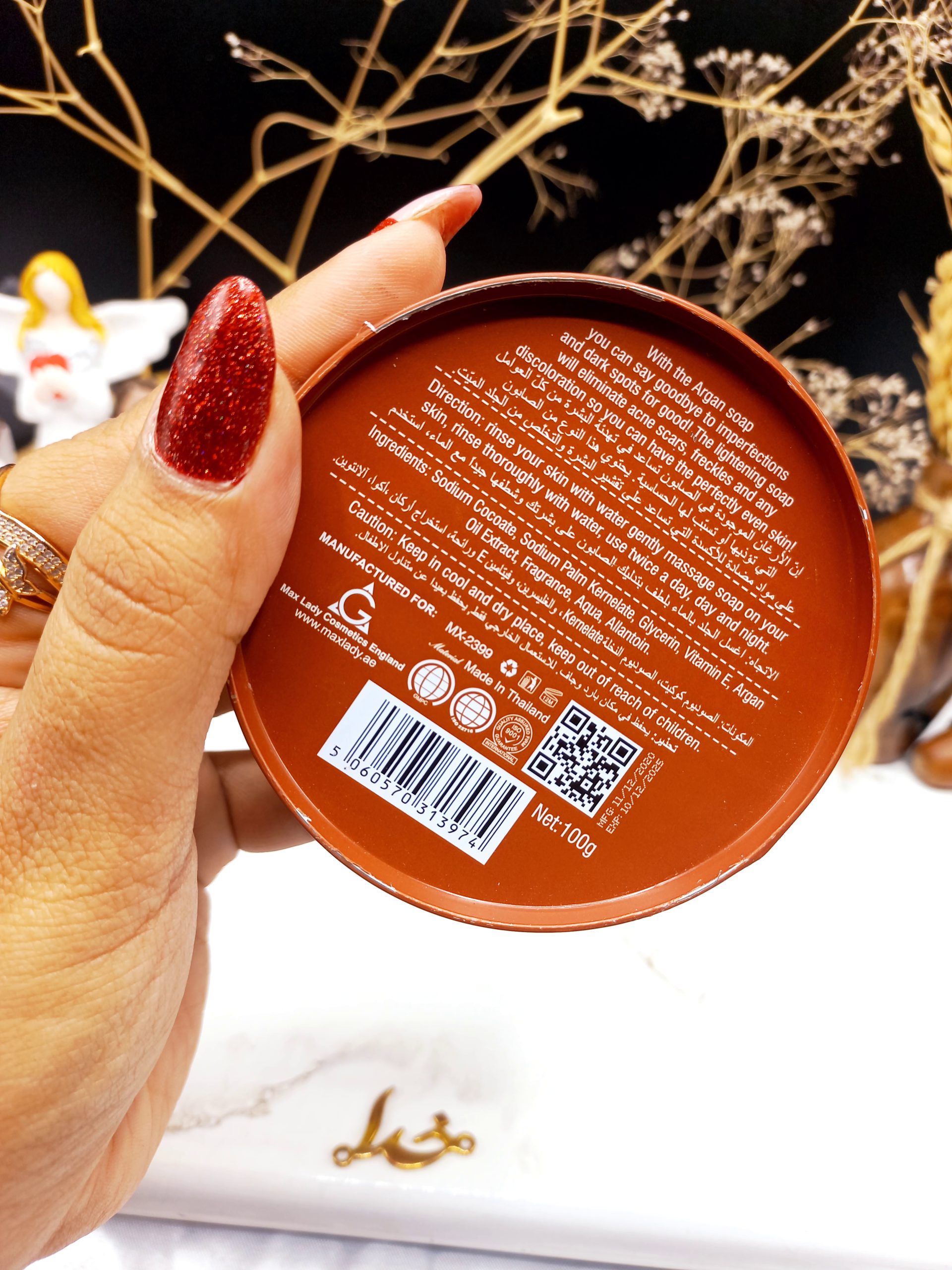 این صابون تحت عنوان صابون MAX LADY ARGAN توسط برند مکسلیدی حاوی عصاره آرگان به بازار عرضه شده است و برای سفید کردن پوست صورت مناسب است.