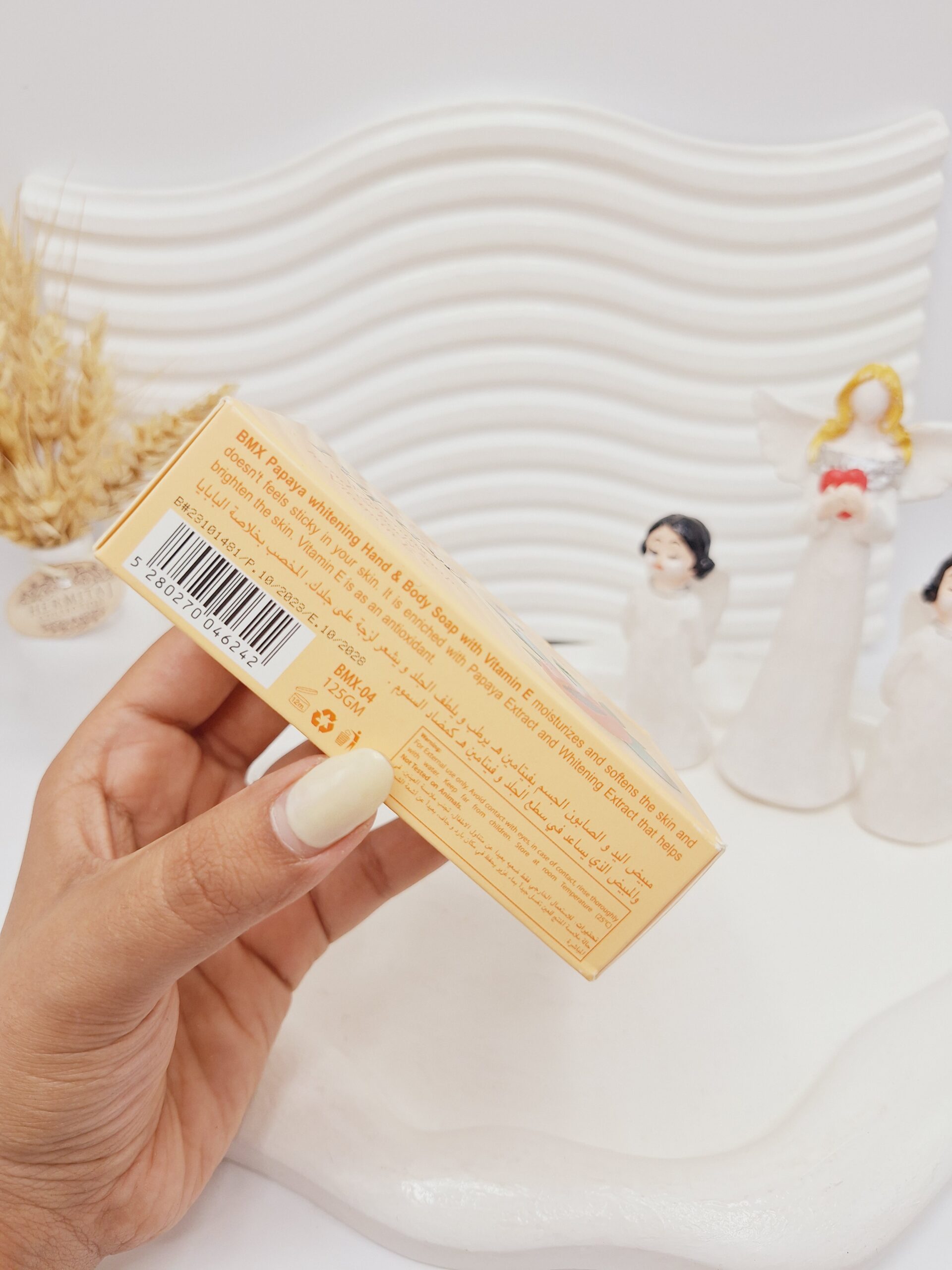 صابون روشنکننده رایحه پاپایا BMX کد 6242، محصولی حرفهای برای روشن و شفاف کردن پوست است 💖🌿