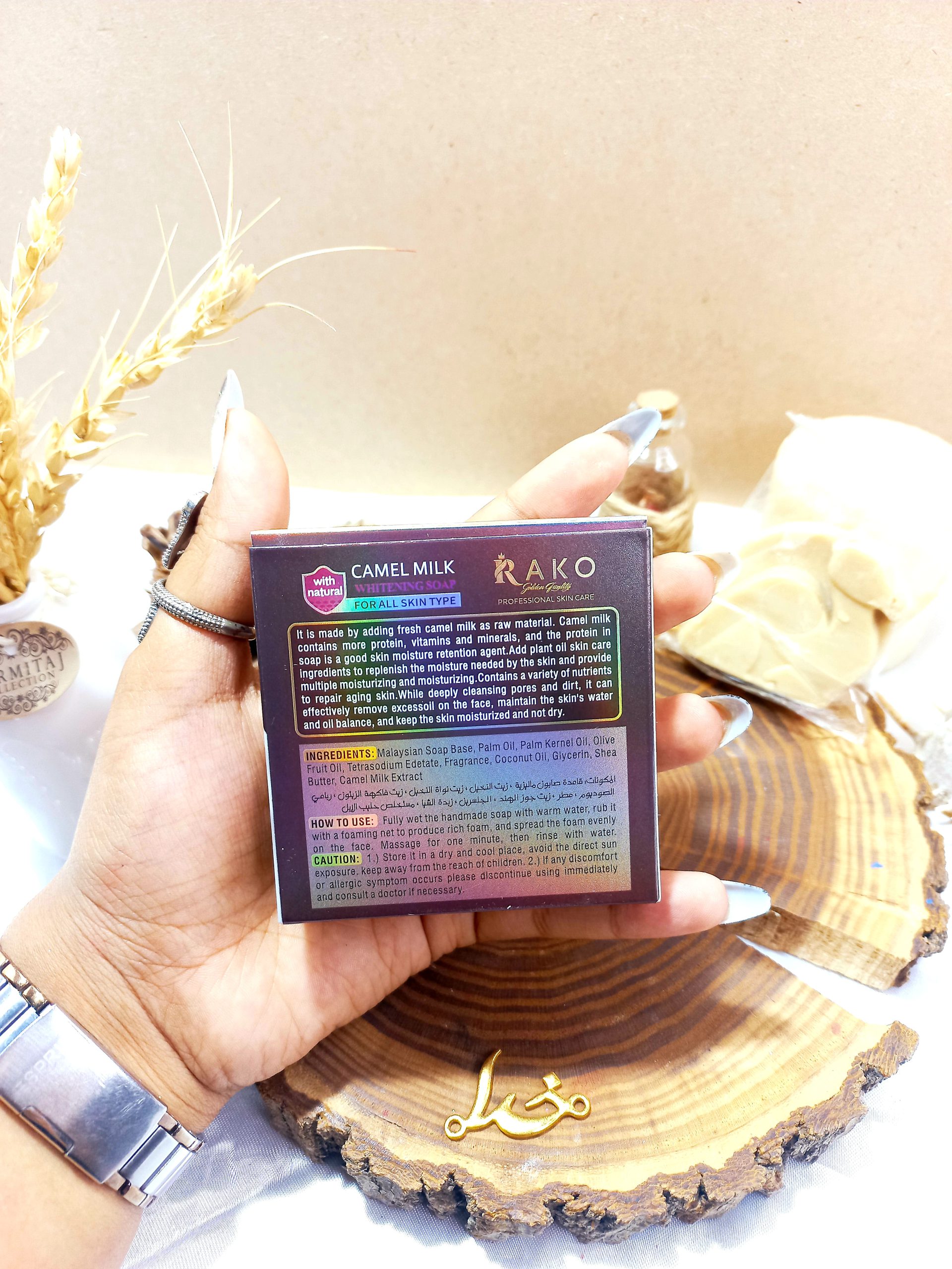 صابون شوینده سفیدکننده شیر شتر راکو RAKO به دلیل دارا بودن چربی شیر شتر و روغن کوهان شتر یک درمان کننده قدرتمند و مهربان