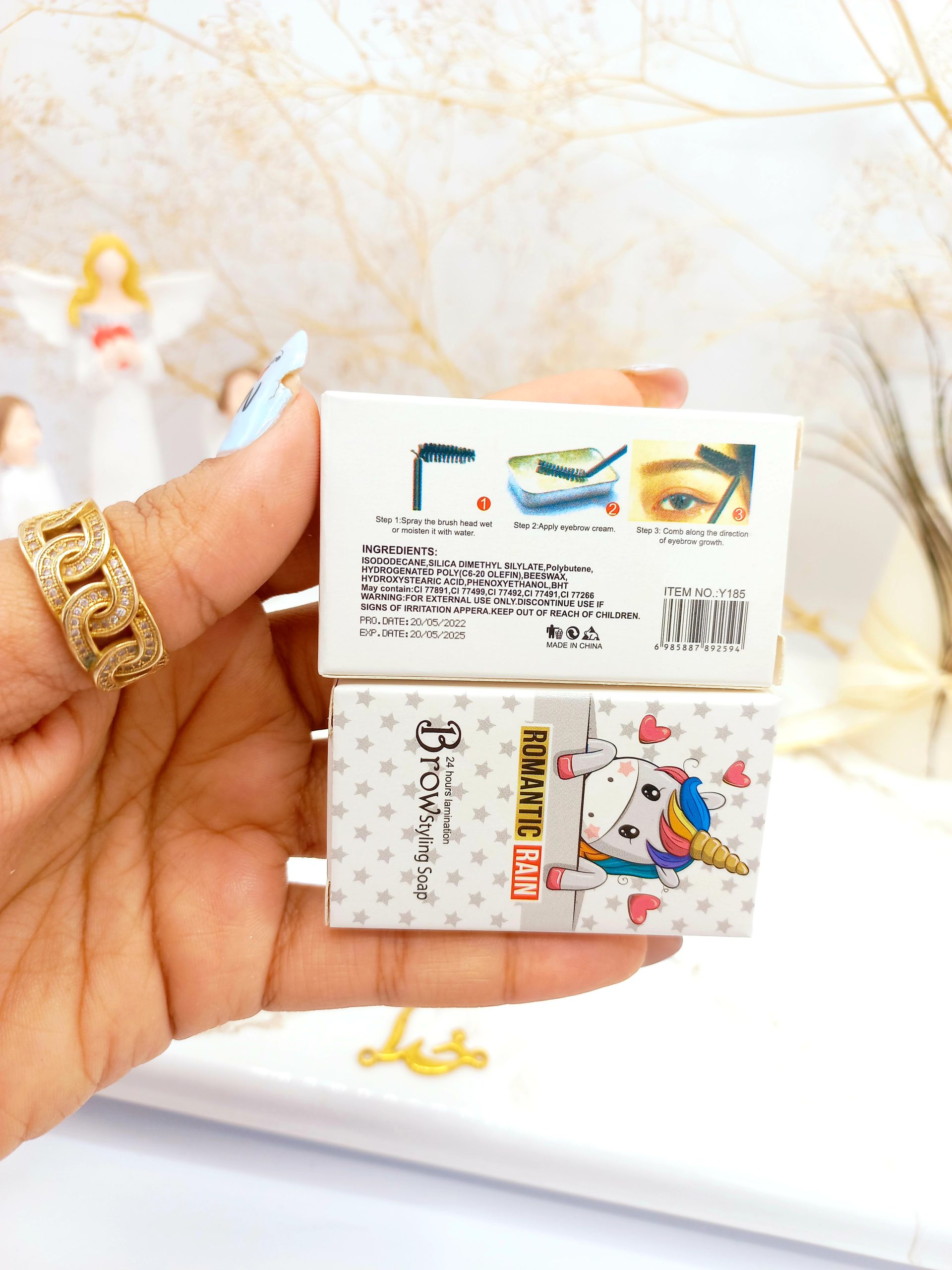 صابون لیفت ابرو 4 بعدی حرفه ای رومانتیک رین ROMANTIC RAIN کد Y185 به شما این امکان را می دهد که بدون نیاز به آرایشگر ابروهای خود را حالت داده و آنها را لیفت نمایید. این صابون دارای بسته بندی فلزی بسیار زیبا و فانتزی است به همراه برس مخصوص با کیفیت عالی دردسترس شما قرار گرفته است. صابون لیفت ابرو رومانتیک رین بی رنگ و شفاف بوده که هنگام استفاده سفیدک نمی زند. این صابون با دارا بودن روغن های گیاهی و اسید چرب و گلسیرین علاوه بر لیفت و دادن فرم دلخواه به ابروها حاوی روغن های مفیدی است که موجب تقویت و پر پشت شدن ابروها می شود که به تقویت ابروها کمک شایانی می کند. این صابون لیفت ابرو 4 بعدی حرفه ای رومانتیک رین ROMANTIC RAIN کد Y185 با داشتن ویتامین E به ترمیم و تقویت ابروها کمک شایانی می کند. این صابون ابرو ماندگاری بالایی را بر روی ابرو دارد و از خشک شدن و شکنندگی موهای ابرو جلوگیری می کند.