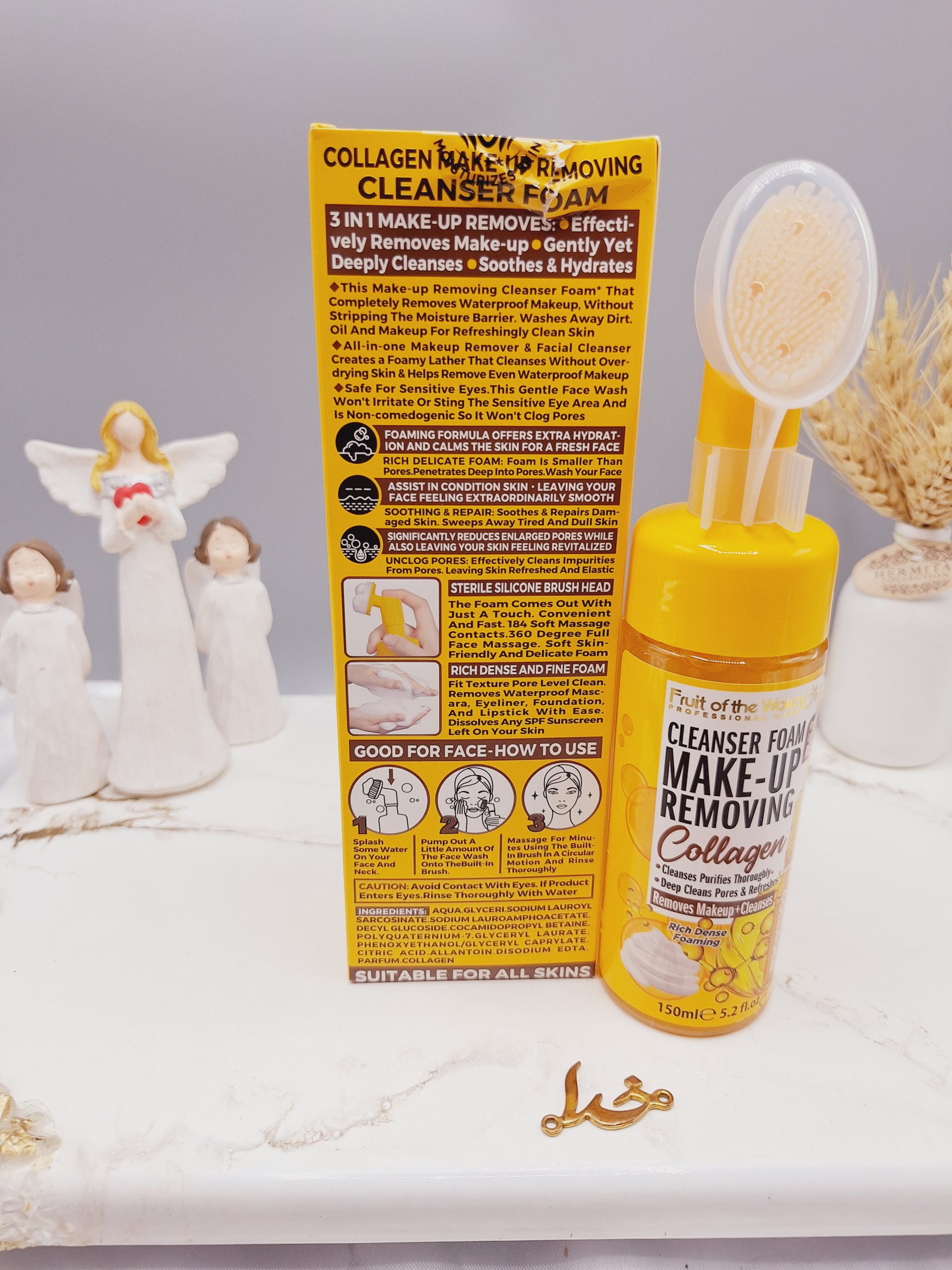 در ترکیبات این فوم از کلاژن شیر ،ویتامین E ،عصاره آلوئه ورا و مولتی ویتامین وجود دارد.از دیگر فوائد موثر این فوم شفاف کنندگی پوست صورت است