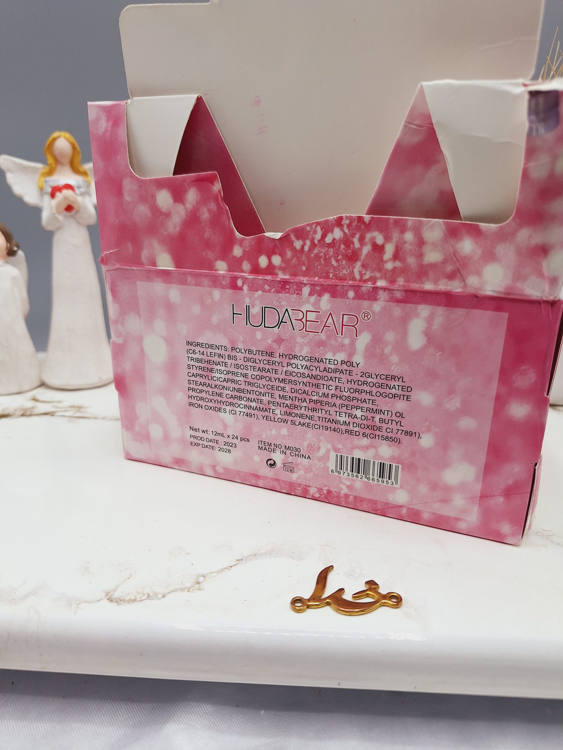 ویژگی های لیپ گلاس گلیتری طرح بطری شامپاین برند هدا بر HUDA BEAR کد M030