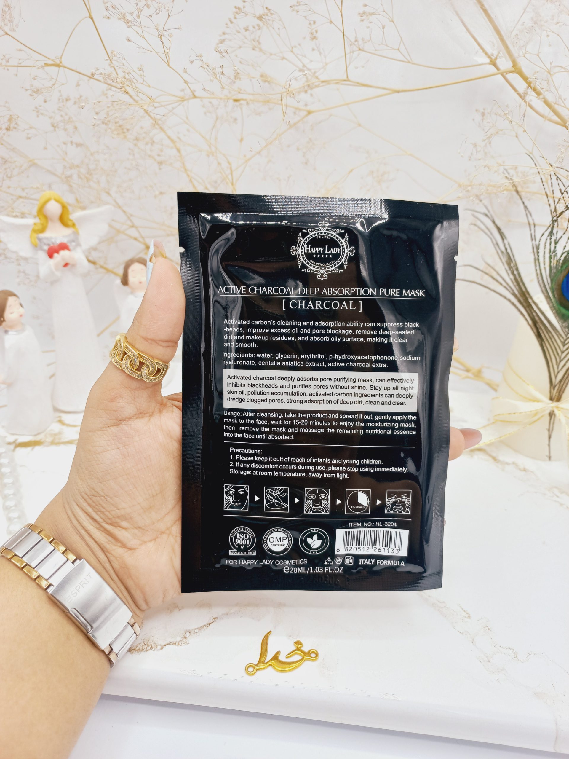 ماسک ورقه ای بستن منافذ زغال کربن هپی لیدی HAPPY LADY کد HL3204 چربی پوست را کنترل نموده و از ایجاد انواع جوشهای سرسیاه و آکنه در پوست جلوگیری می کند. همچنین این ماسک یک آبرسان و مرطوب کننده بسیار قوی برای پوست شما خواهد بود. همچنین از پارچه ی کاملا طبیعی بوده و ضد حساسیت است.