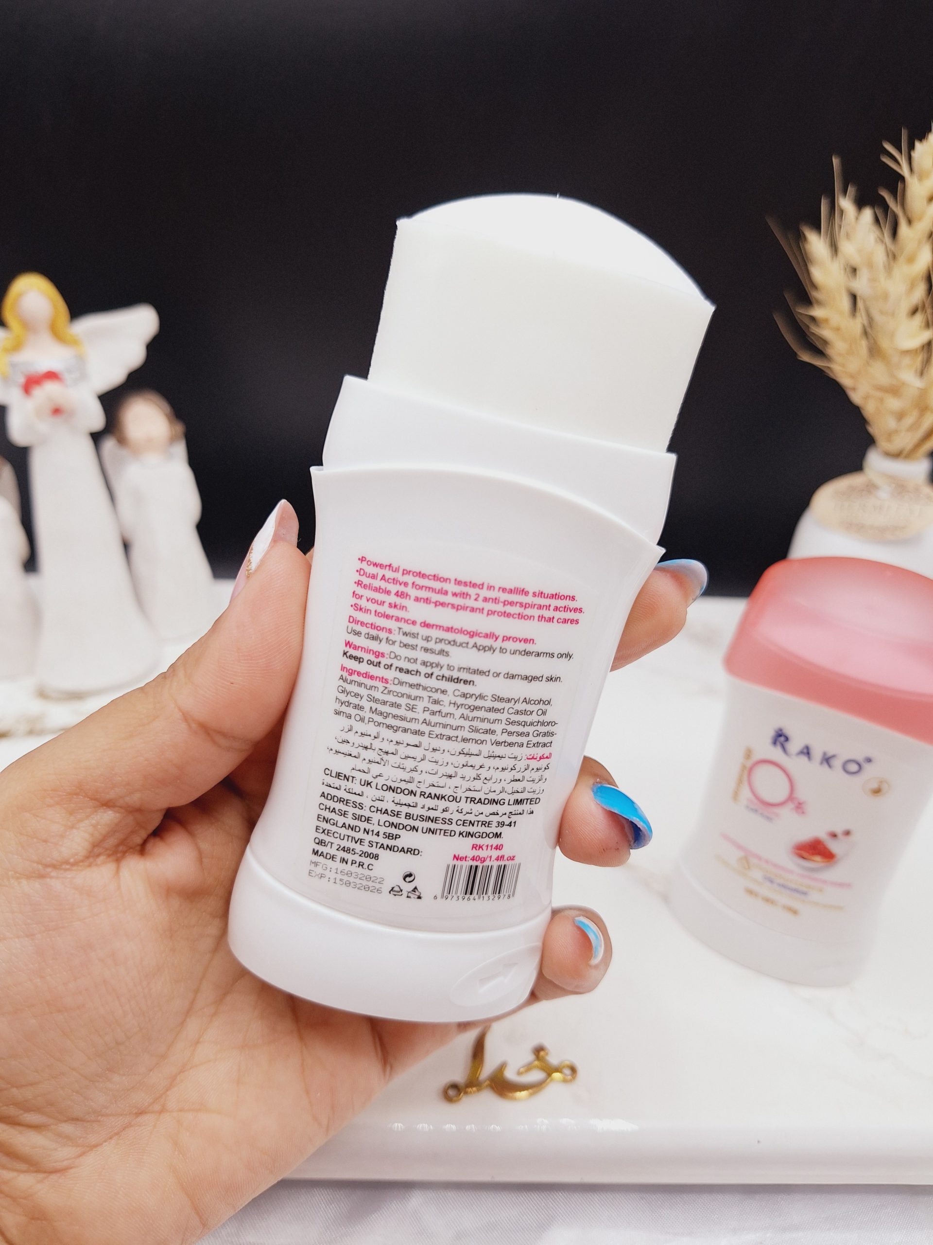 مام ضدتعریق با رایحه شیر و انار برند راکو RAKO کد RK1140 دارای عصاره انار بوده که از تعرق بیش از حد زیر بغل جلوگیری کرده و به دلیل دارا بودن مواد مغذی و مفید سبب آبرسانی و هیدراته کردن پوست زیر بغل شده و بوی بسیار خوش و دلپذیر ایجاد خواهد کرد. این محصول مناسب آن دسته از افرادی می باشد که در طول شبانه روز زیاد عرق می کنند زیرا این استیک هیچگونه لکه زرد رنگ و اثری از خود روی لباس ها برجای نذاشته و به دلیل نداشتن الکل و مواد شیمیایی مضر، هیچگونه حساسیتی برای پوست ایجاد نخواهد کرد این دئودورانت دارای ماندگاری ۴۸ ساعته بوده و دارای ۲۵ درصد مرطوب کننده نیز می باشد.