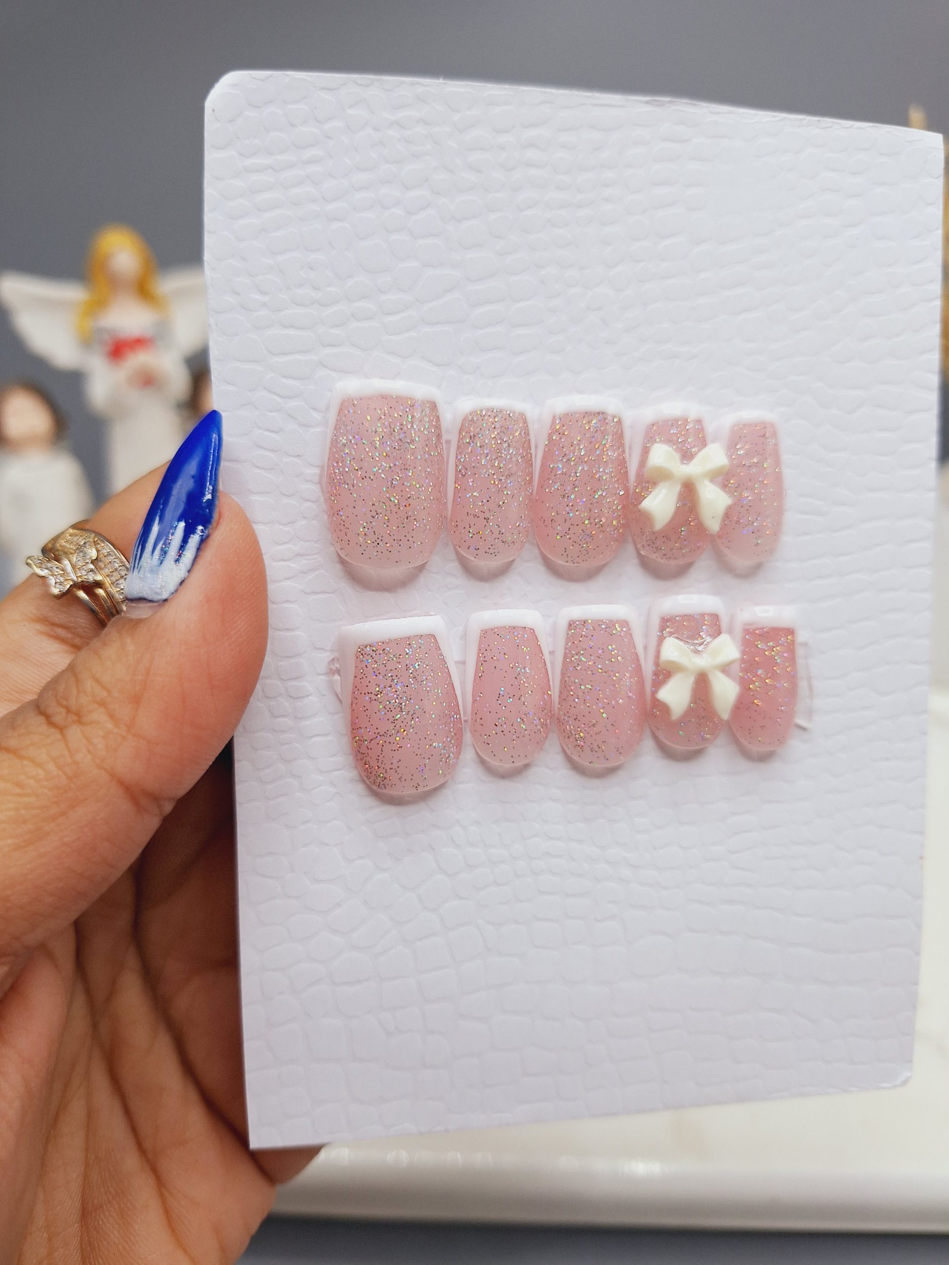 ناخن مصنوعی با مواد کاشت درجه ۱ طرح فرنج شاین دار با پاپیون (به همراه پک اختصاصی)