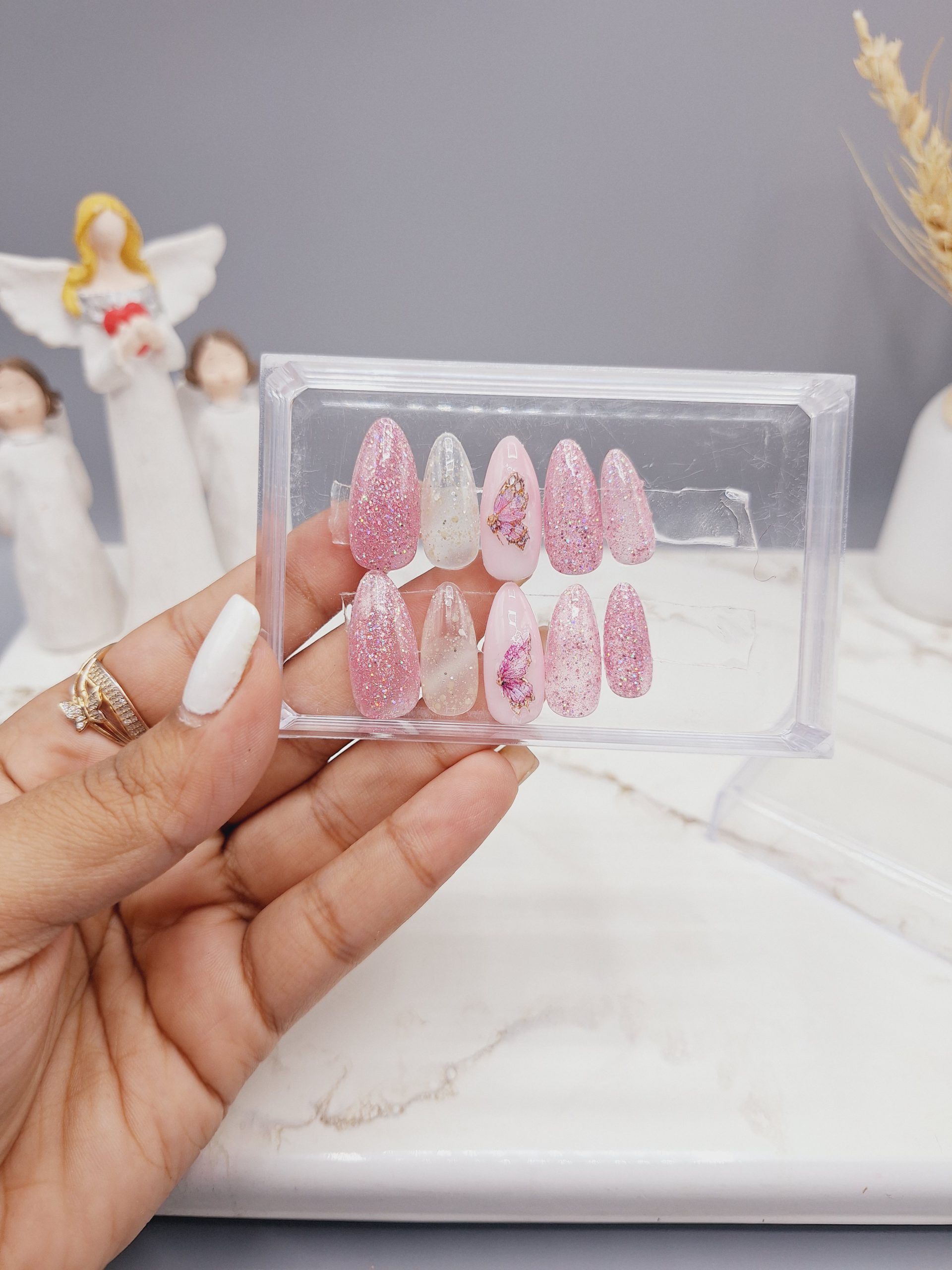 ناخن مصنوعی با مواد کاشت درجه ۱ طرح پروانه شاین دار رنگ سفید و صورتی ملیح (به همراه پک اختصاصی)