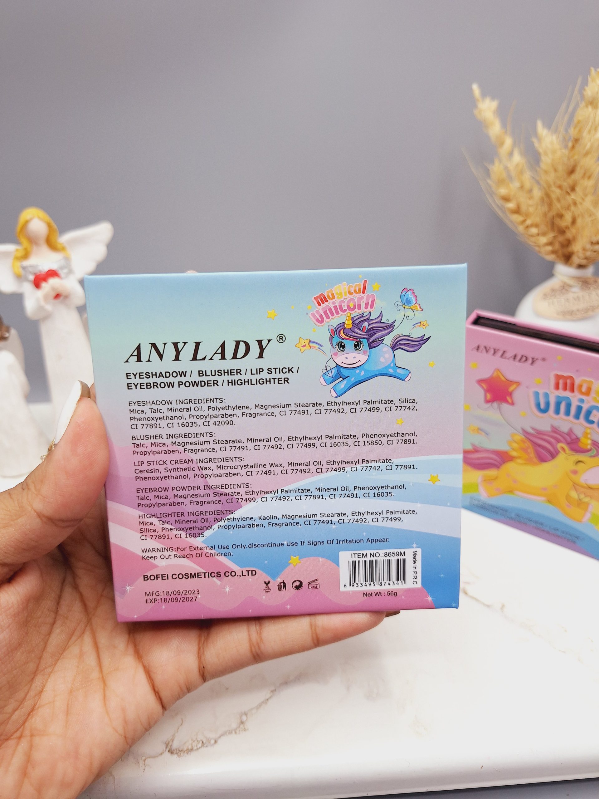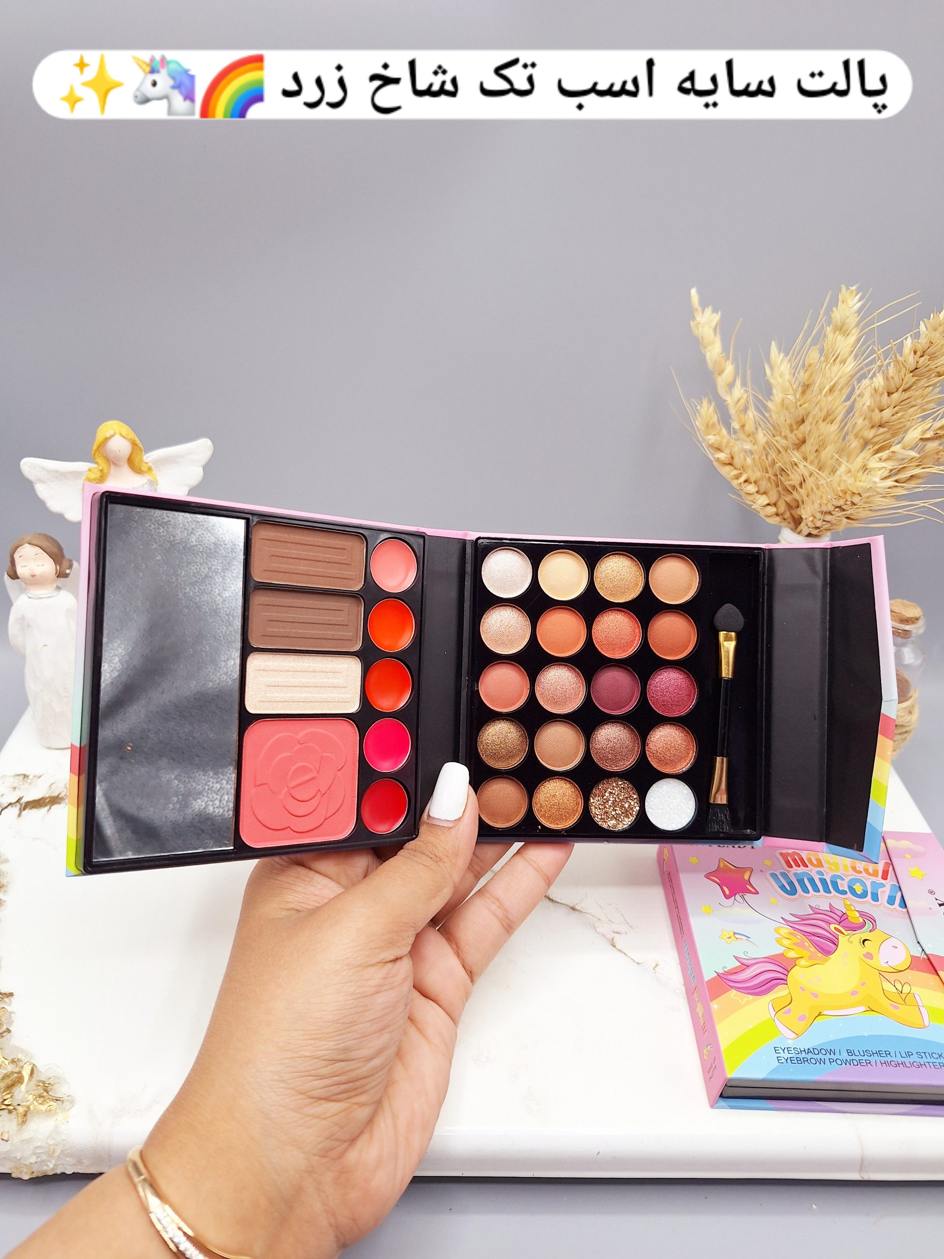 پالت سایه کیفی انی لیدی یونیکورن به صورت مگنتی با طرح جذاب است. این پالت کتابی شامل سایه شاین و مات، رژ لب، رژگونه، هایلایتر و سایه ابرو است.