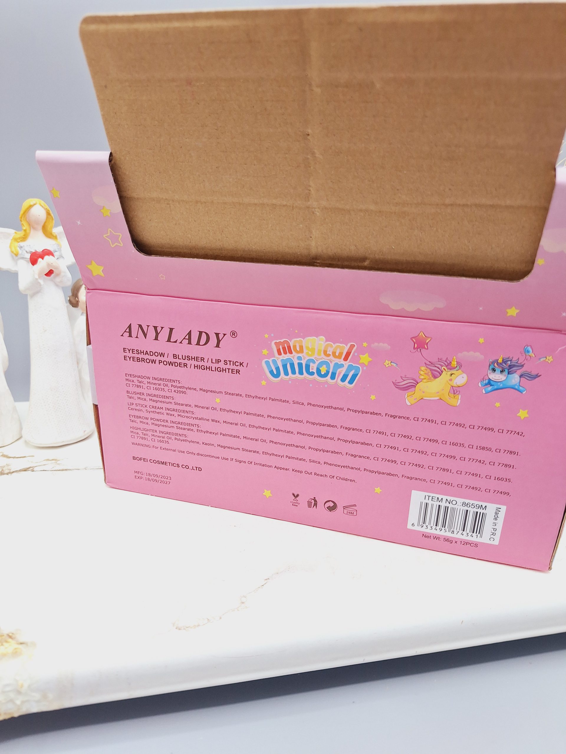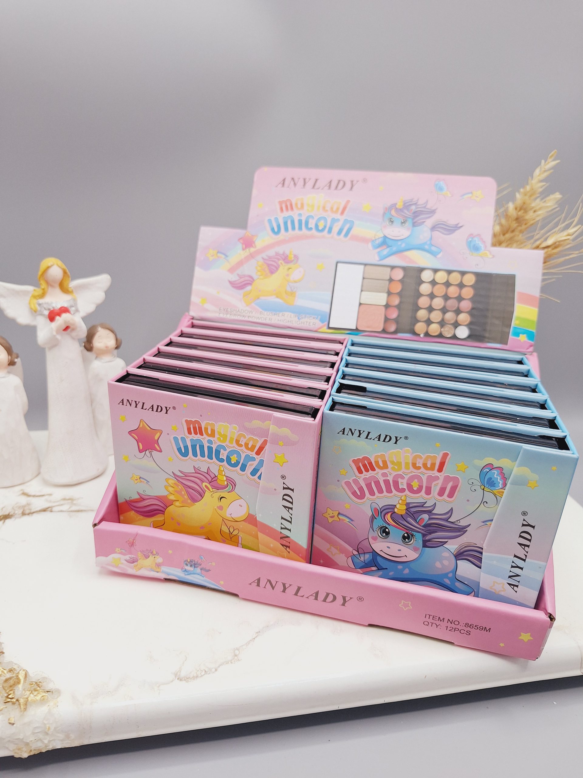 پالت طرح یونیکورن برند Anylady شامل: 3 سایه گلیتر فوق العاده + 20 رنگ سایه مات و شاین + 5 رنگ رژ لب + 1 رنگ رژگونه گلبهی + 3 رنگ کانتور روشن و تیره (قابل استفاده به عنوان پنکک و برنزر و سایه ابرو) و براش دو طرفه و آینه است.