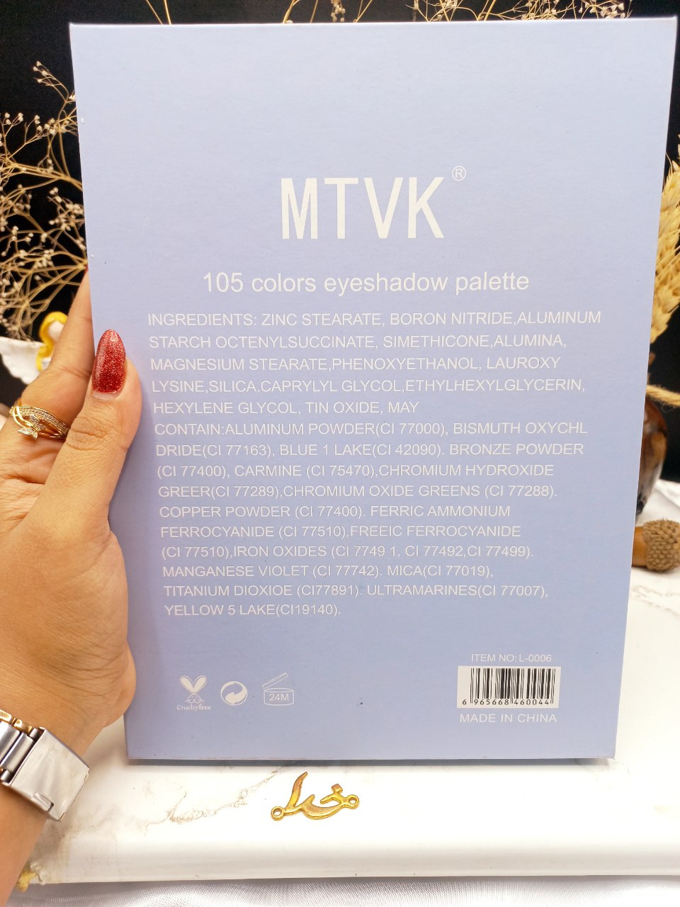 پالت سایه بسیار کاربردی ۱۰۵ رنگ برند متوک MTVK کد L_0006 بواسطه ویتامین E و خاصيت آنتی اكسيدان، از پوست نازک و حساس اطراف چشم در برابر رادیکال های آزاد محافظت می کند. رنگ دانه های قوی این محصول پوشانندگی بالایی ایجاد کرده و تا ساعت ها ماندگار می باشد. این سایه مناسب برای چشمهای حساس و افرادی که از لنز استفاده میکنند است. رنگ بندی متنوع و کاربردی این پالت، برای همه رنگ های چشم و پوست قابل استفاده می باشد.