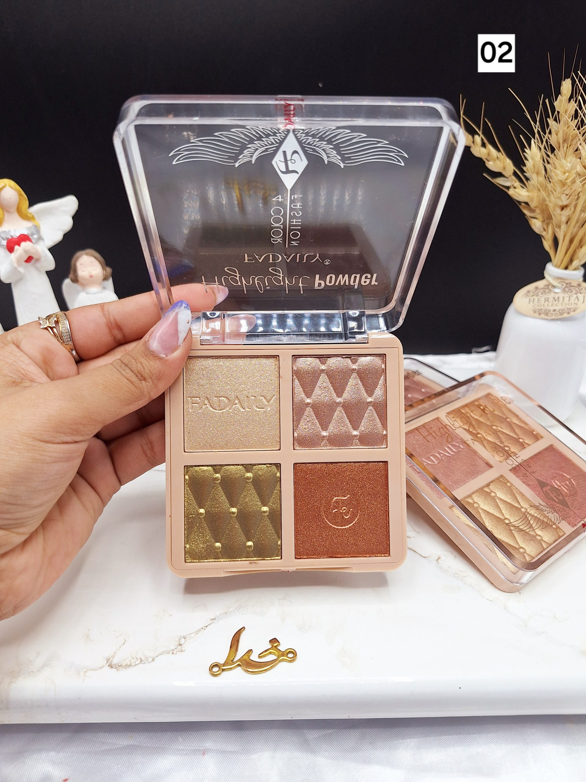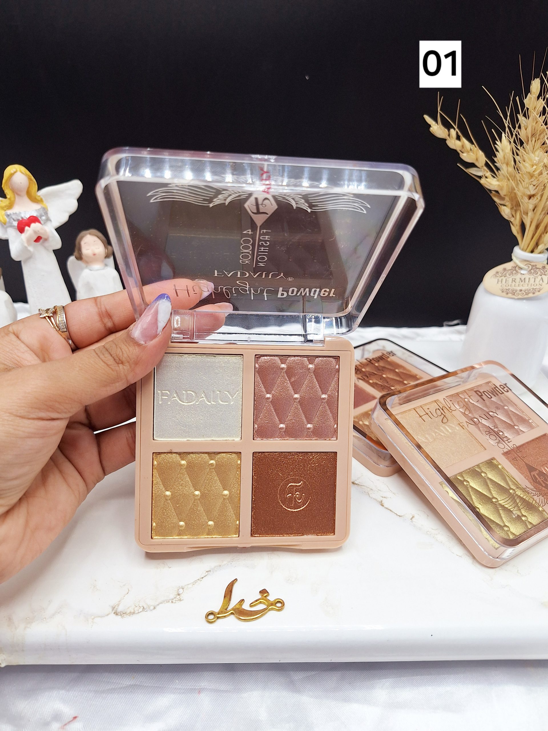 پالت هایلایتر 4 عددی 24 ساعته برند FADAILY کد FD 5051 دارای 4 رنگ کاربردی در یک پالت و طرح شمش طلا است که به راحتی روی پوست کشیده می شود. این هایلایتر صورت فوق العاده براق بوده و حاوی رنگدانه های صدفی و فرمولاسیون منعکس کننده نور است که درخششی خیره کننده به چهره می دهد. شما می توانید از هایلایتر مینی کویین برای برجسته تر کردن نواحی کمان ابرو، استخوان گونه، گوشه چشم، و تیغه بینی و هر ناحیه ی دیگر استفاده کنید.