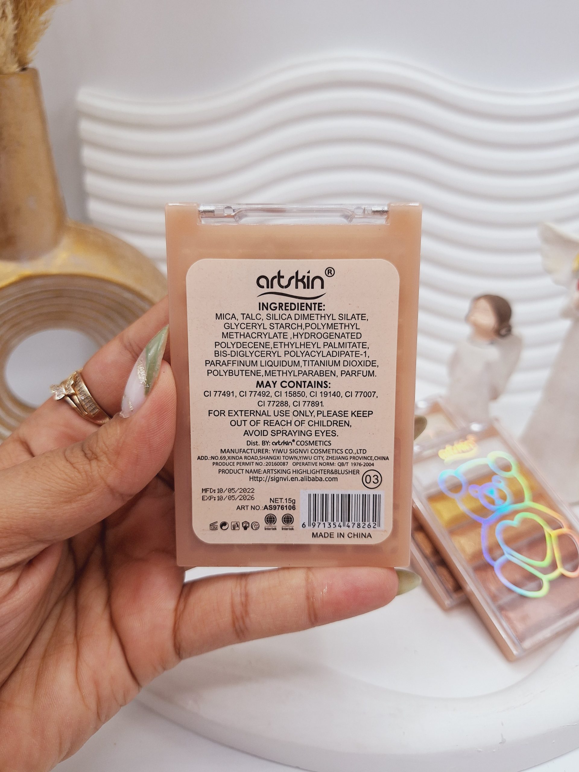 پالت سه کاره پنج رنگ خرسی آرت اسکین کد as976106 قابل استفاده به عنوان رژگونه و هایلایتر و مناسب استفاده شخصی و میکاپ آرتیست است