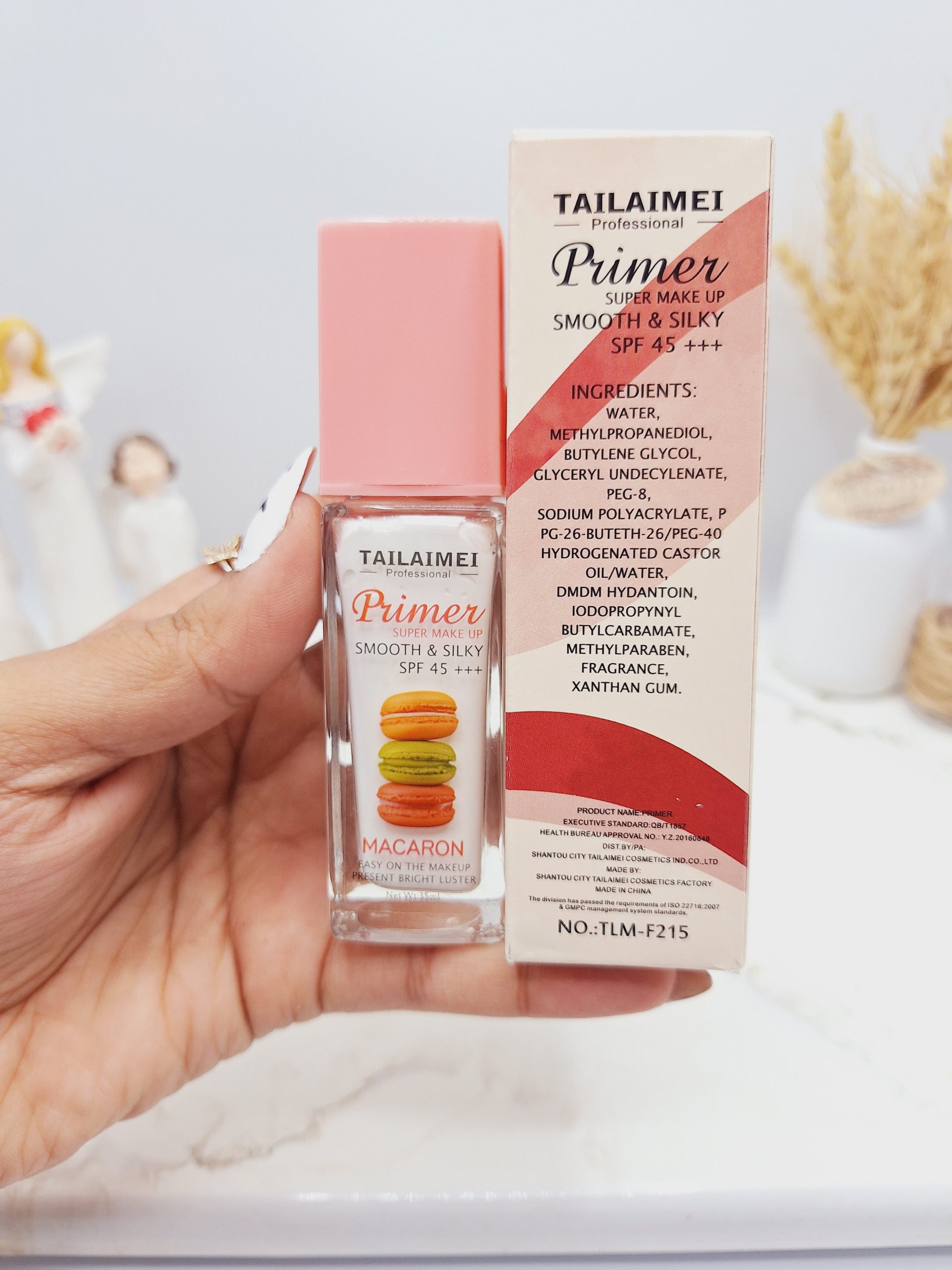 پرایمر ماکارون تایلامی با دارا بودن SPF 45 از پوست در برابر آفتاب محافظت کرده و بخوبی از چرب شدن پوست جلوگیری کرده و پوستی مات و یکدست ایجاد می‌کند. این پرایمر آبرسان و مرطوب کننده پوست است و برای طولانی مدت رطوبت را در پوست قفل نگه می‌دارد. همچنین ضدپیری است و باعث یکدست شدن پوست و پوشاندن منافذ می‌شود.